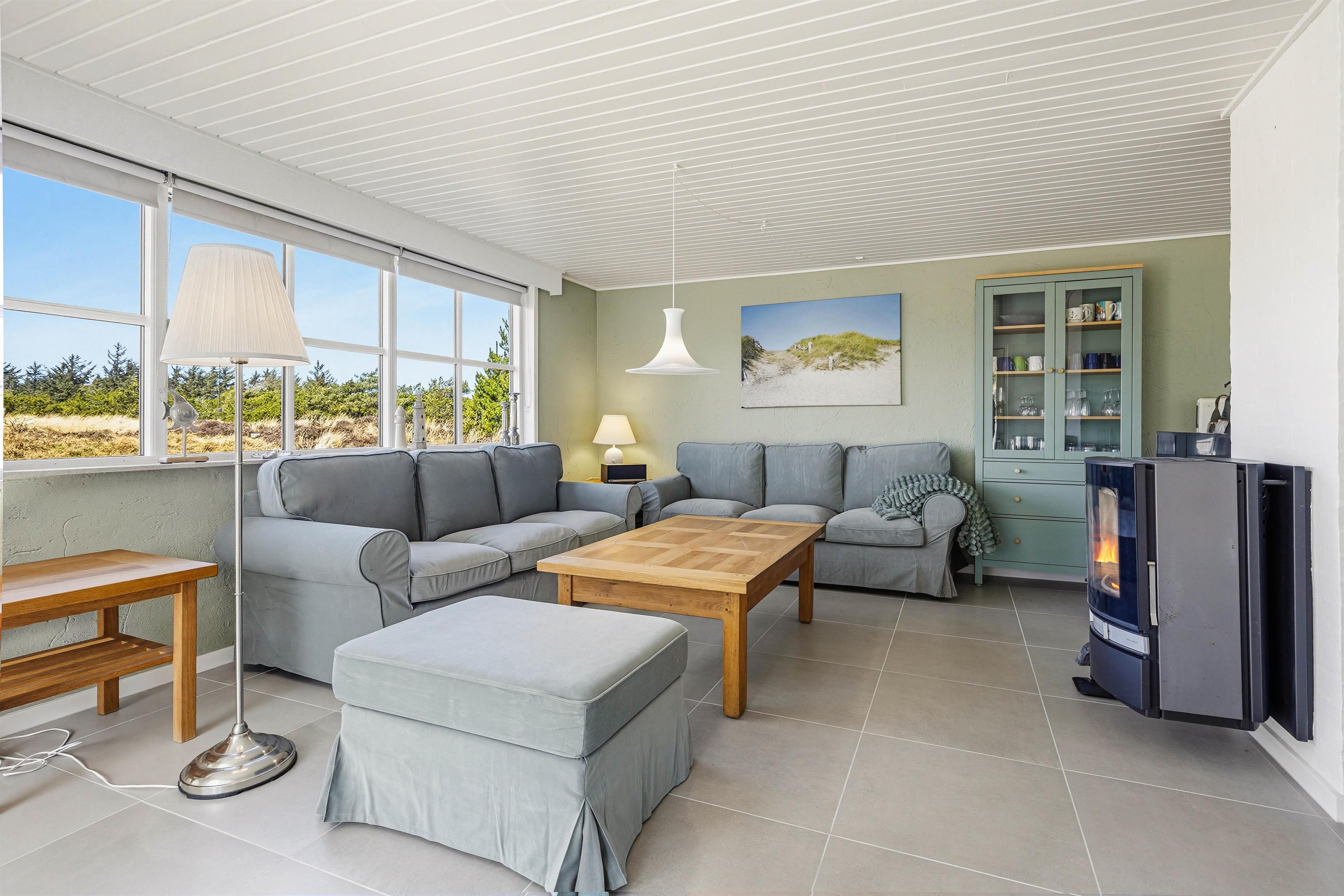 I opholdsrummet kan I samles til hyggelige feriestunder med hele familien, og imens sørger brændeovnen for at fuldende feriestemningen med sin knitren og varme. Udover brændeovnen er der også en varmepumpe i feriehuset, der sørger for et godt indeklima på energivenlig vis.
