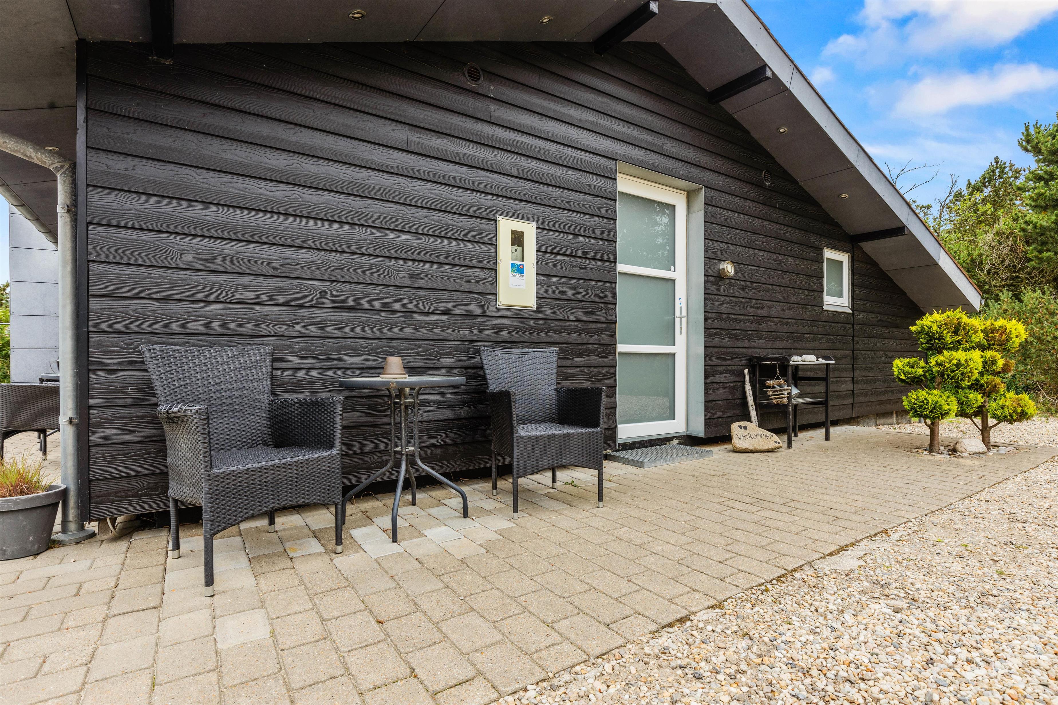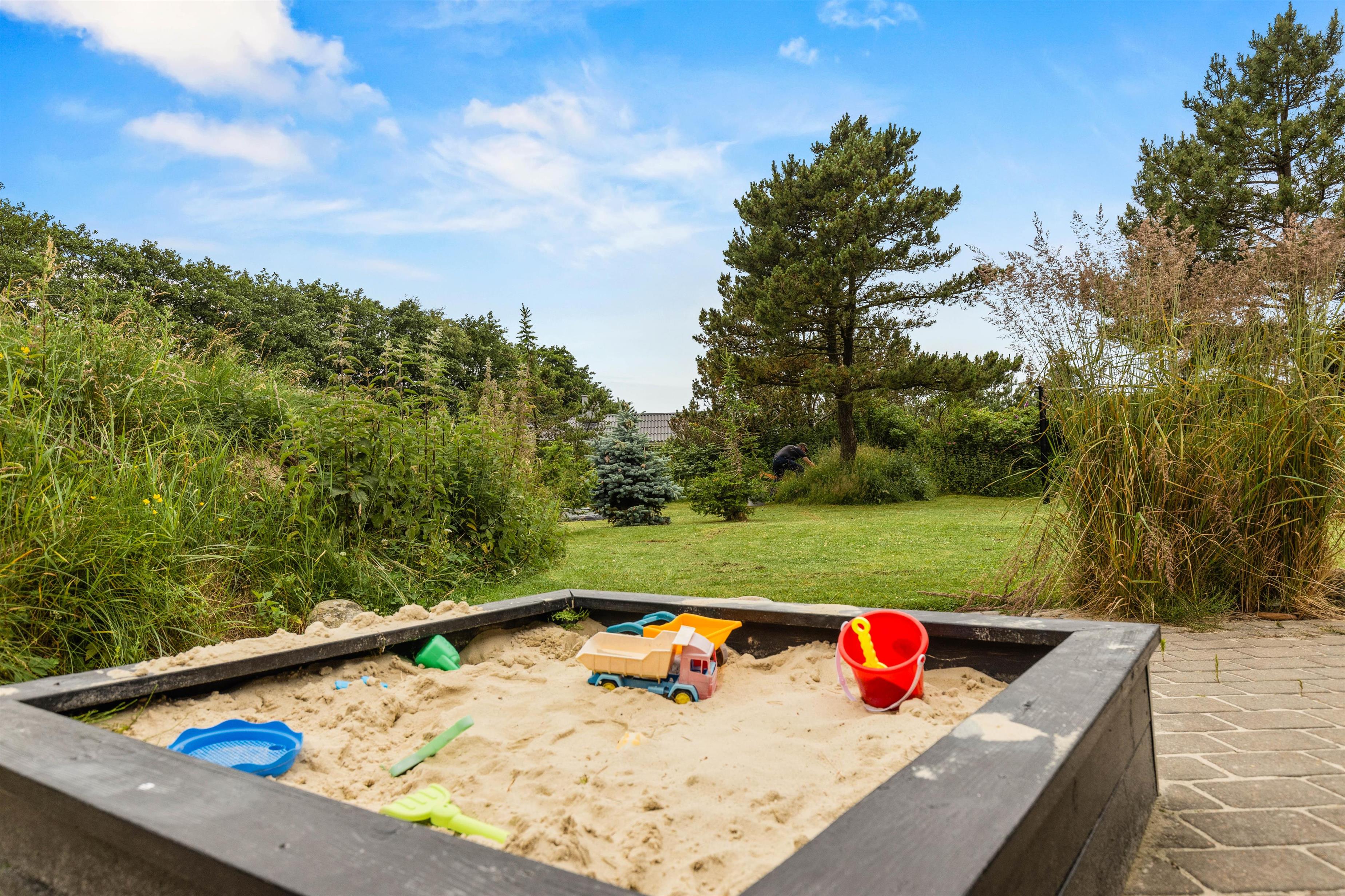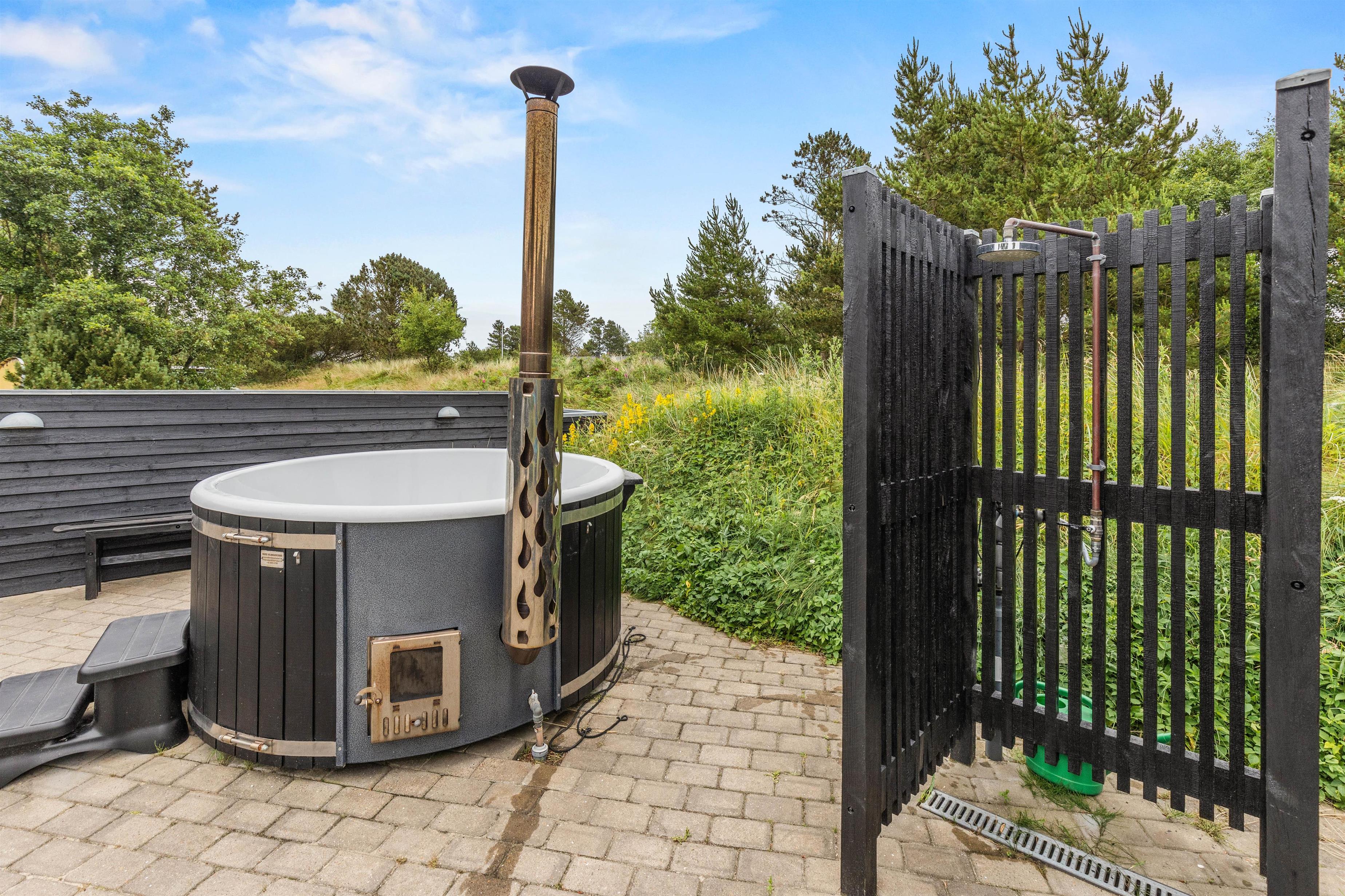 På terrassen står vildmarksbadet og den store udesauna, som begge helt sikkert vil blive et hit på ferien - ligegyldigt hvornår på året, I holder ferie. Den store græsplæne er et paradis for både børnene og hundene, og der er både gynge, sandkasse, trampolin og fodboldmål. Tag en dejlig afskylning i udebruseren, der er til rådighed fra 1. april til 31. oktober.