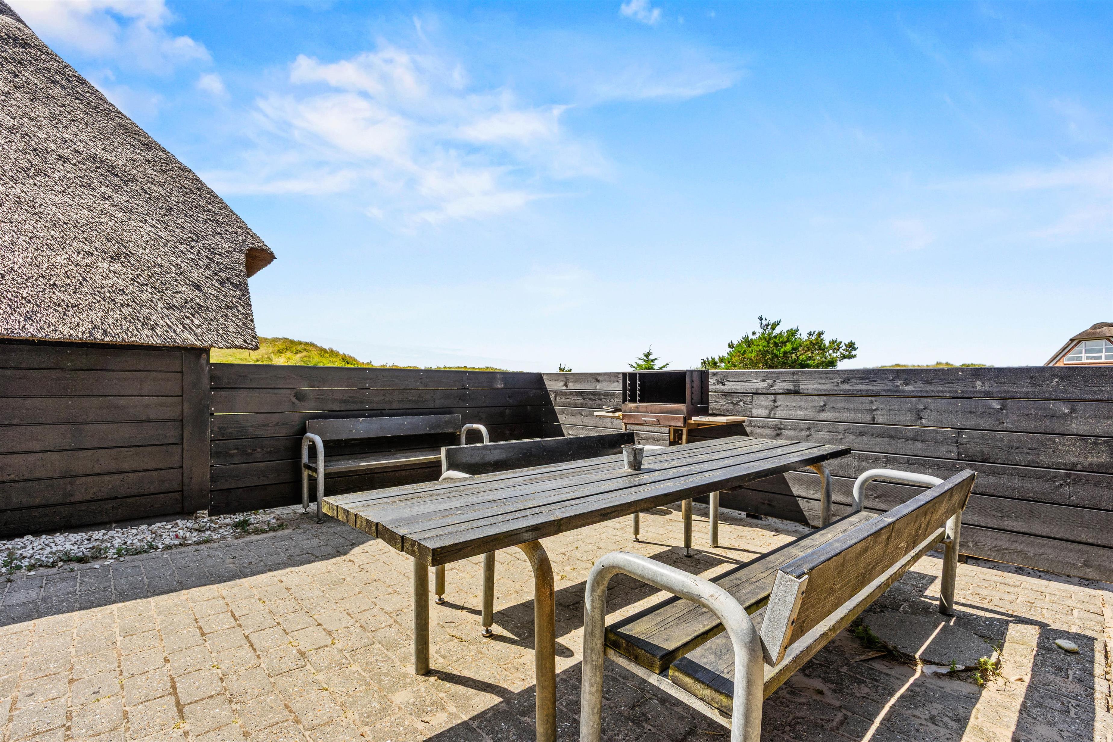 Fra sommerhuset kan I træde ud på den åbne terrasse, hvor I kan finde jer godt til rette i havemøbler og liggestole på et godt spot i solen. Mens I slapper af på terrassen, kan I nyde lyden af bølgernes brusen i baggrunden.