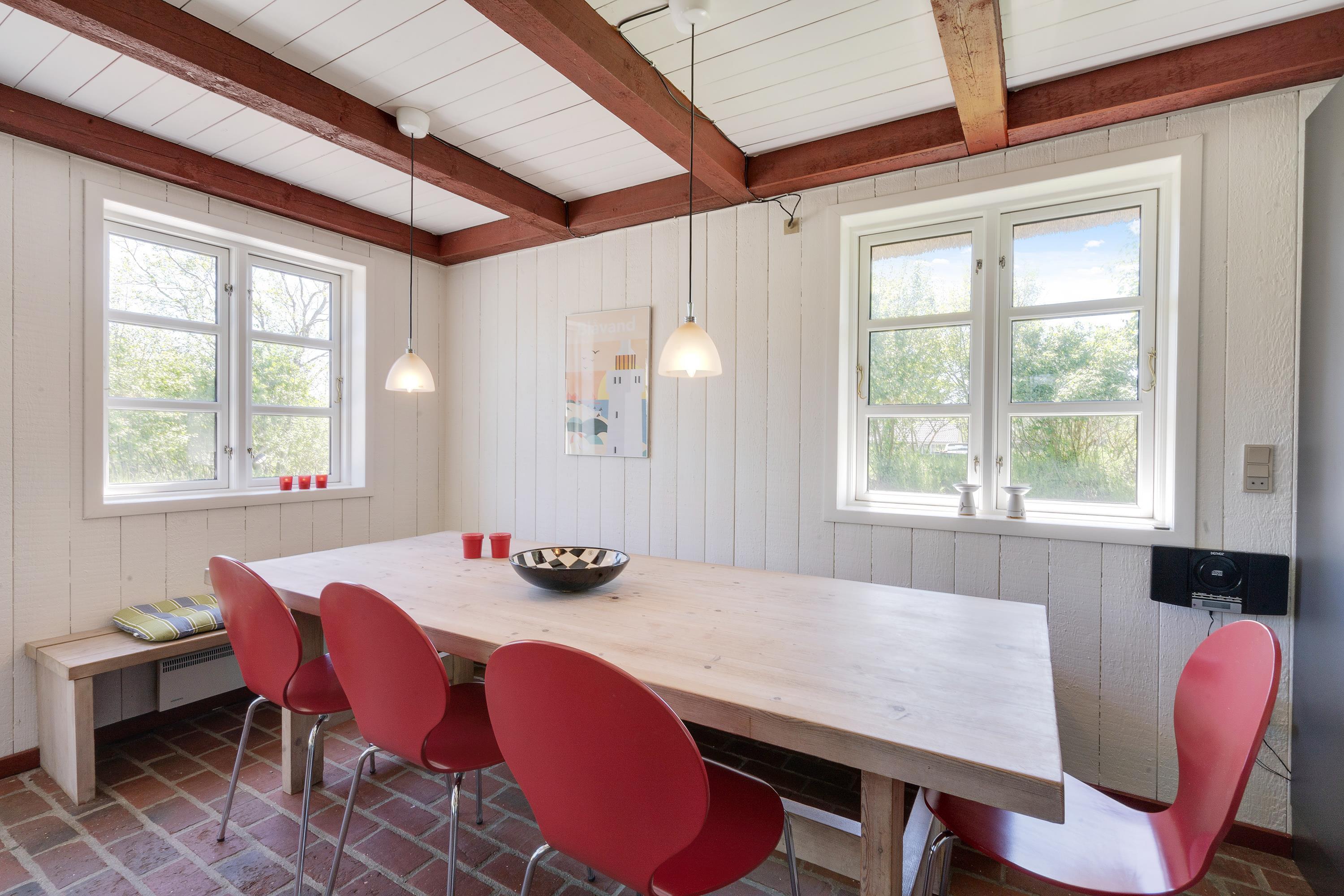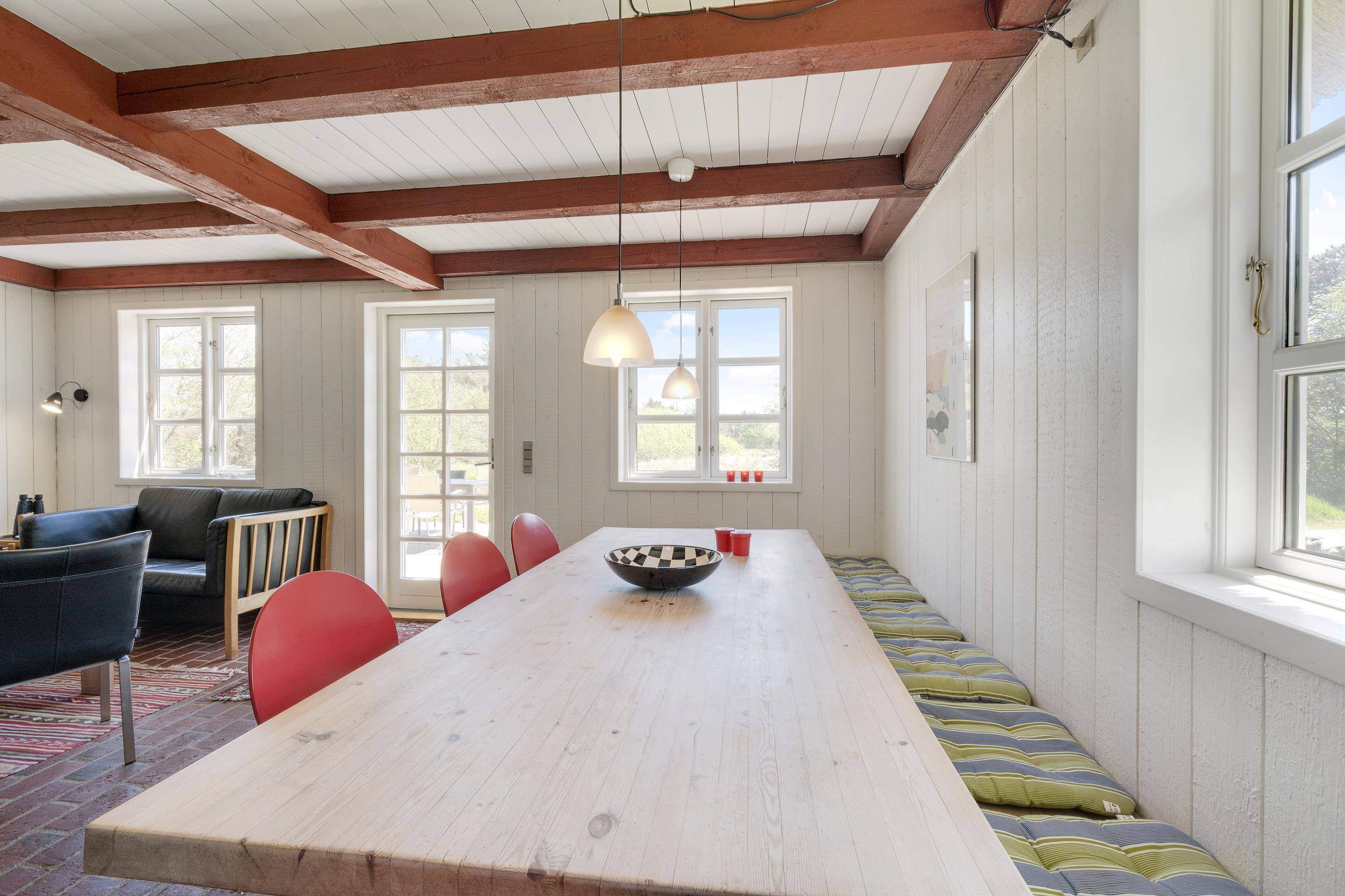 Så snart I træder inden for døren i det enkelt indrettede hus, vil I føle jer velkomme. De smukke loftbjælker og hvide vægge sørger tilsammen for feriehusstemningen, og også feriehusets brændeovn skaber en rar atmosfære.