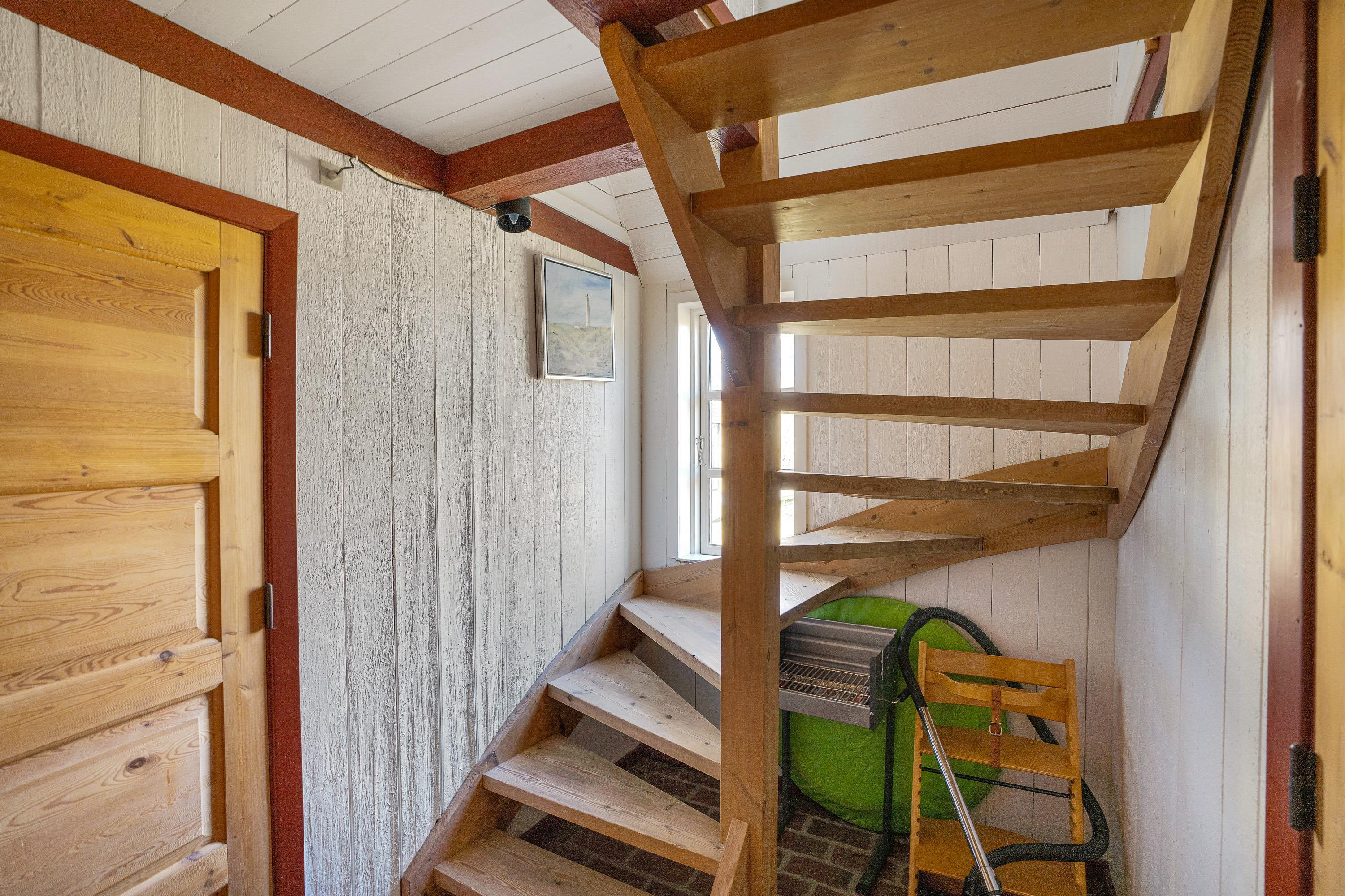 Bemærk, at trappen er uden gelænder, stejl og har begrænset loftshøjde og derfor ikke er egnet til børn og gangbesværede.