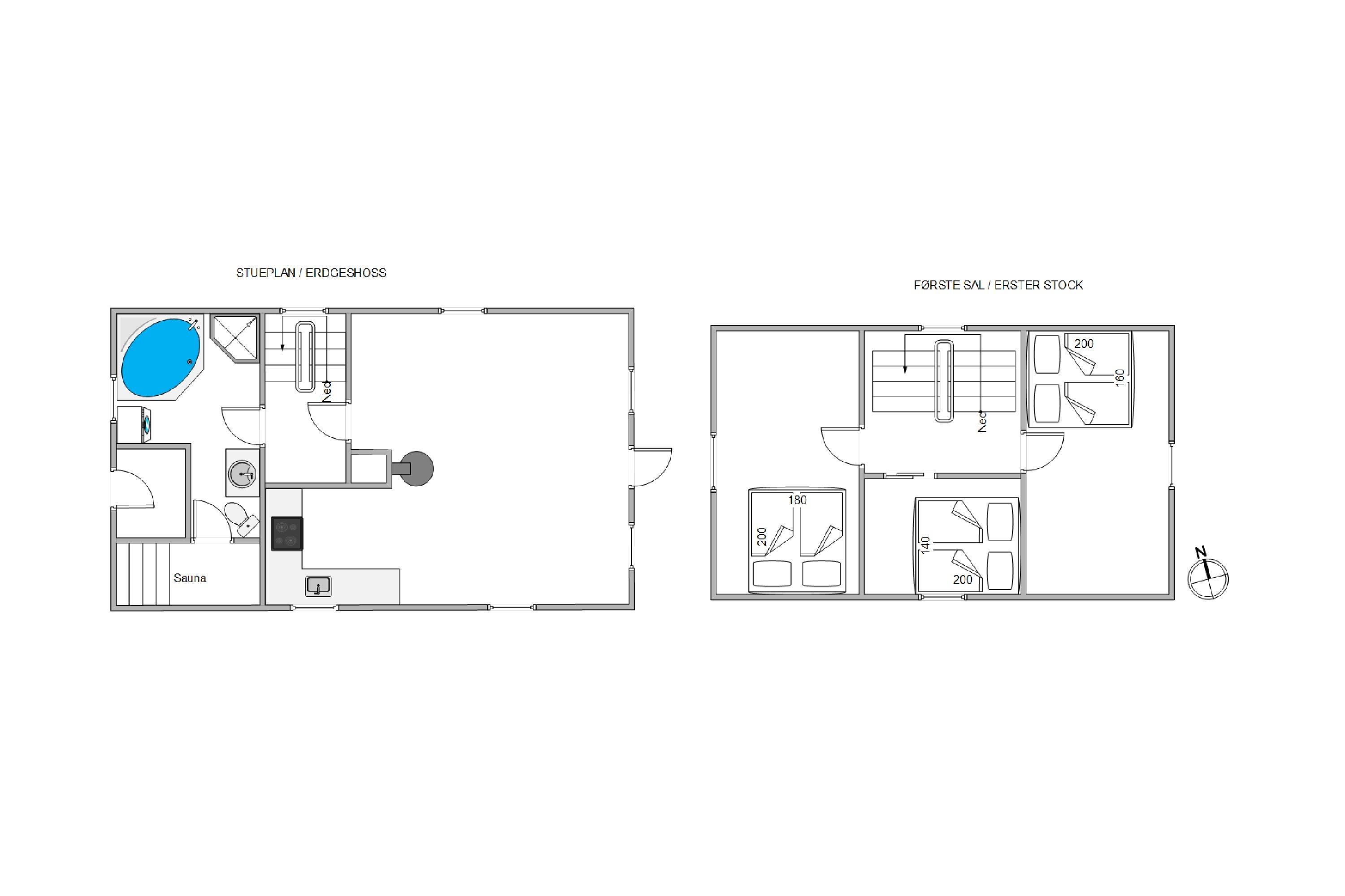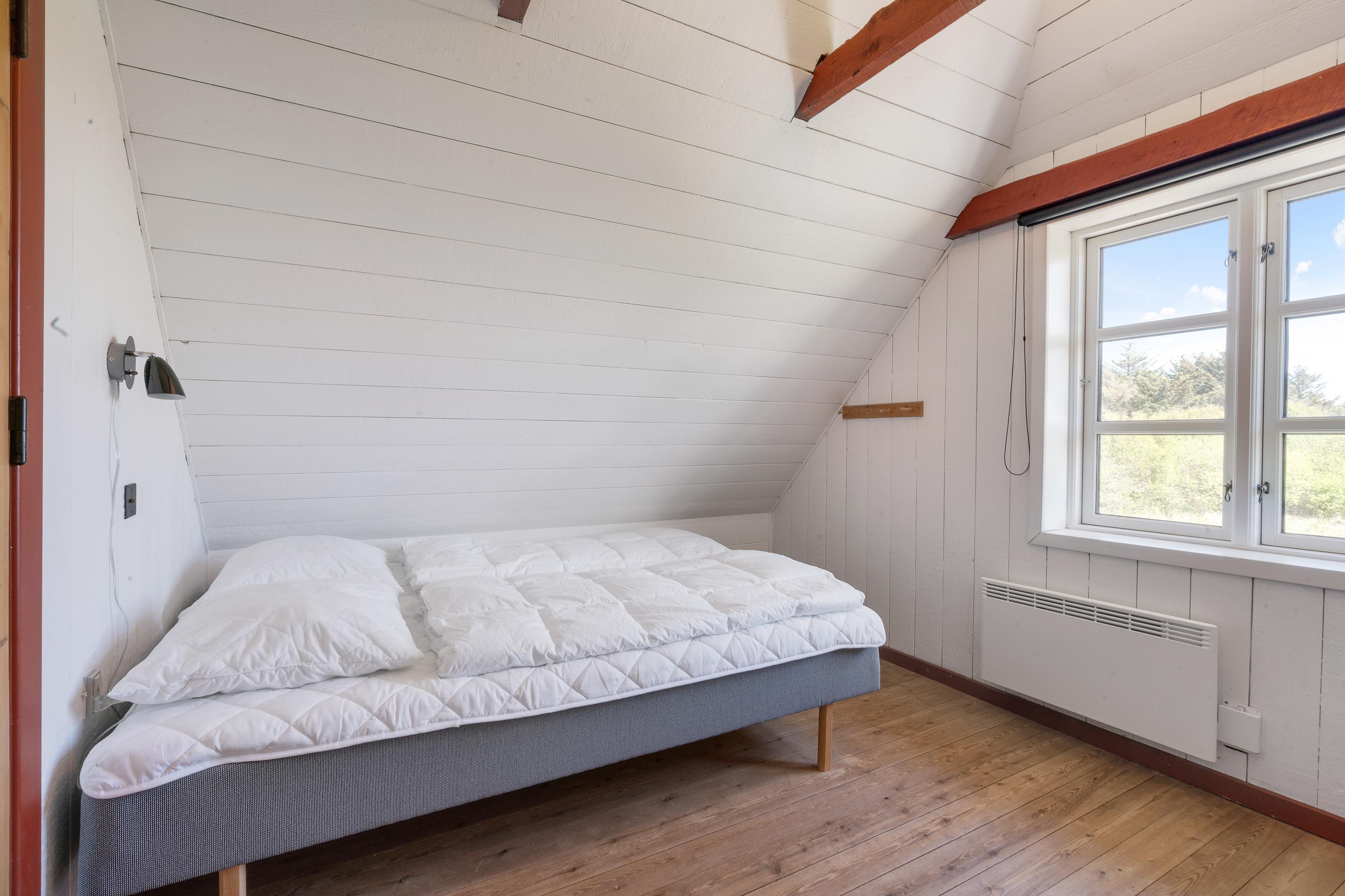 Sommerhusets indretning strækker sig over 2 etager, hvor I på 1. sal finder 2 soverum med komfortable dobbeltsenge. Her kan I trække jer tilbage og nyde en god nats søvn, inden næste feriedag byder på nye sjove aktiviteter.