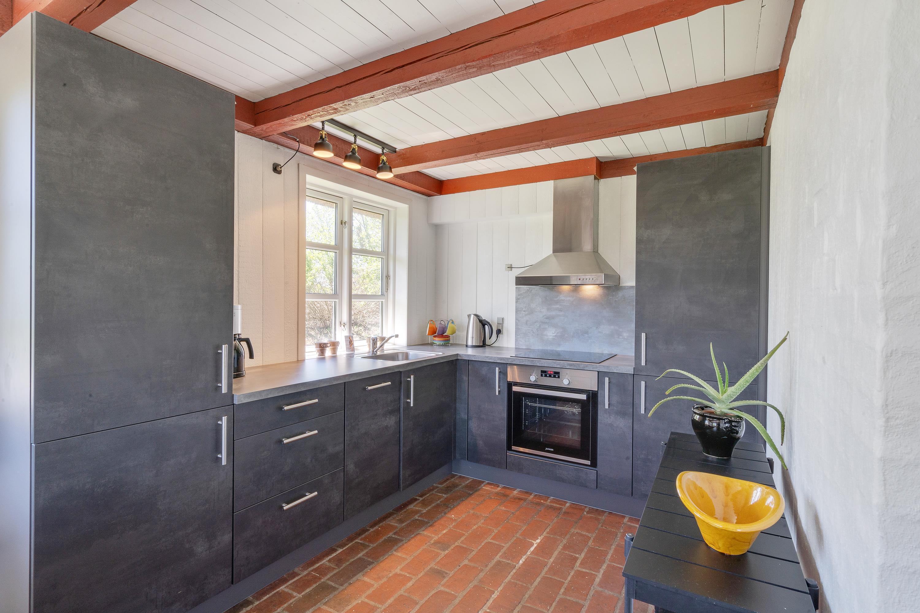Sommerhusets køkken har et rustikt klinkegulv uden gulvvarme. Her er køkken, stue og spisestue samlet i ét stort rum, hvor I kan nyde hinandens samvær. Køkkenet blev lavet i år 2020, hvorfor alle moderne detaljer er på plads, så I kan nyde at kokkerere lækker mad på jeres ferie.
