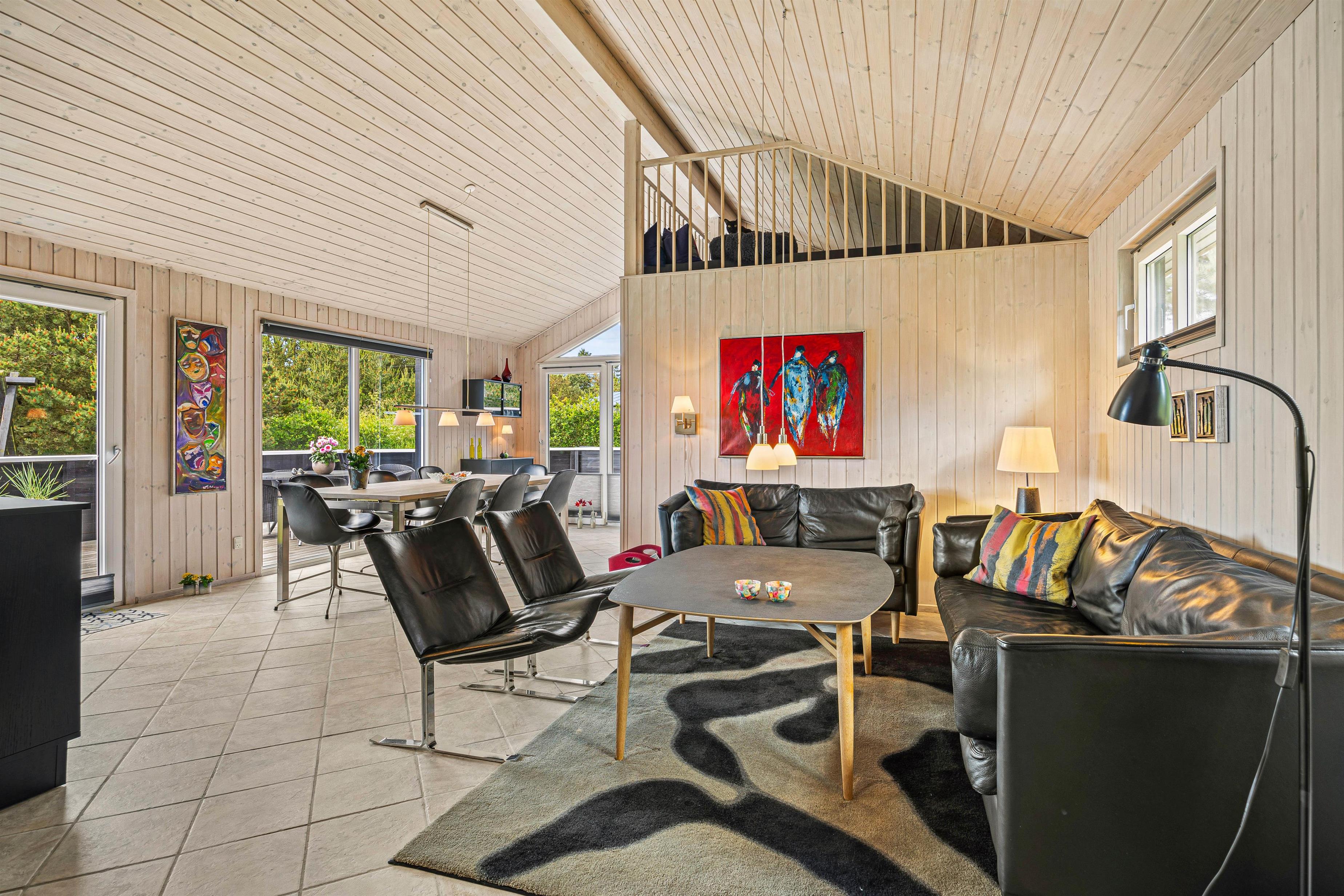 Den rummelige stue er hjertet af sommerhuset og indbyder til hyggelige stunder ved brændeovnen, hvor du kan samles med dine kære og skabe dejlige ferieminder. Fra stuen er der opgang til hemsen, hvor børnene helt sikkert vil elske at opholde sig. Den energibesparende varmepumpe sørger for et behageligt indeklima hele året rundt, og det moderne køkken er veludstyret; blandt andet med opvaskemaskine der sikrer, at I kan fokusere på mere afslapning og tid med familien.