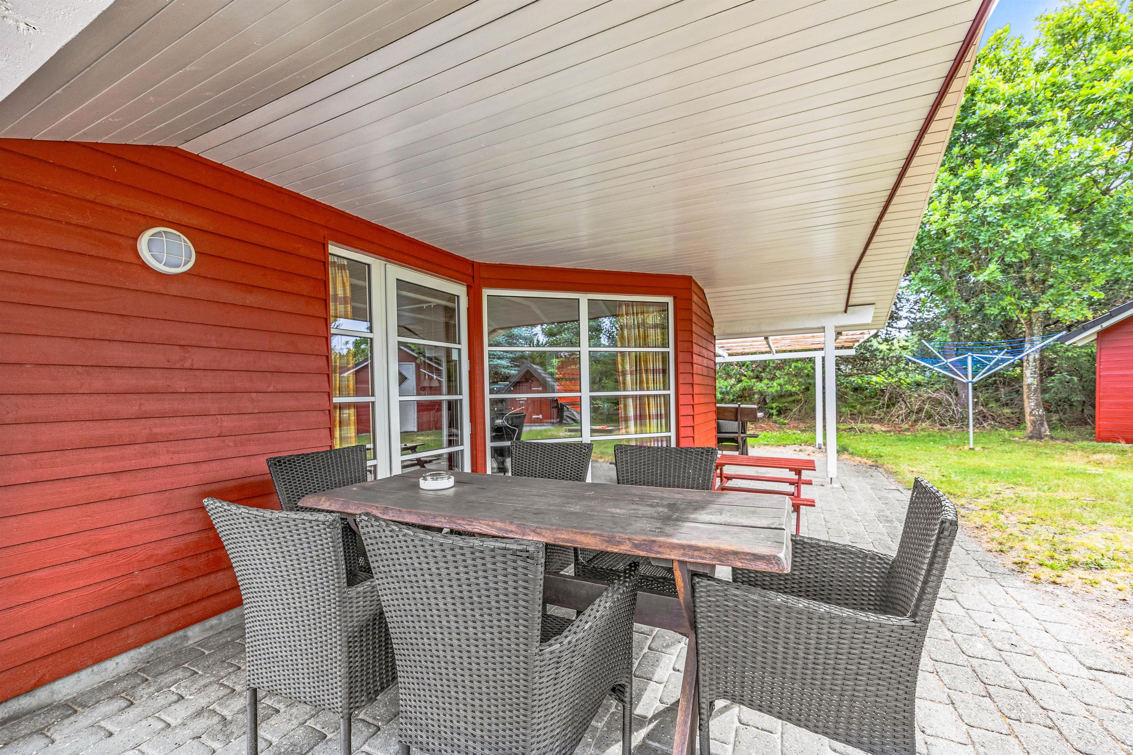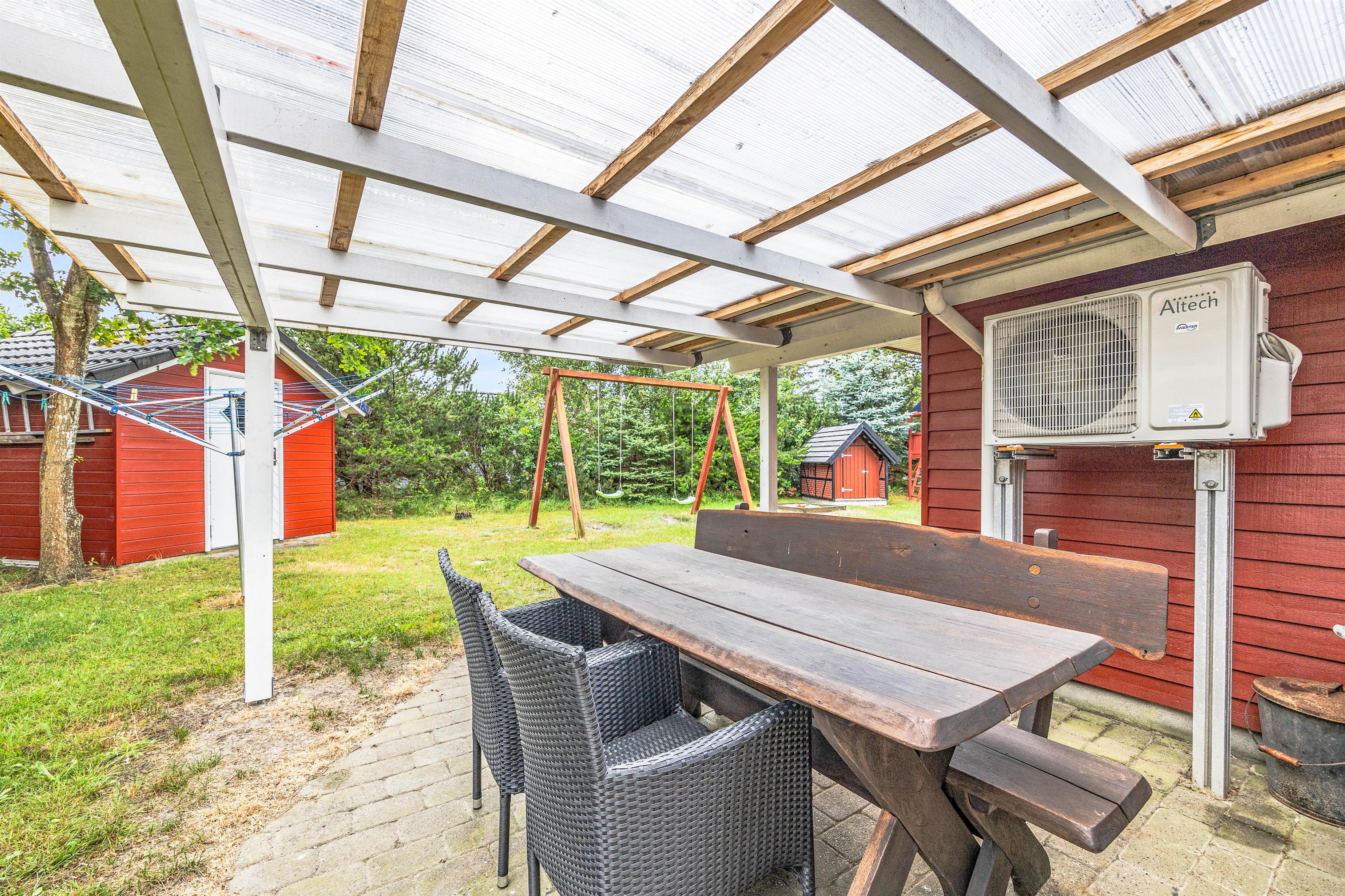 På flere af husets sider er der åbne og overdækkede terrasser med hyggelige kroge, så I altid kan finde læ for blæst og regn eller skygge på varme sommerdage. Skulle feriens kok ønske en fridag fra køkkenet, kan der laves lækker feriemad på husets grill ved den ene overdækkede terrasse.