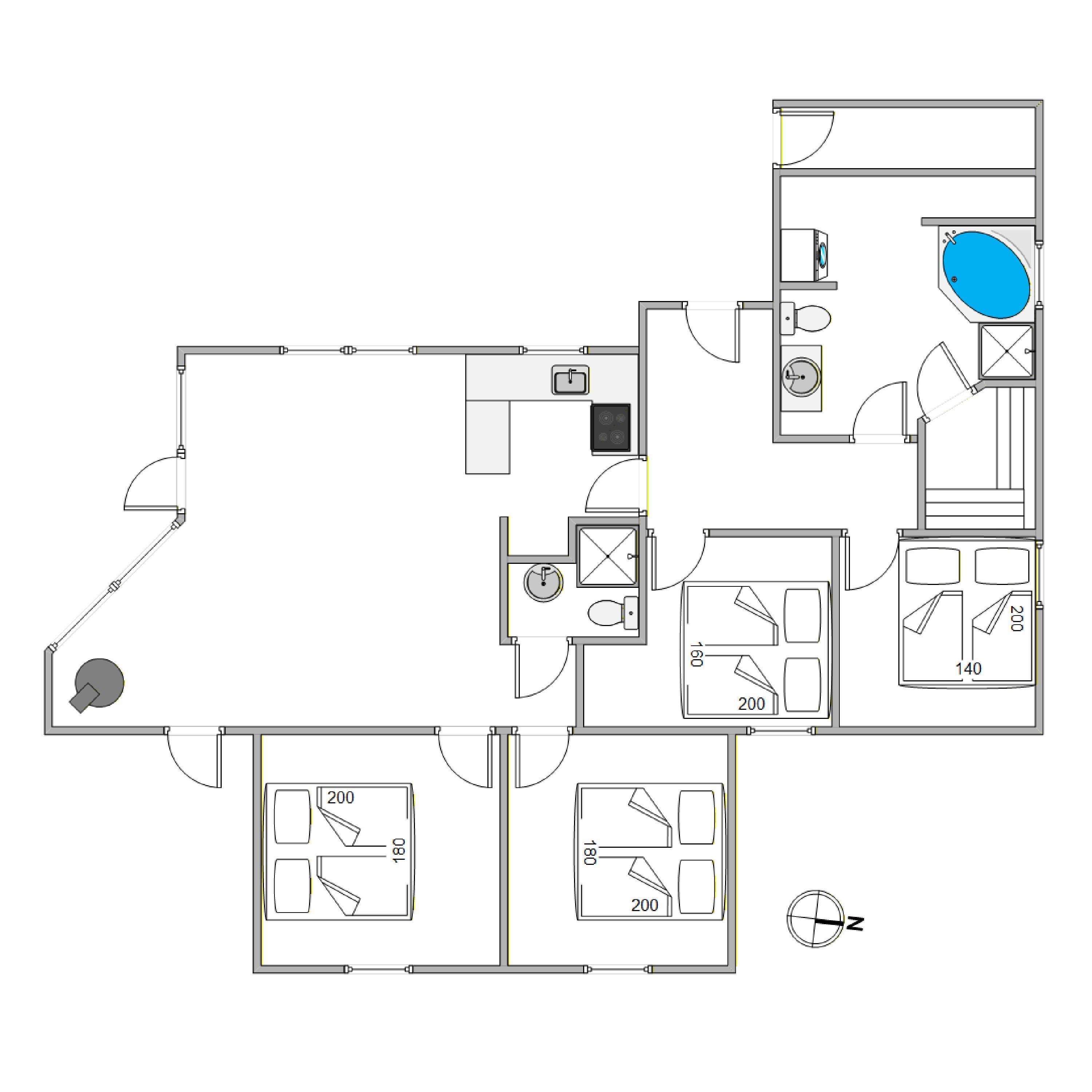 Sommerhuset har 4 soveværelser; 3 med dobbeltseng og et med enkeltsenge. Her kan alle hvile ud til lyden af havet og være klar til næste dags oplevelser. Der er 2 badeværelser med brus – det ene er nærmest en stor wellness-afdeling med en lækker 2-personers spa og sauna.