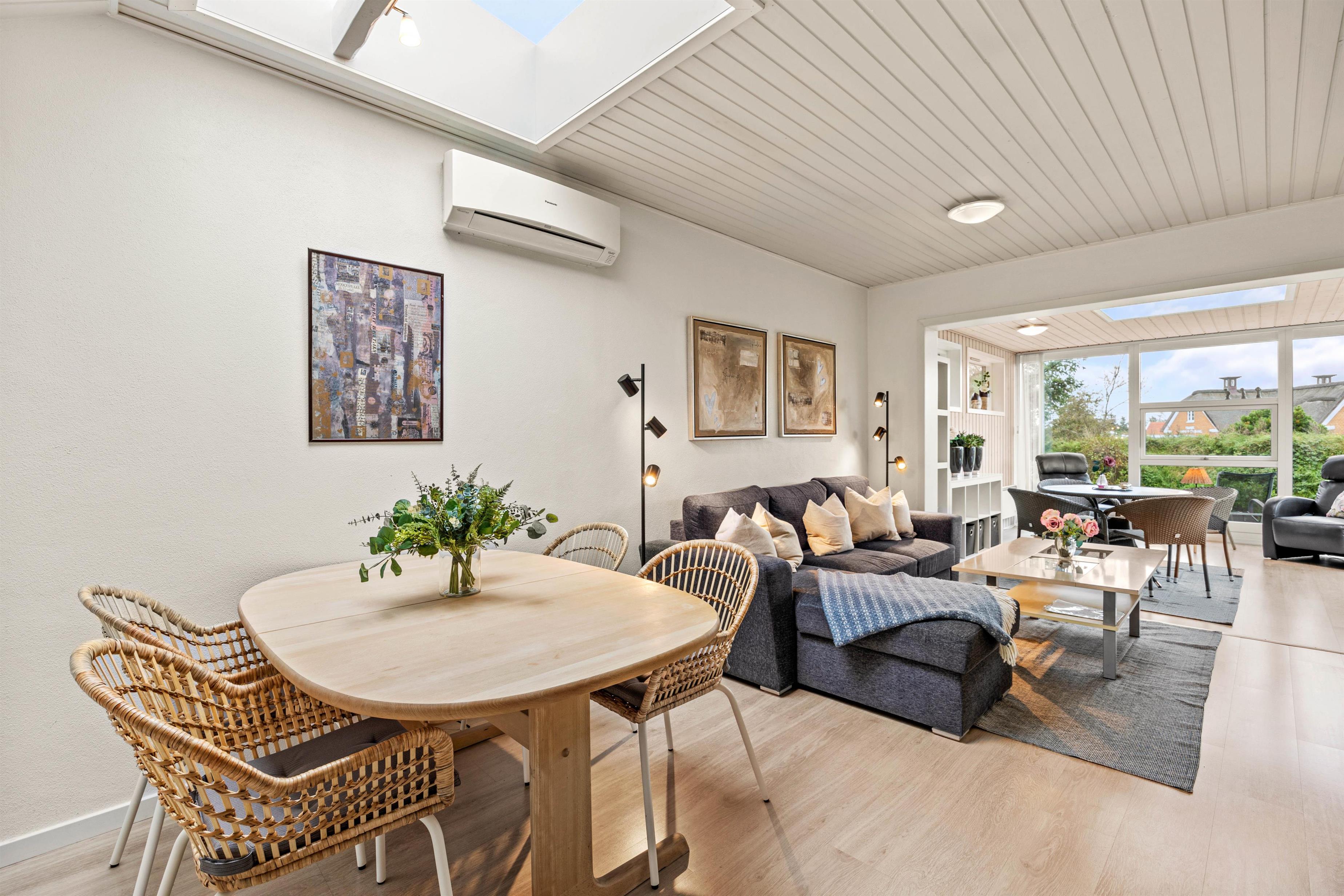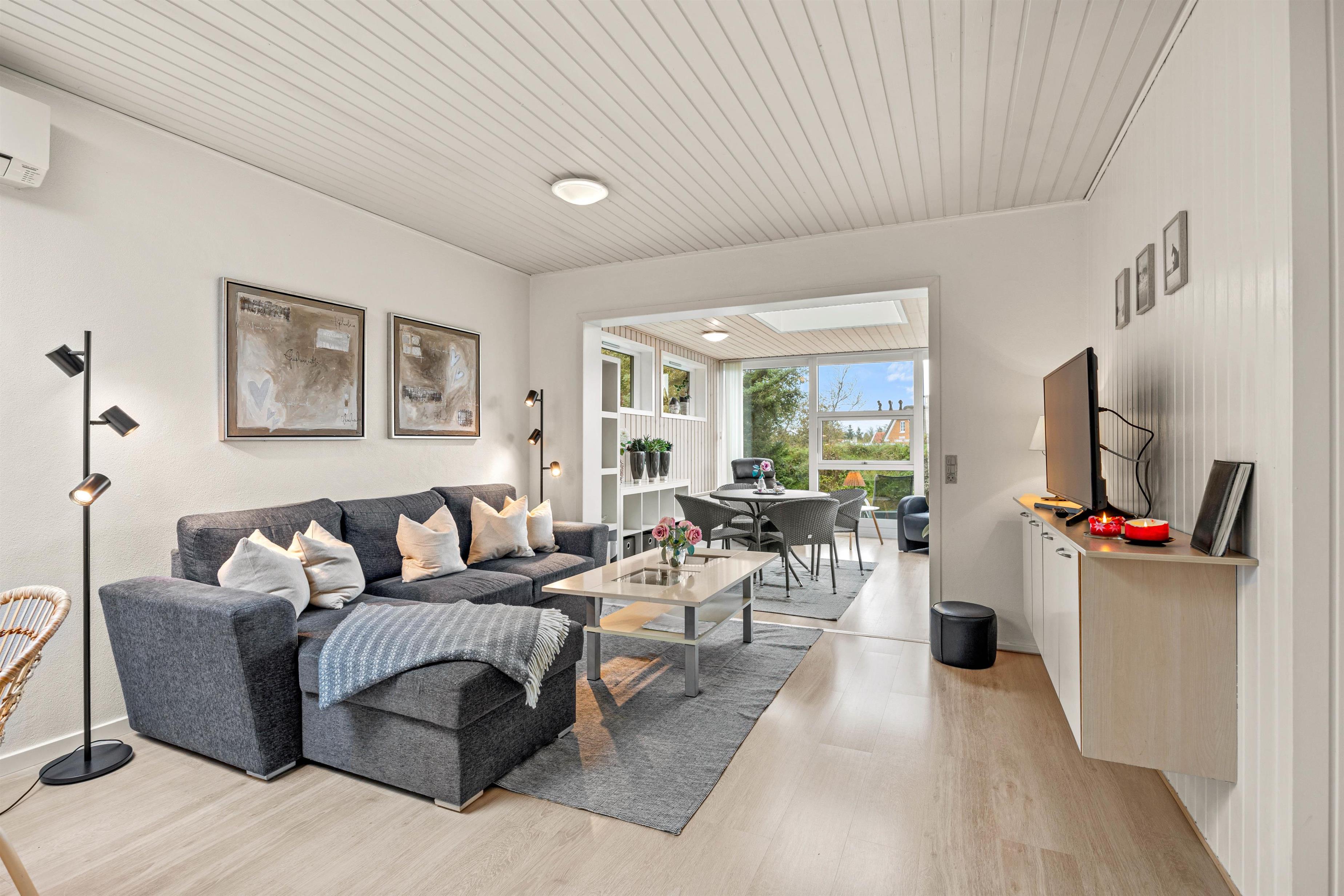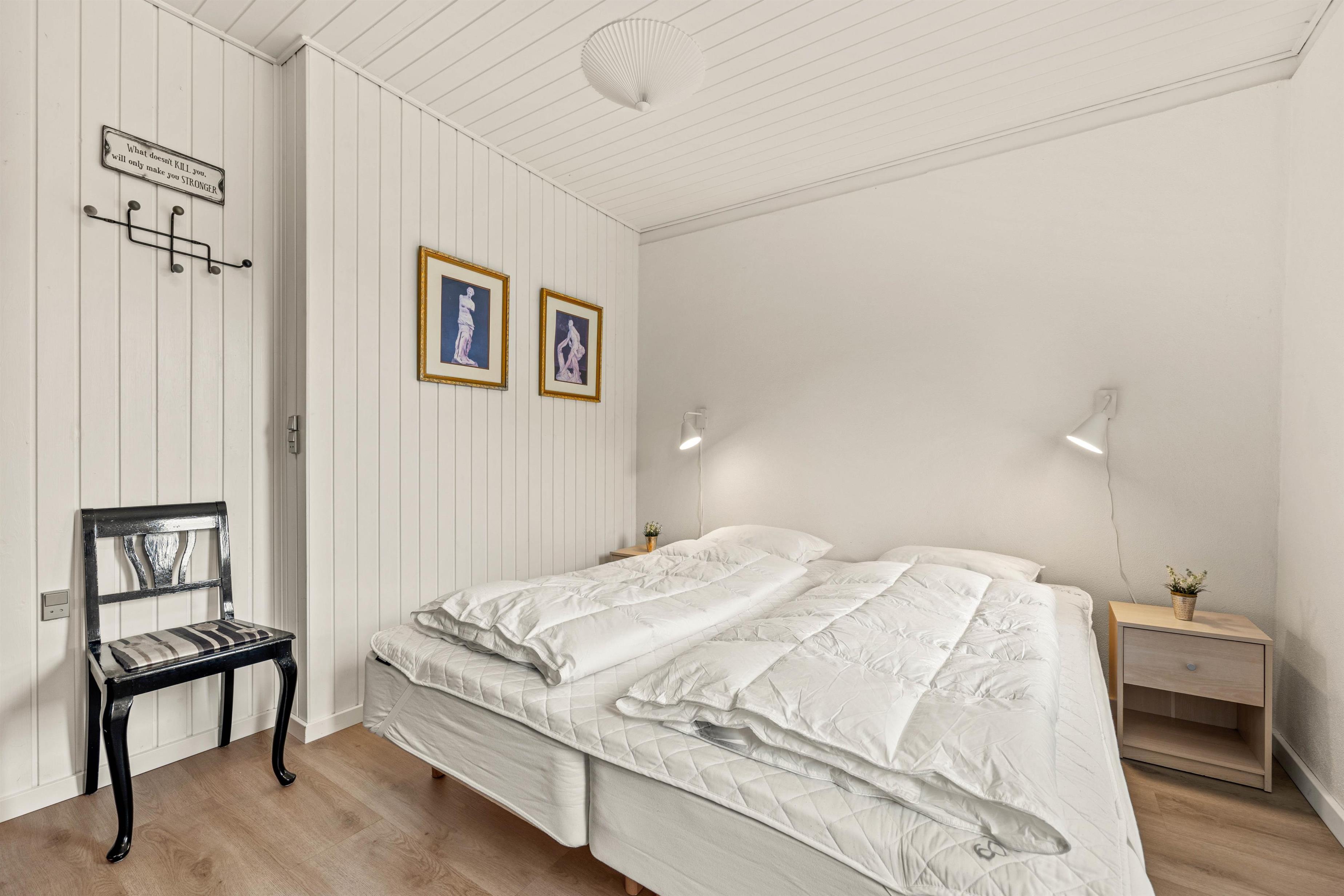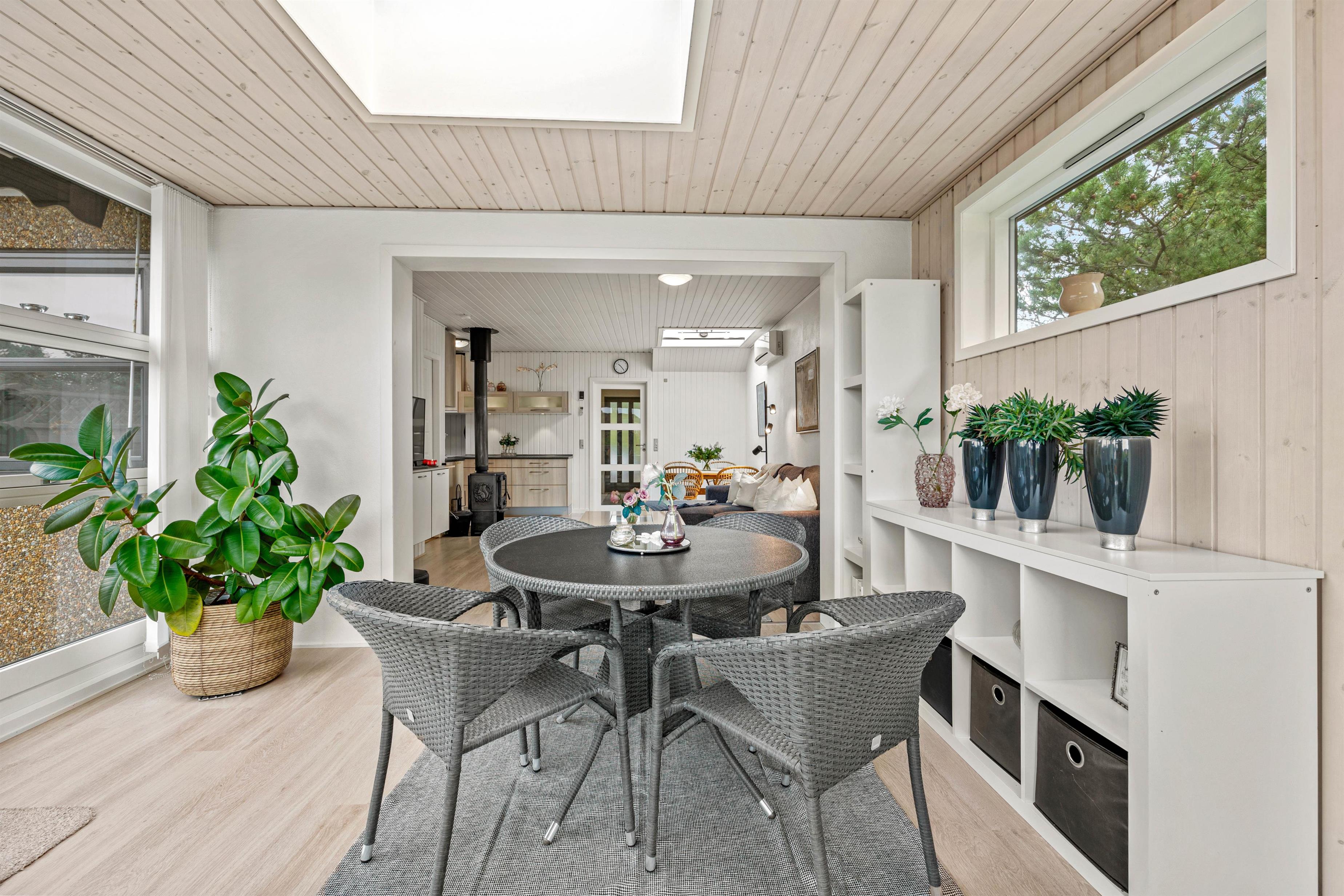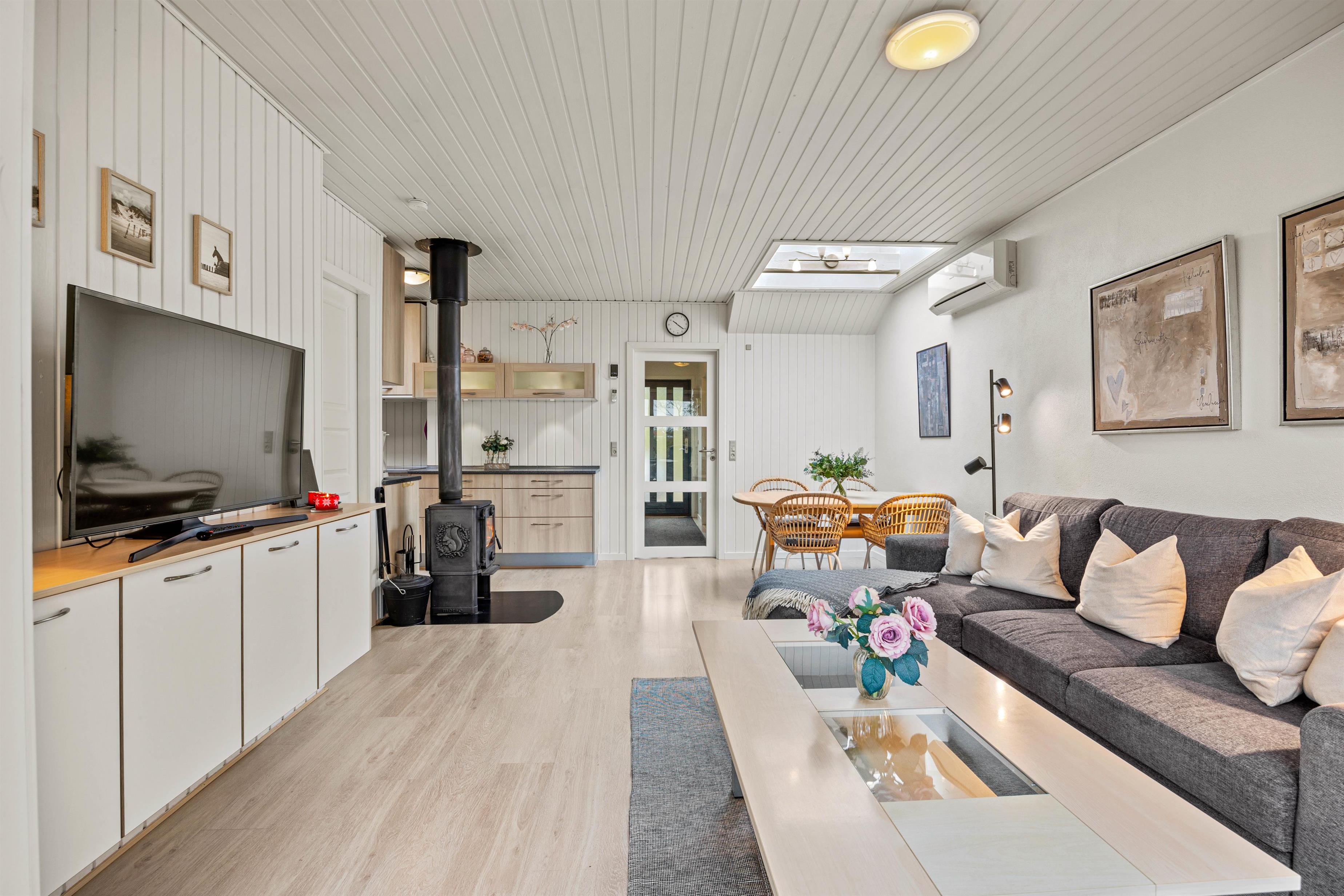 Den hyggelige og hjemlige indretning giver i det hele taget mulighed for en skøn ferie året rundt, og på de kolde dage kan I rigtig nyde tilværelsen i sofaen, mens den knitrende brændeovn fylder stuen med varme og ægte feriestemning. Huset har 2 soverum med dobbelsenge og i stuen står en sovesofa hvor 2 personer kan sove.