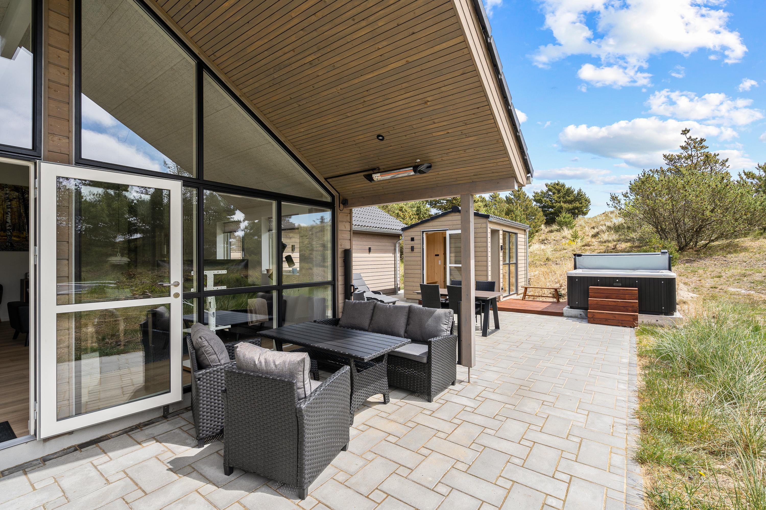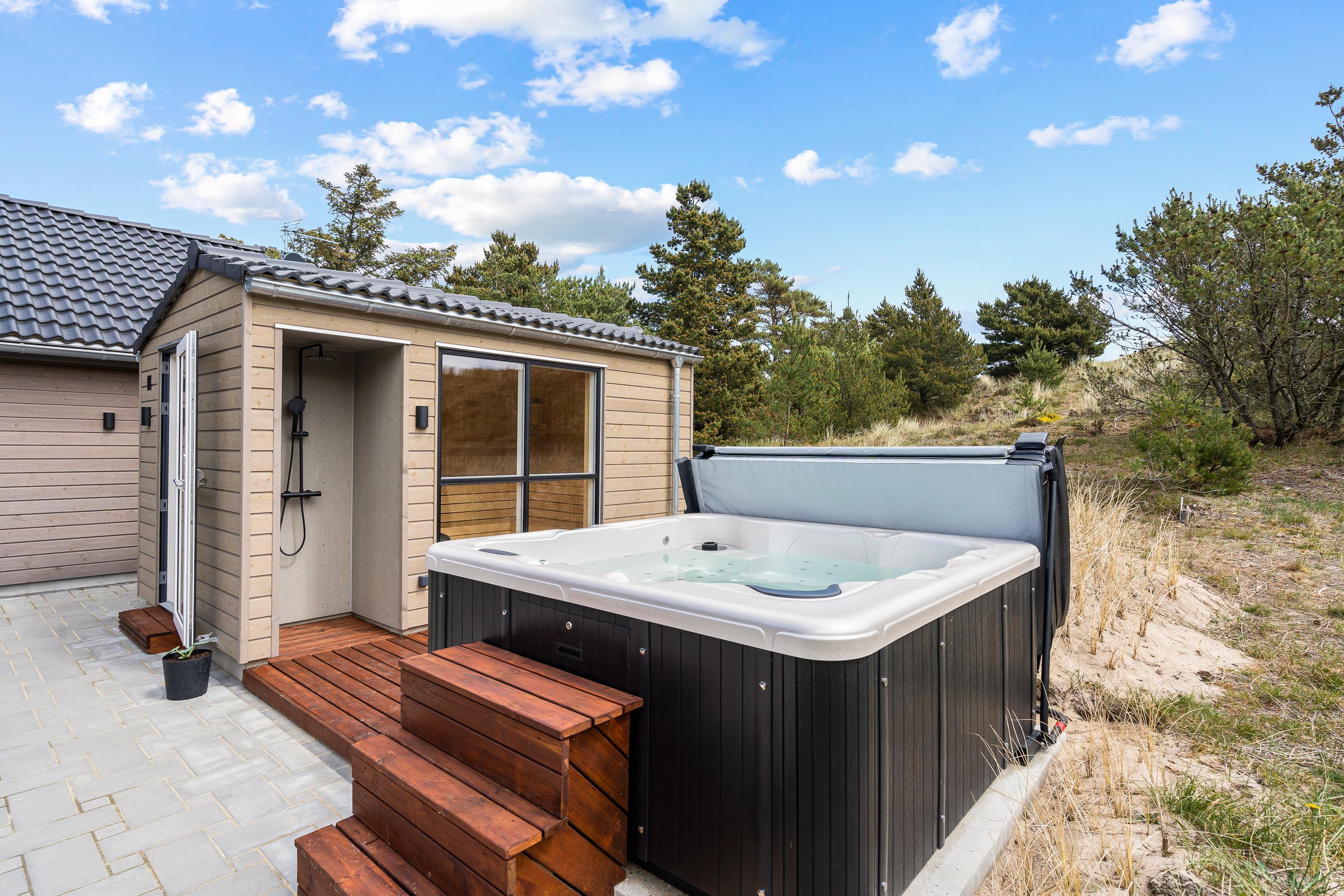 Det er ikke kun indendørs, at I kan slappe af og nyde en wellness-session – det kan I nemlig også udendørs. Her står der en udespa klar, som I kan sætte jer til rette i under åben himmel. Efterfølgende kan I rykke ind i den varme udesauna. Derudover er der også en udebruser, som I kan skylle jer under efter en tur ved stranden. Udebruser kan dog kun benyttes i sommerhalvåret fra 1. april til 31. oktober.