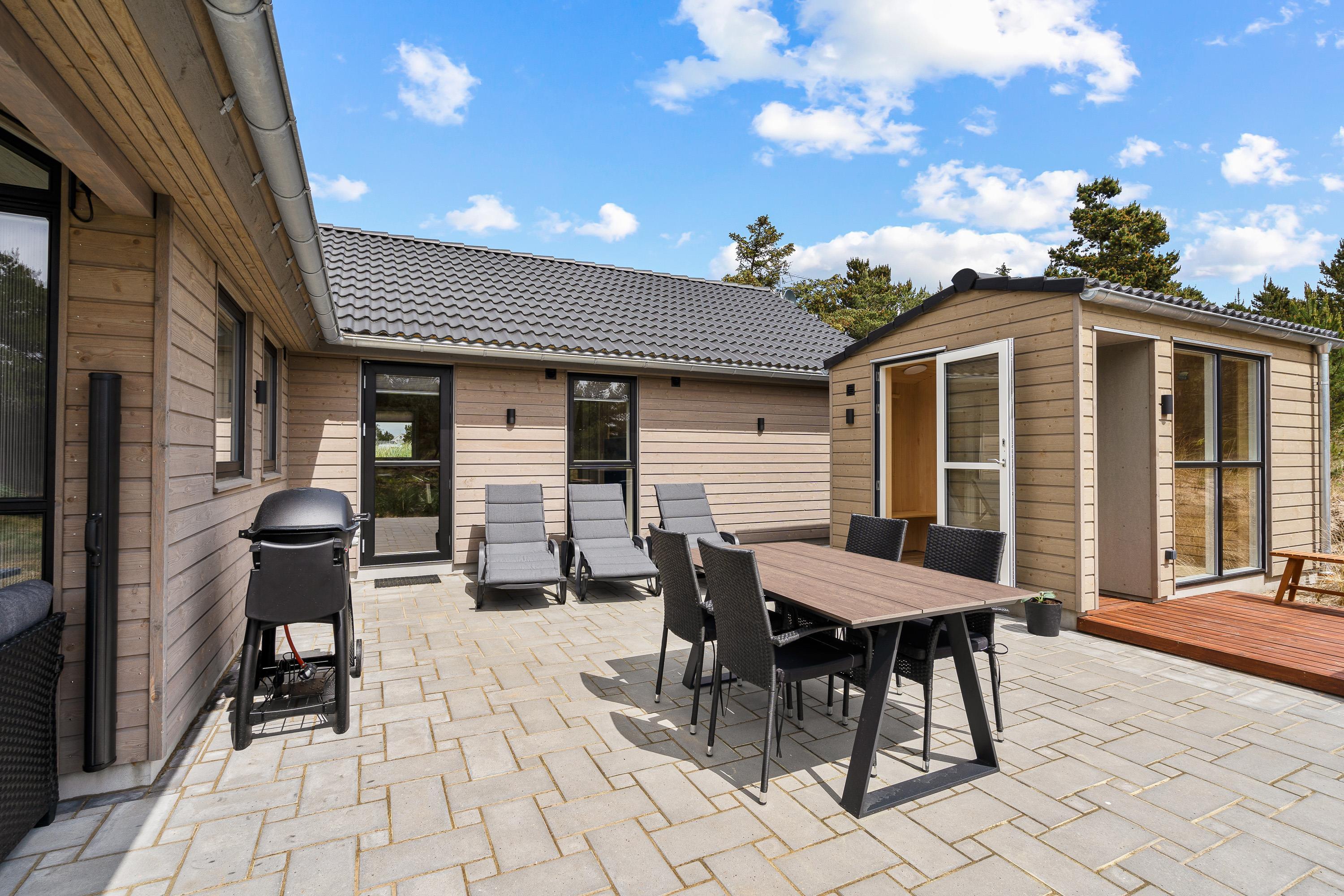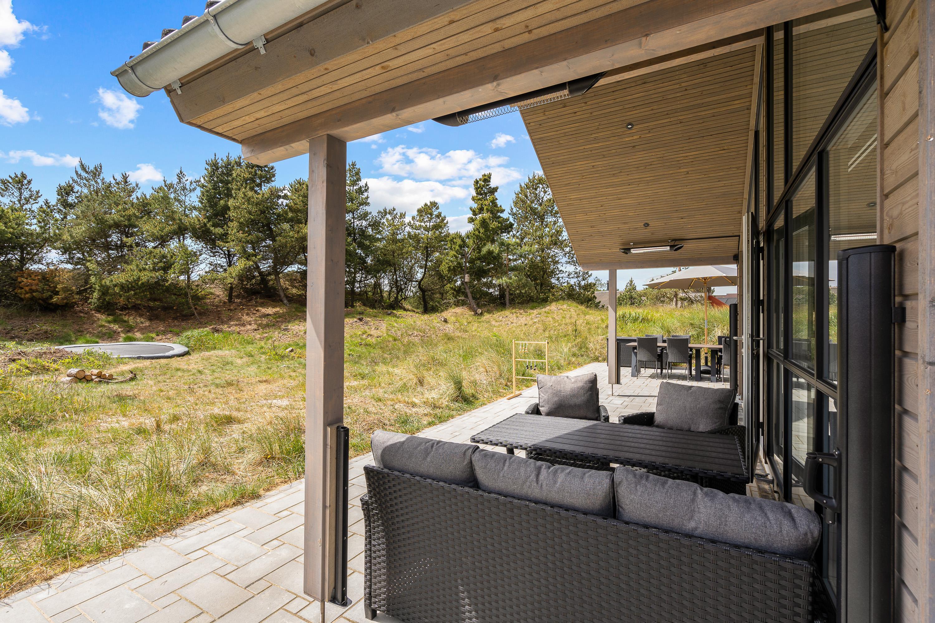 Udendørs har I en dejlig terrasse, der er åben og overdækket. På terrassen har I både havemøbler og liggestole, som I kan sætte jer til rette i med noget koldt at drikke. I har også mulighed for at nyde de lune ferieaftener på terrassen med en lækker middag, som I kan tilberede på sommerhusets gasgrill.