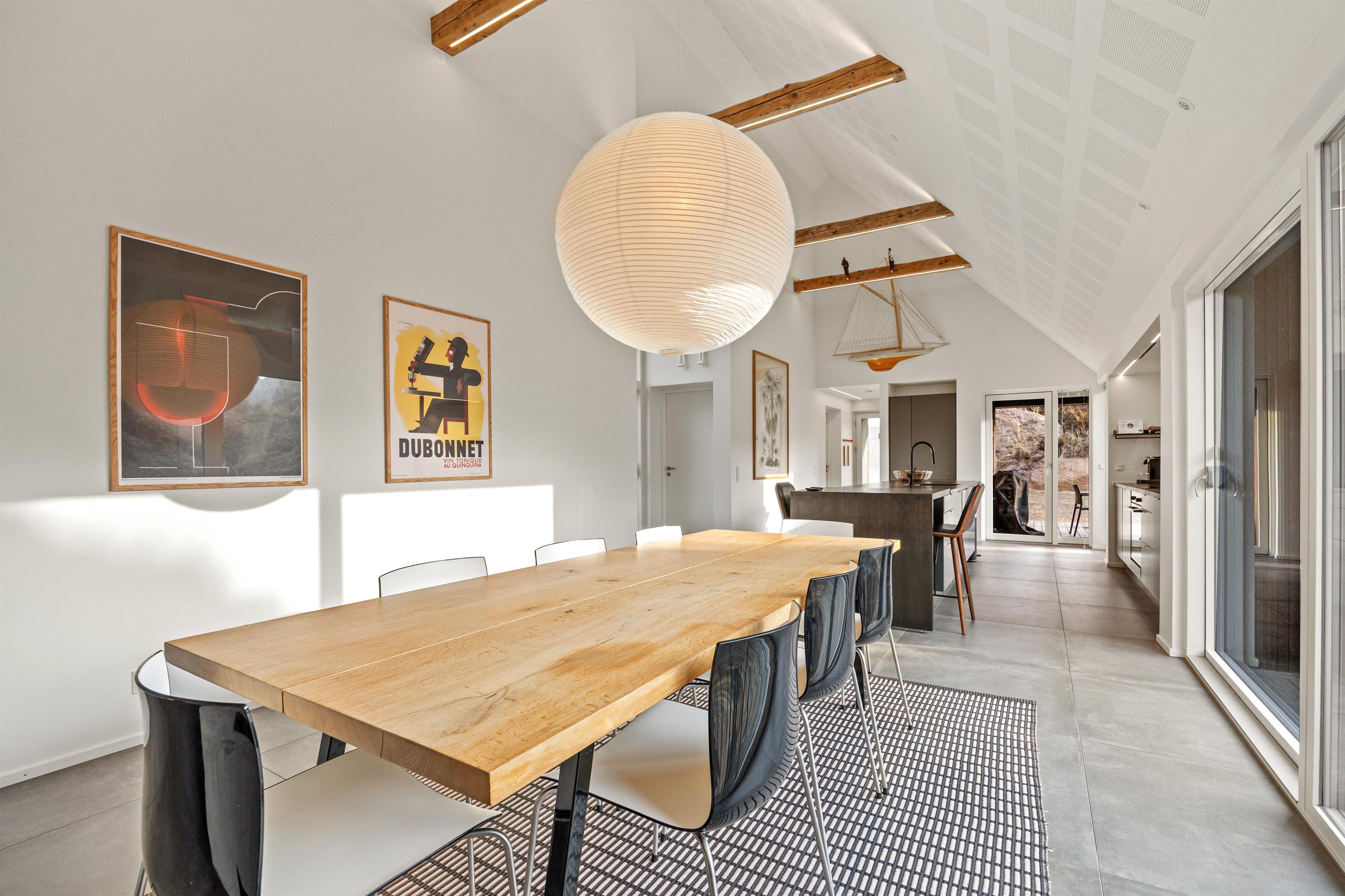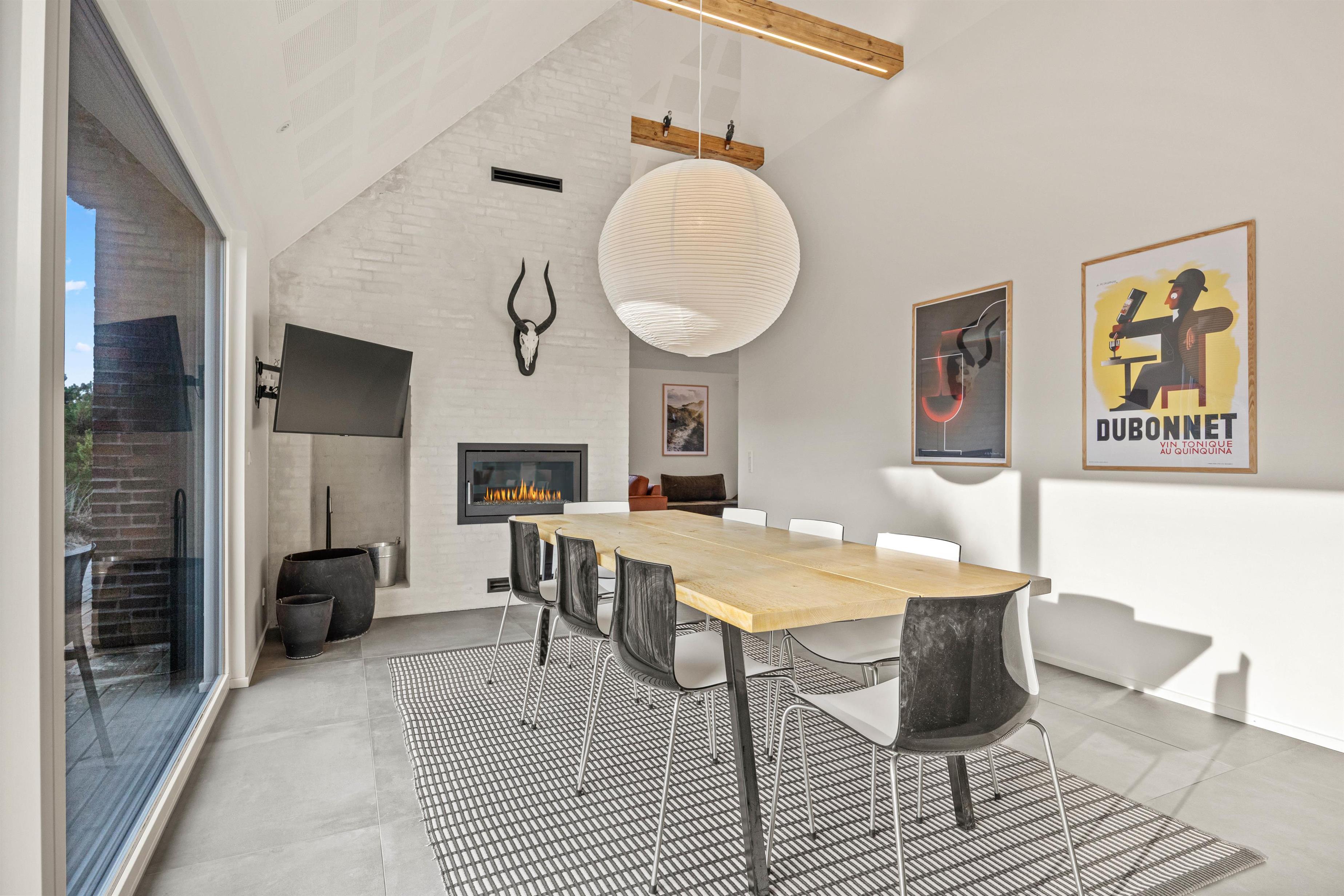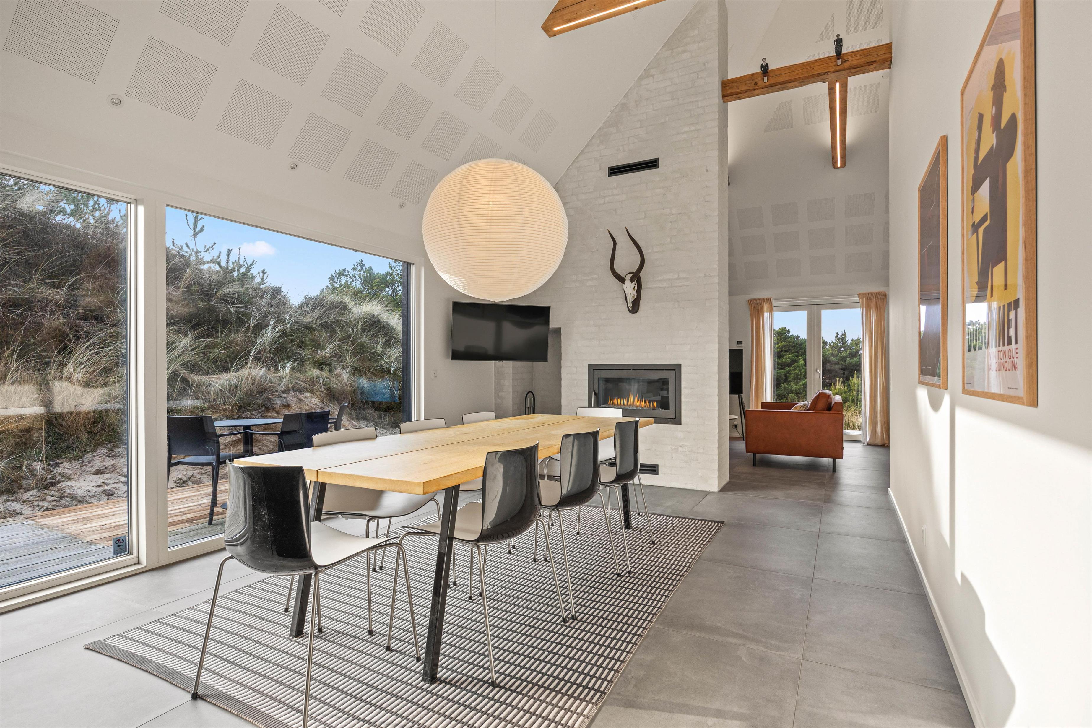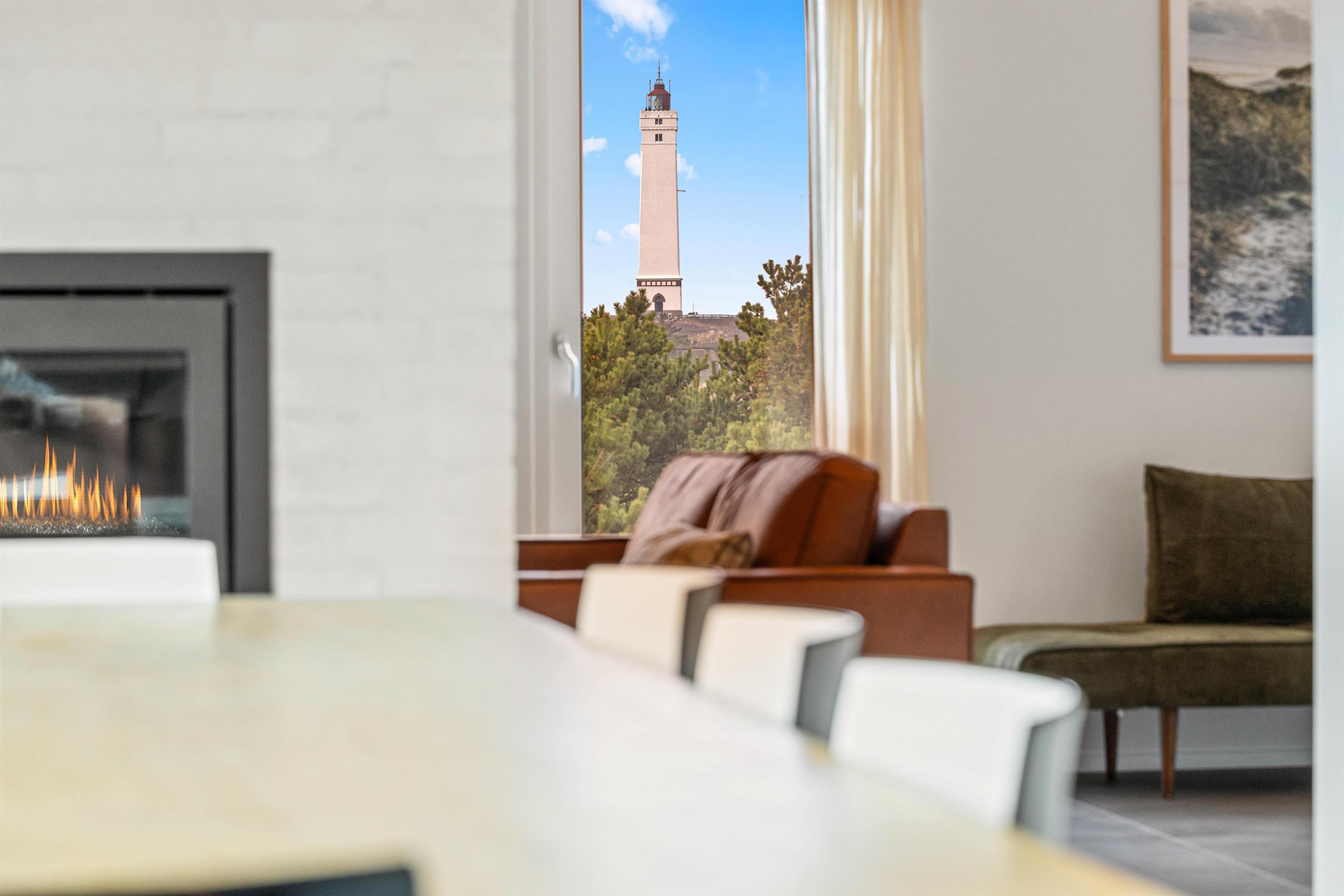 Det store køkken/alrum er adskilt fra opholdsrummet via en mur med integreret, gennemgående pejs, der sikrer hygge og varme i begge afdelinger. Atmosfæren i det lyse sommerhus, samt den vidunderlige udsigt ud over det omkringliggende klitlandskab og fyret i Blåvandshuk, er unik. Her kan du tilbringe en uforglemmelig ferie.