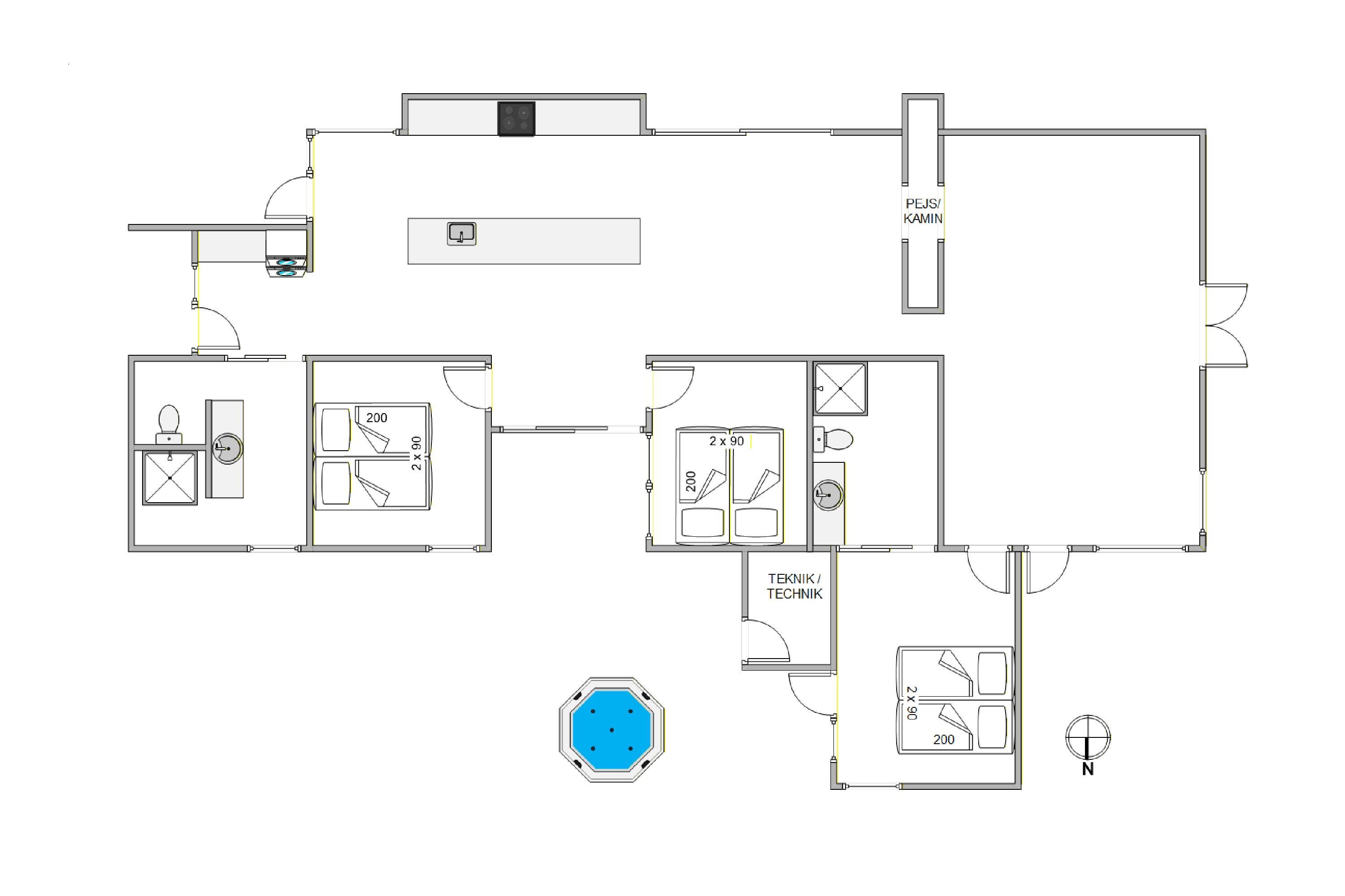 Huset har i alt 6 senge fordelt på 3 soveværelser og 2 gode badeværelser – alle med integreret gulvvarme. Køkkenet er udstyret med alt moderne udstyr, og selvfølgelig er vaskemaskine og tørretumbler også en del af sommerhusets udstyr.