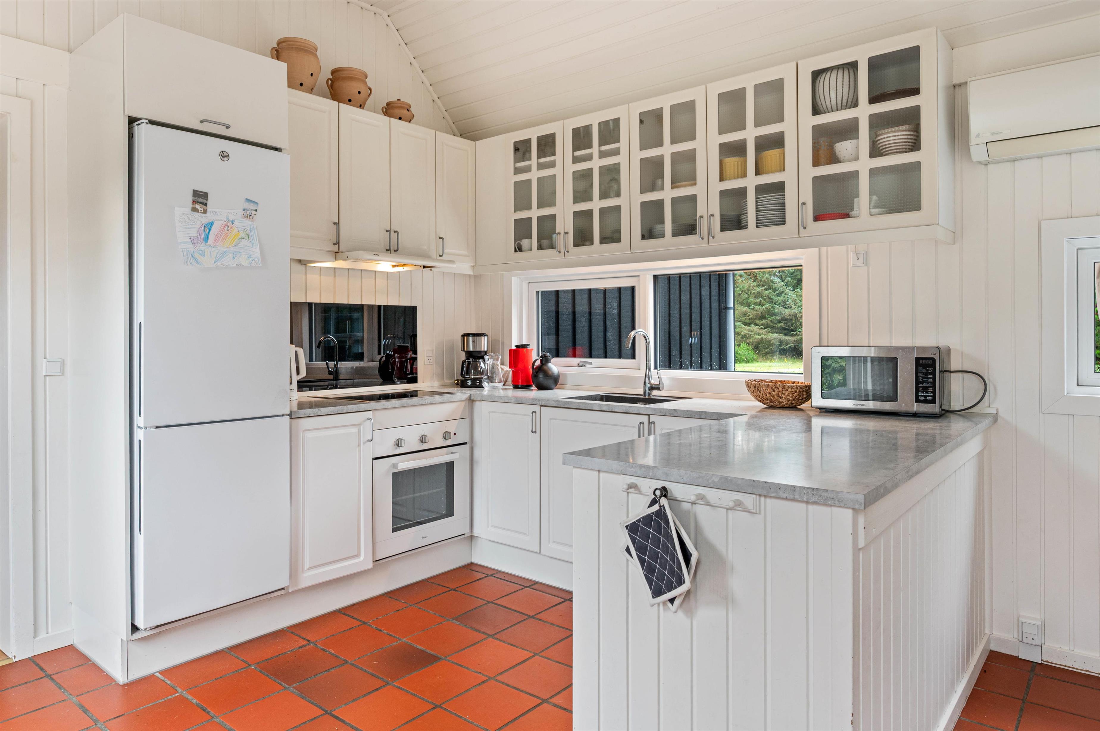Køkkenet ligger i åben forbindelse med spisepladsen, så børnene sagtens kan lege ved bordet, mens I tilbereder maden. Køkkenet er blandt andet udstyret med induktionskomfur, opvaskemaskine og mikroovn. Derudover har I 60 liters frysemulighed i sommerhuset.