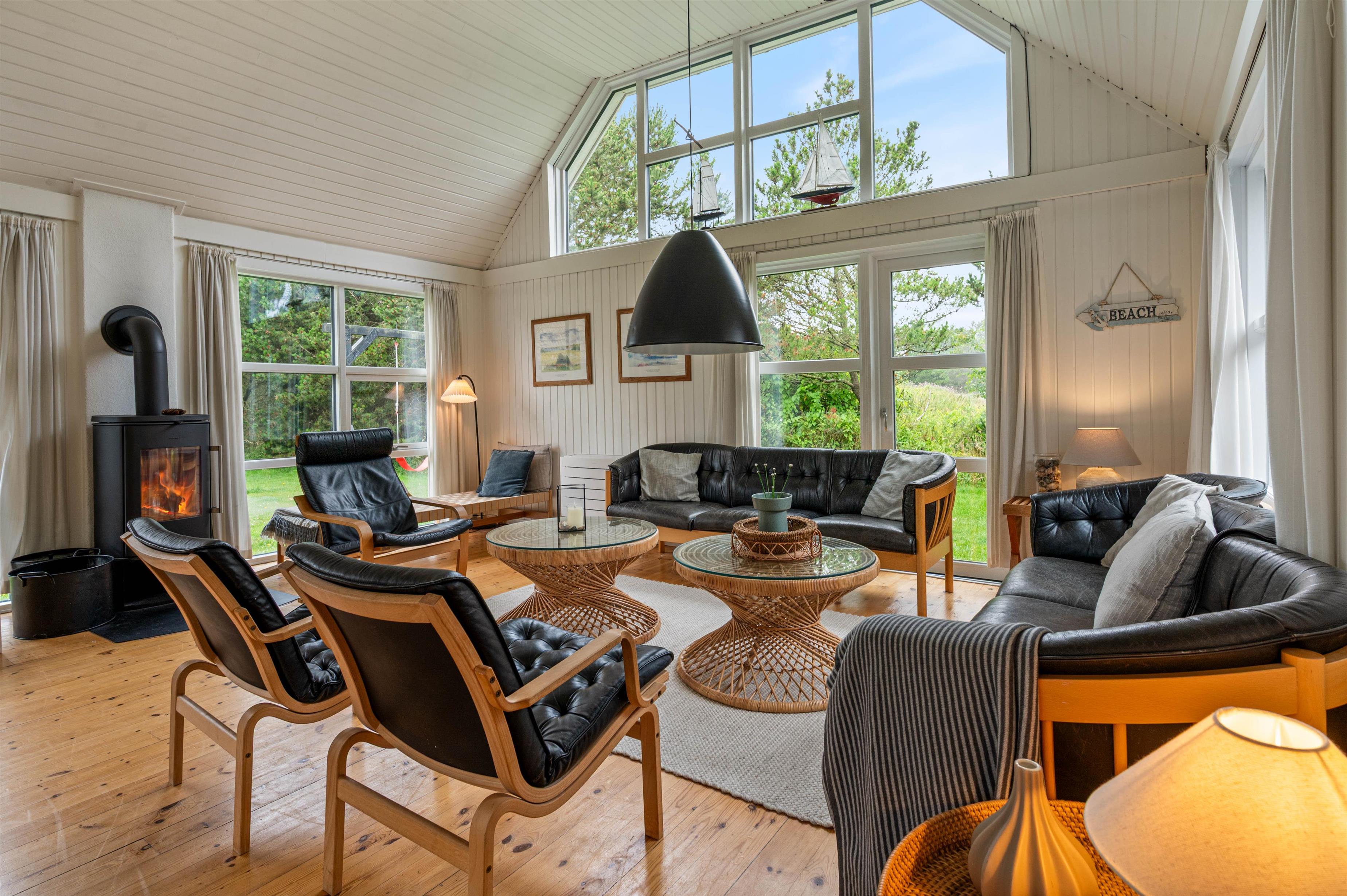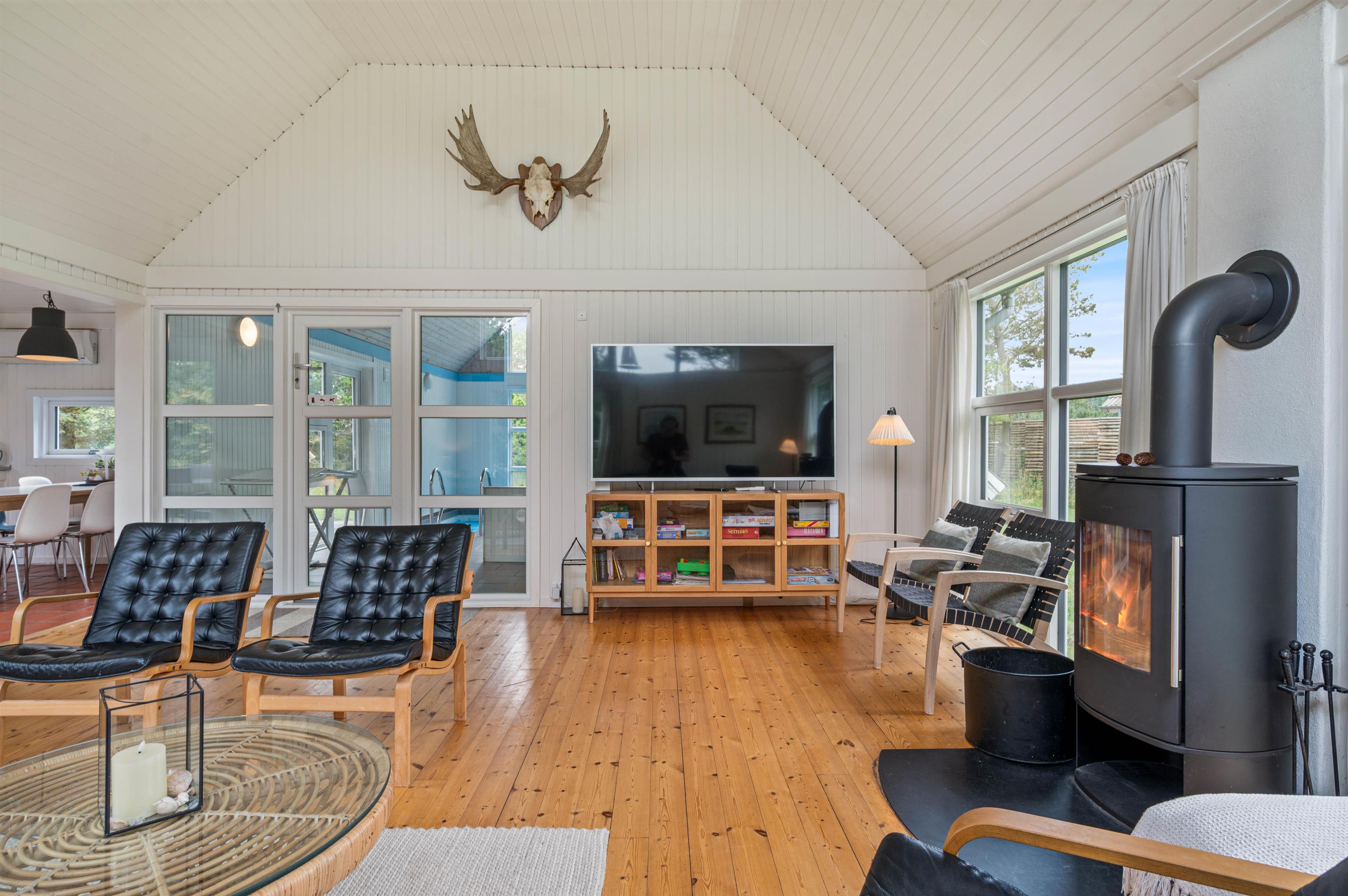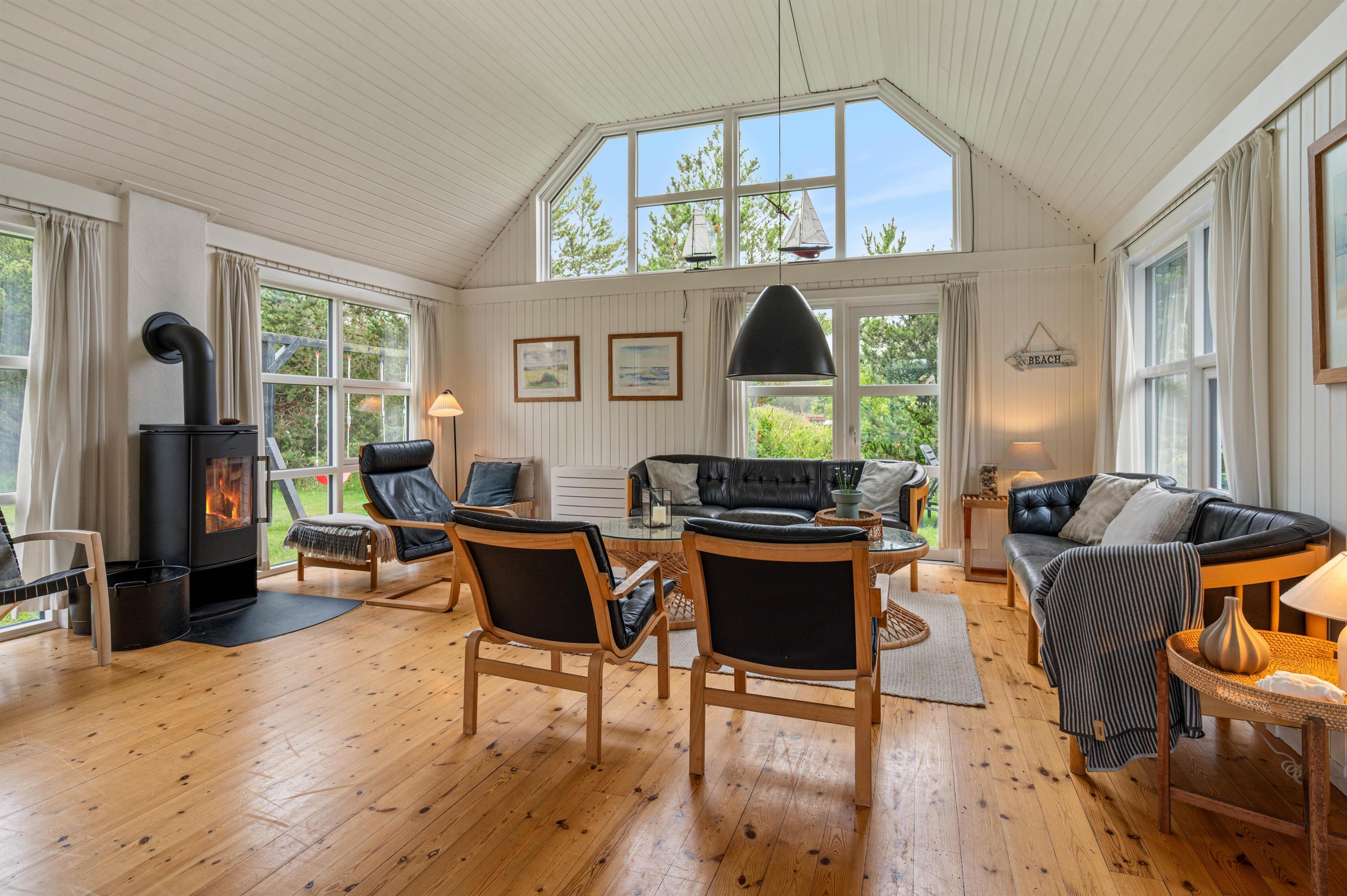 Hjertet af sommerhuset er stuen, hvor I straks vil føle jer hjemme. Rummet er indbydende og lyst grundet de mange vinduer og det hvidmalede træ, som i kombination med trægulvet skaber en hyggelig atmosfære. Tænd brændeovnen om aftenen og nyd dens varme, mens I streamer en film via Chromecast. I sommerhuset er der også danske tv-kanaler.