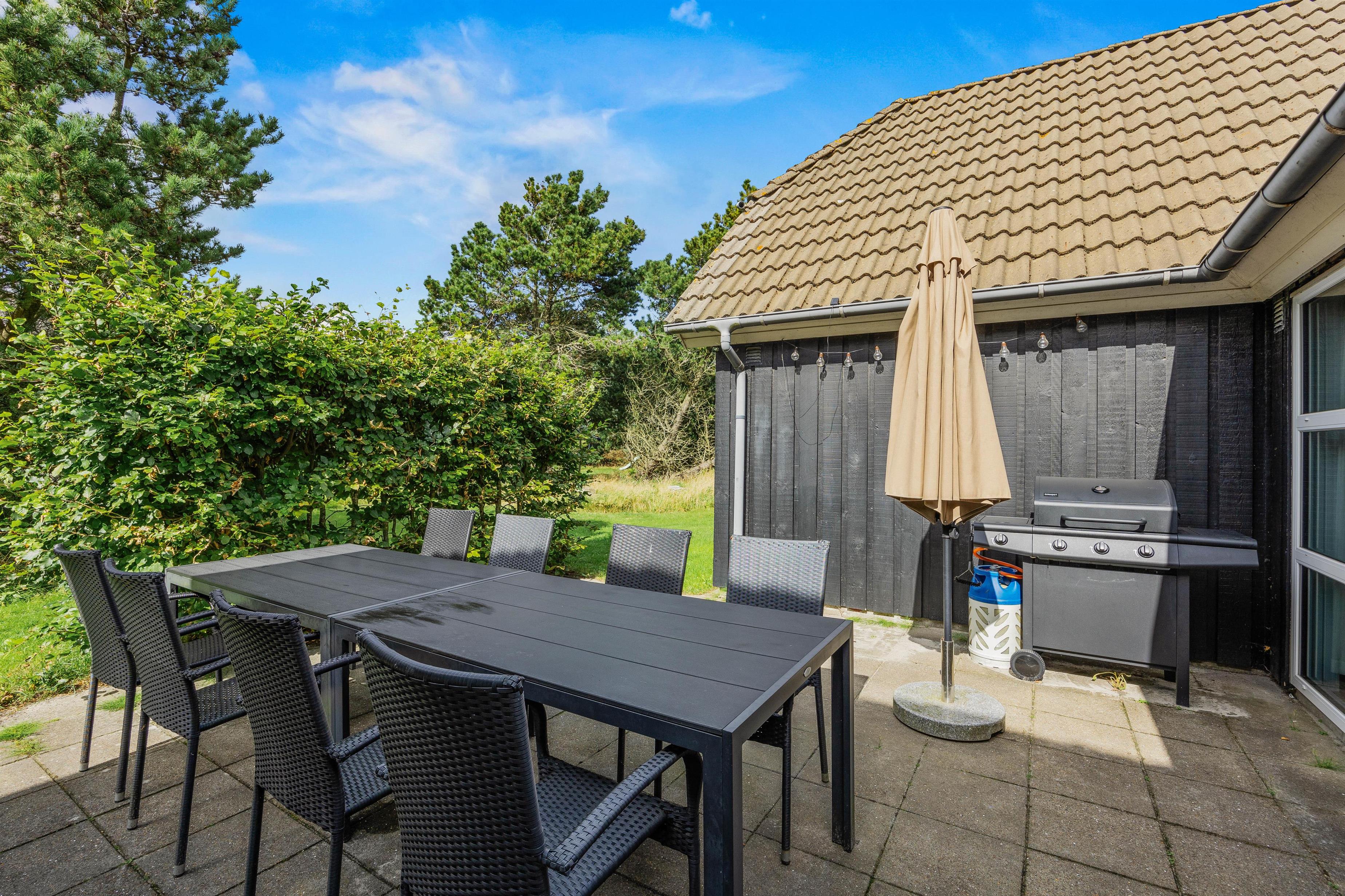 Også udendørs kan I tilbringe mange skønne timer med familien ved sommerhuset. Grunden er omkranset af træer og buske, så I kan hygge jer i fred og ro på den afskærmede terrasse. Sæt dig godt tilrette i en liggestol med en spændende krimi og nyd sommerdagen her.