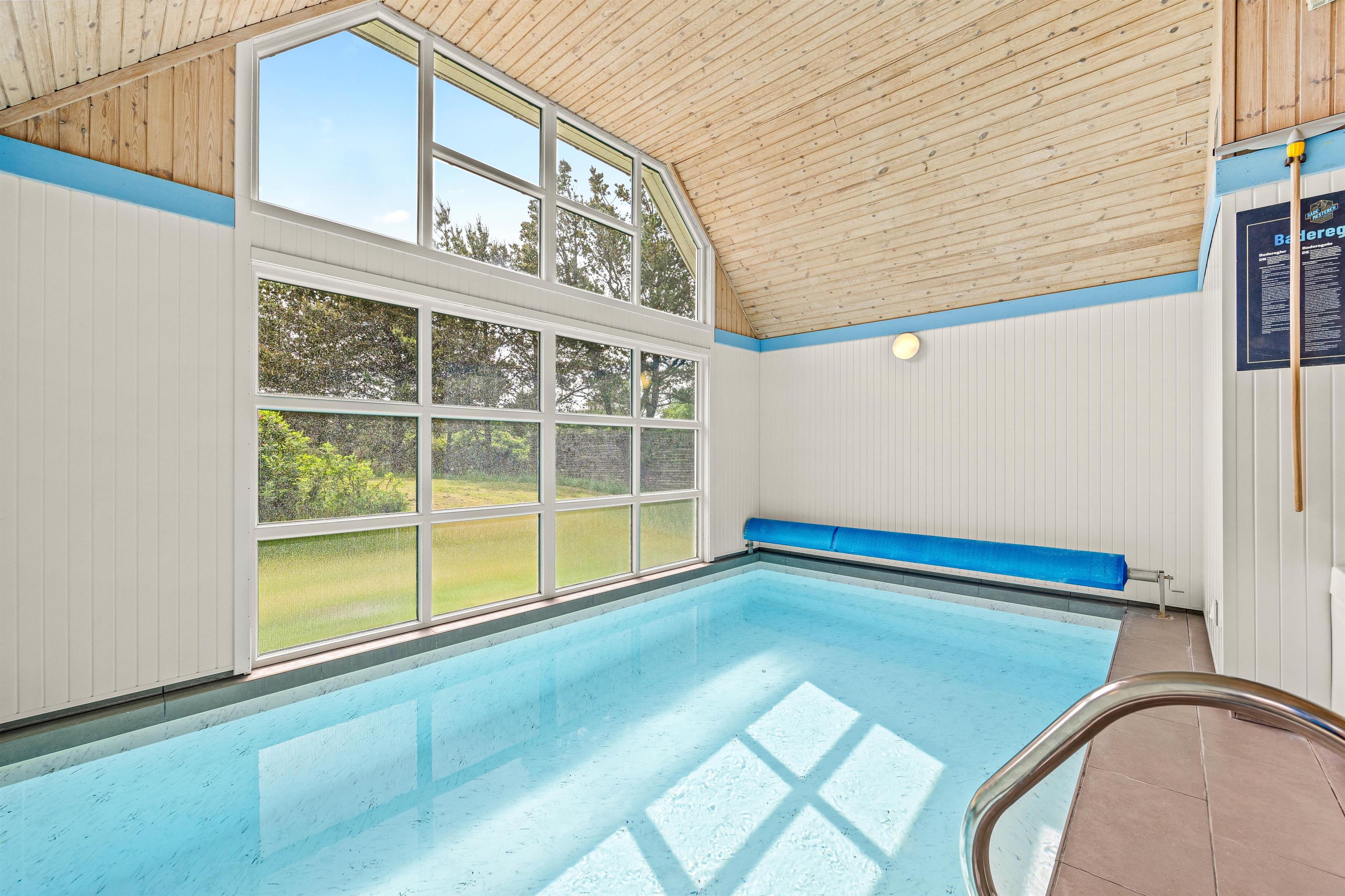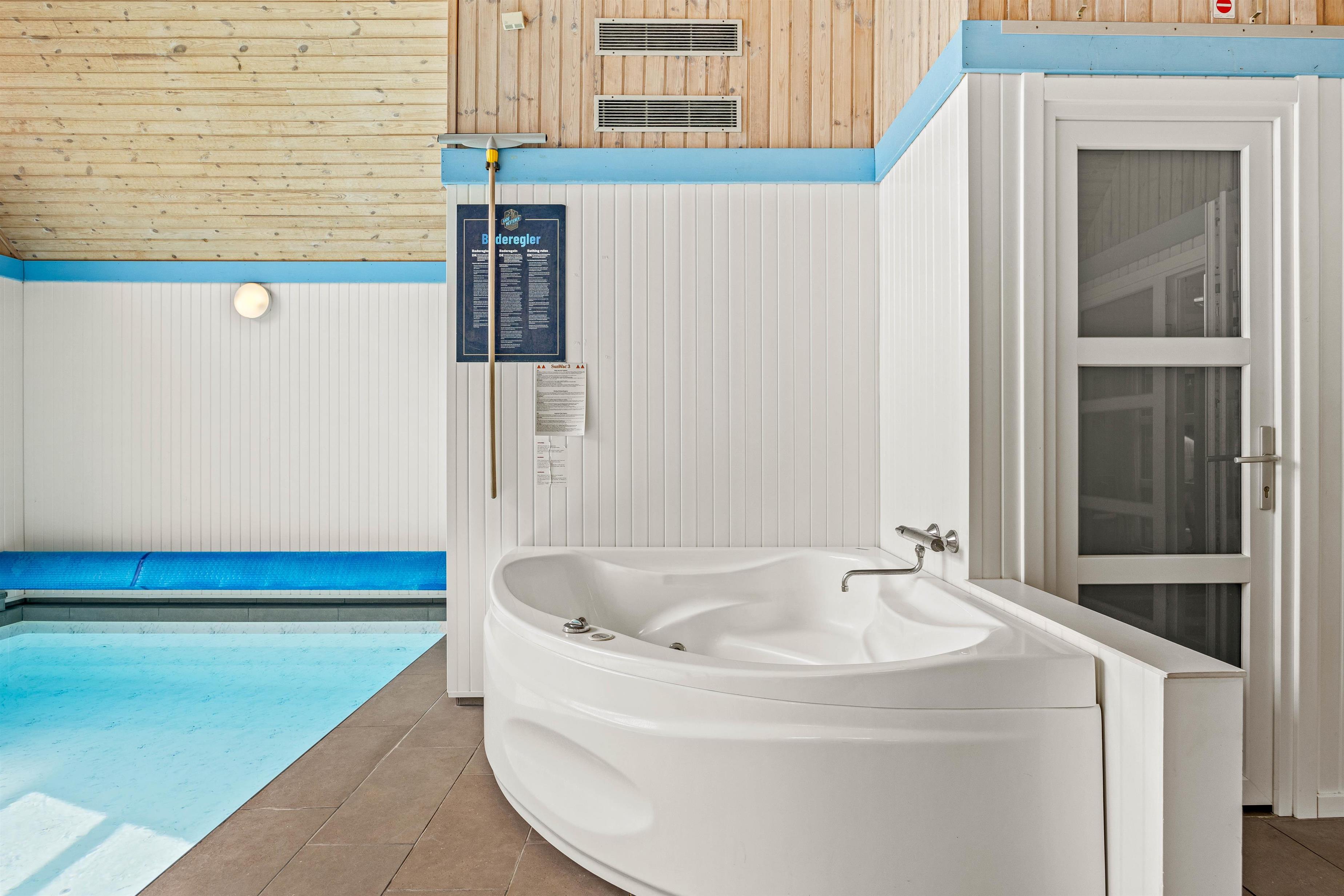 Højdepunktet i sommerhuset er den 15 m² pool. Efter en lang dag på stranden eller en frisk gåtur, kan I varme jer op i saunaen eller spabadet, mens børnene plasker rundt i poolen.