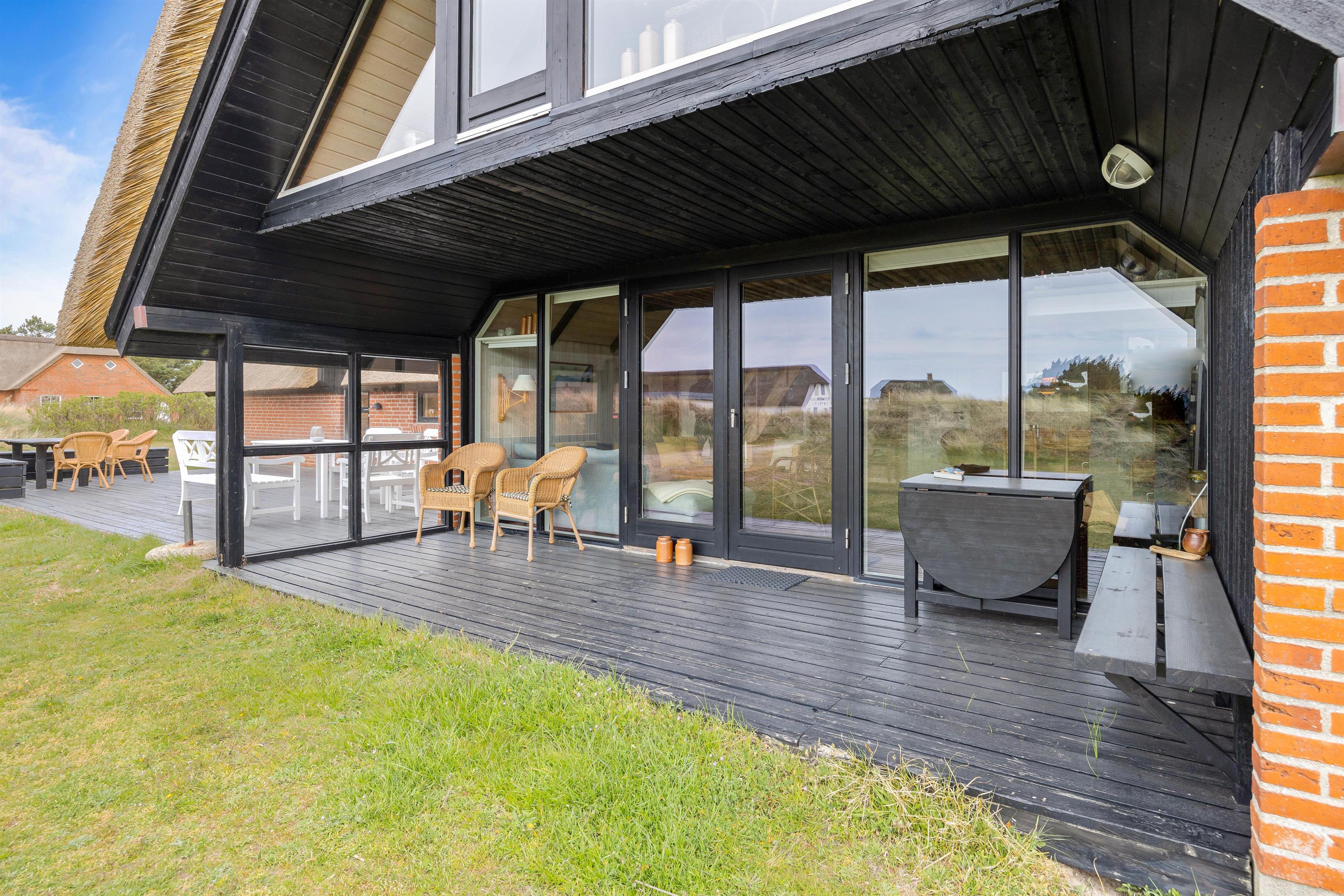 Sommerhuset har en skøn terrasse, som er opdelt i 2. Her er en afskærmet og overdækket del samt en åben del, hvorfra I kan nyde solen. Terrasserne skal naturligvis bruges til grillaftenen, da der både er havemøbler og grill til jeres rådighed.