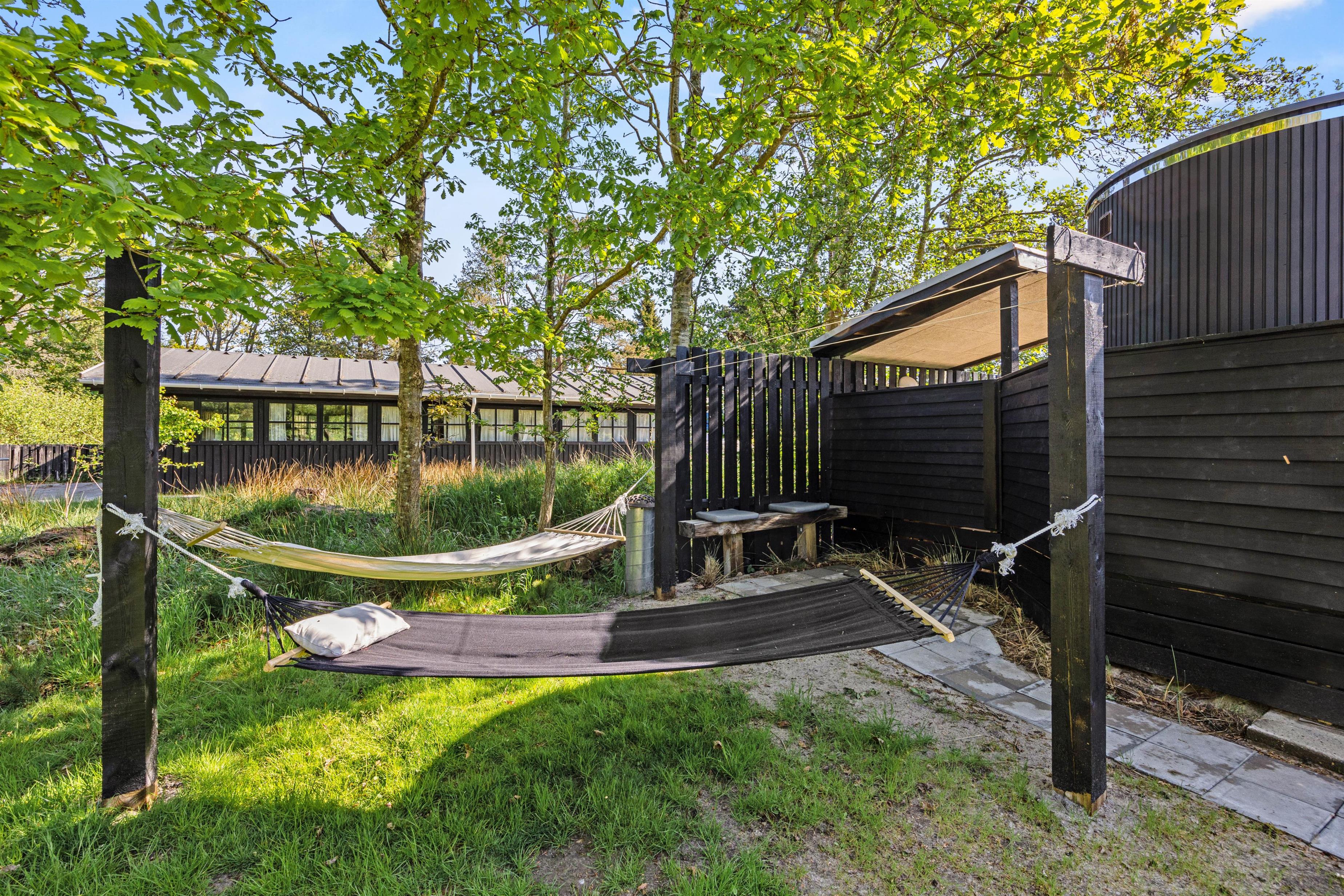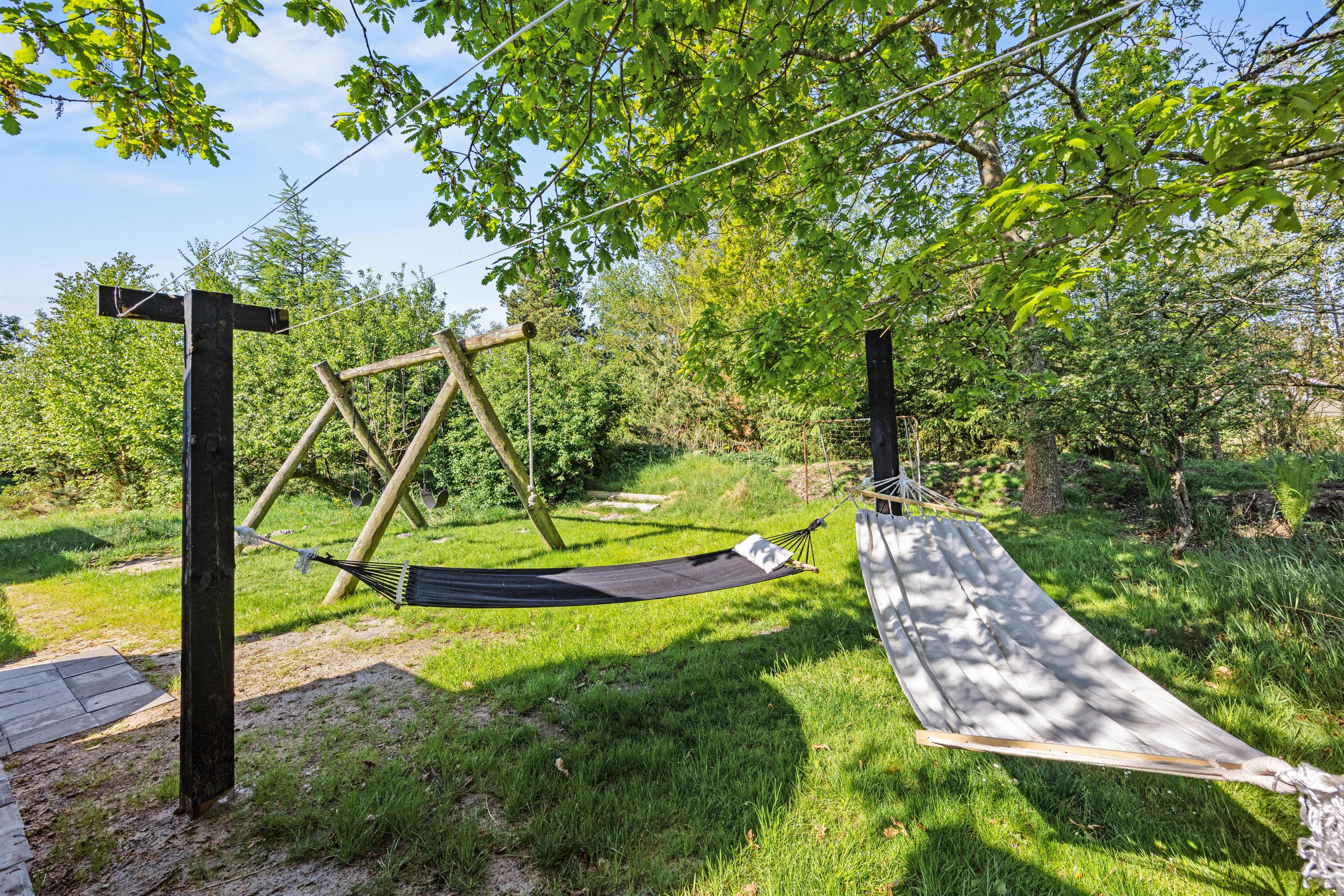 Rundt om den 1750 m2 store grund er der forholdsvis høje træer, som giver dejligt læ for vinden og er bolig til skovens mange fugle, og der er flere hyggeterrasser, hvor I kan finde sol eller skygge efter behov. Gyngestativet og de indbydende hængekøjer skal nok blive brugt til hygge og leg i haven.