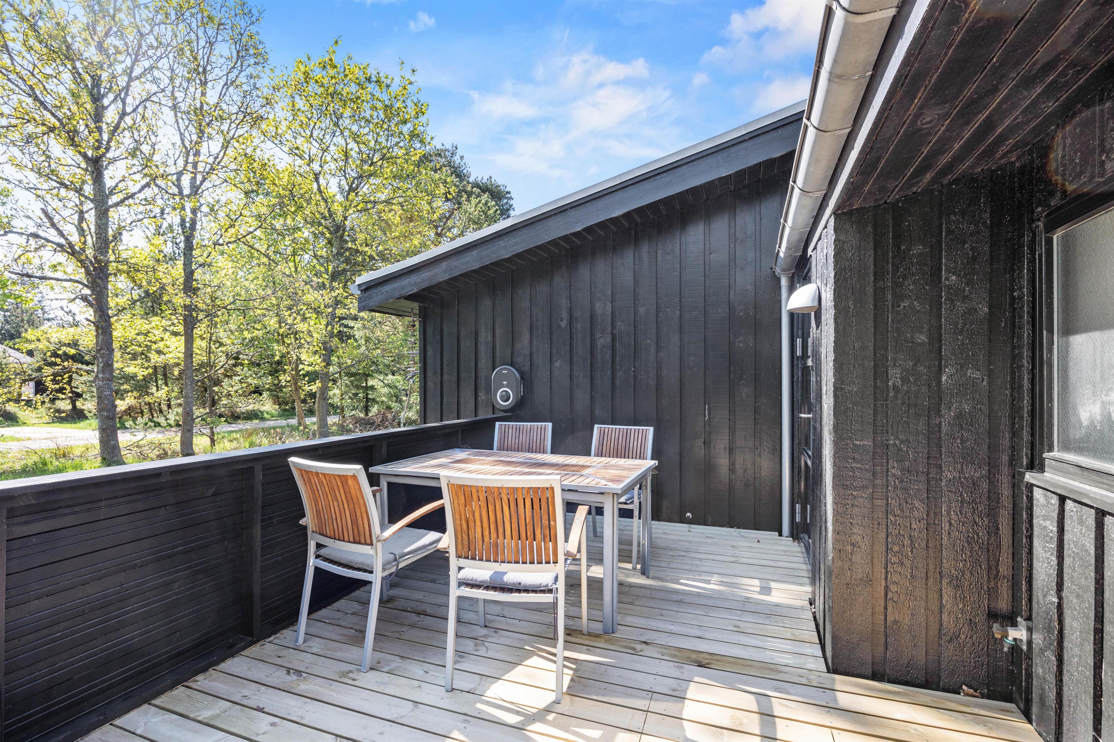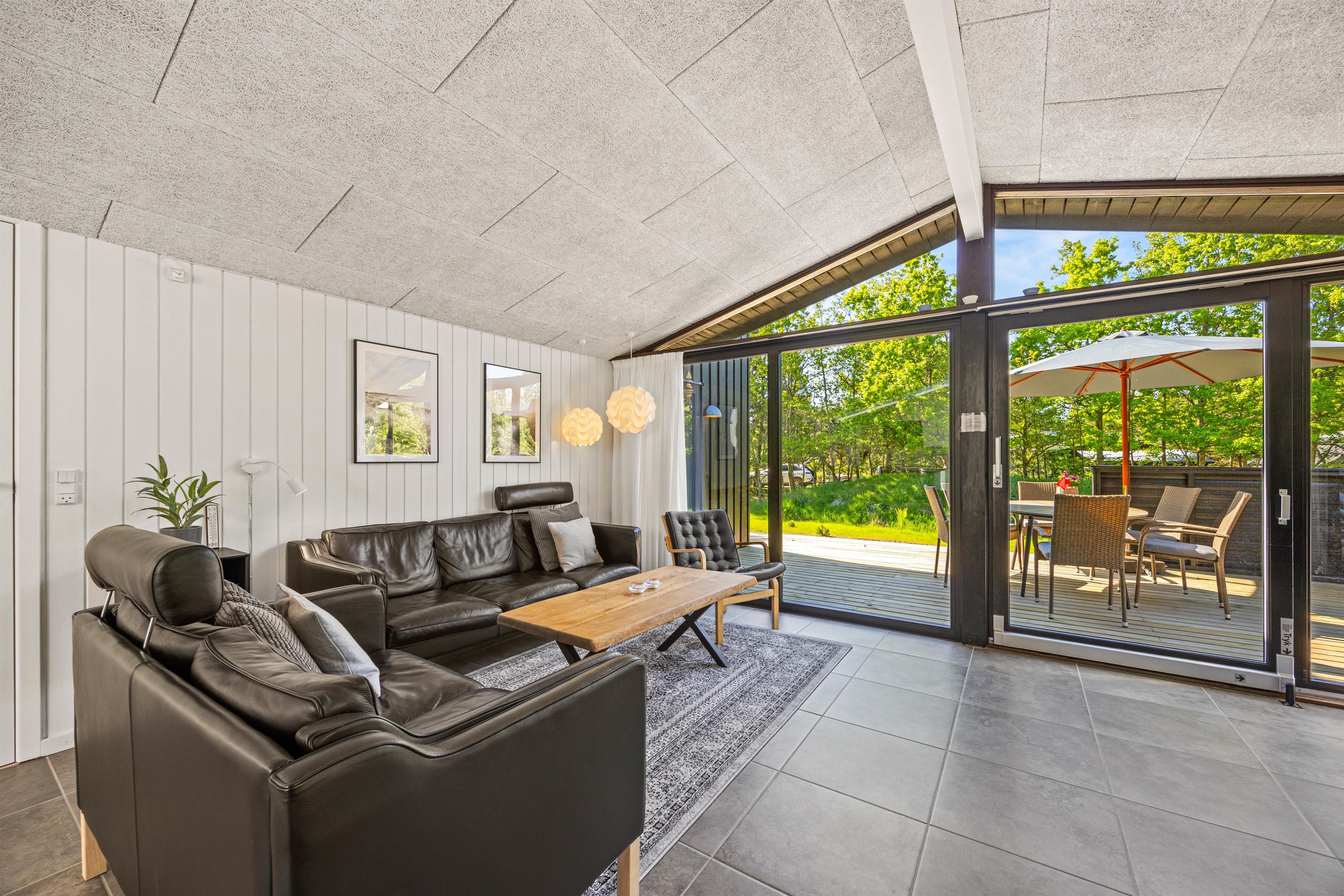 Fra skydedøren i stuen er der udgang til en stor terrasse, hvor der er god plads til at følge solen gennem dagen og til at trække grillen frem om aftenen, så I kan hygge jer med god mad på ferien.