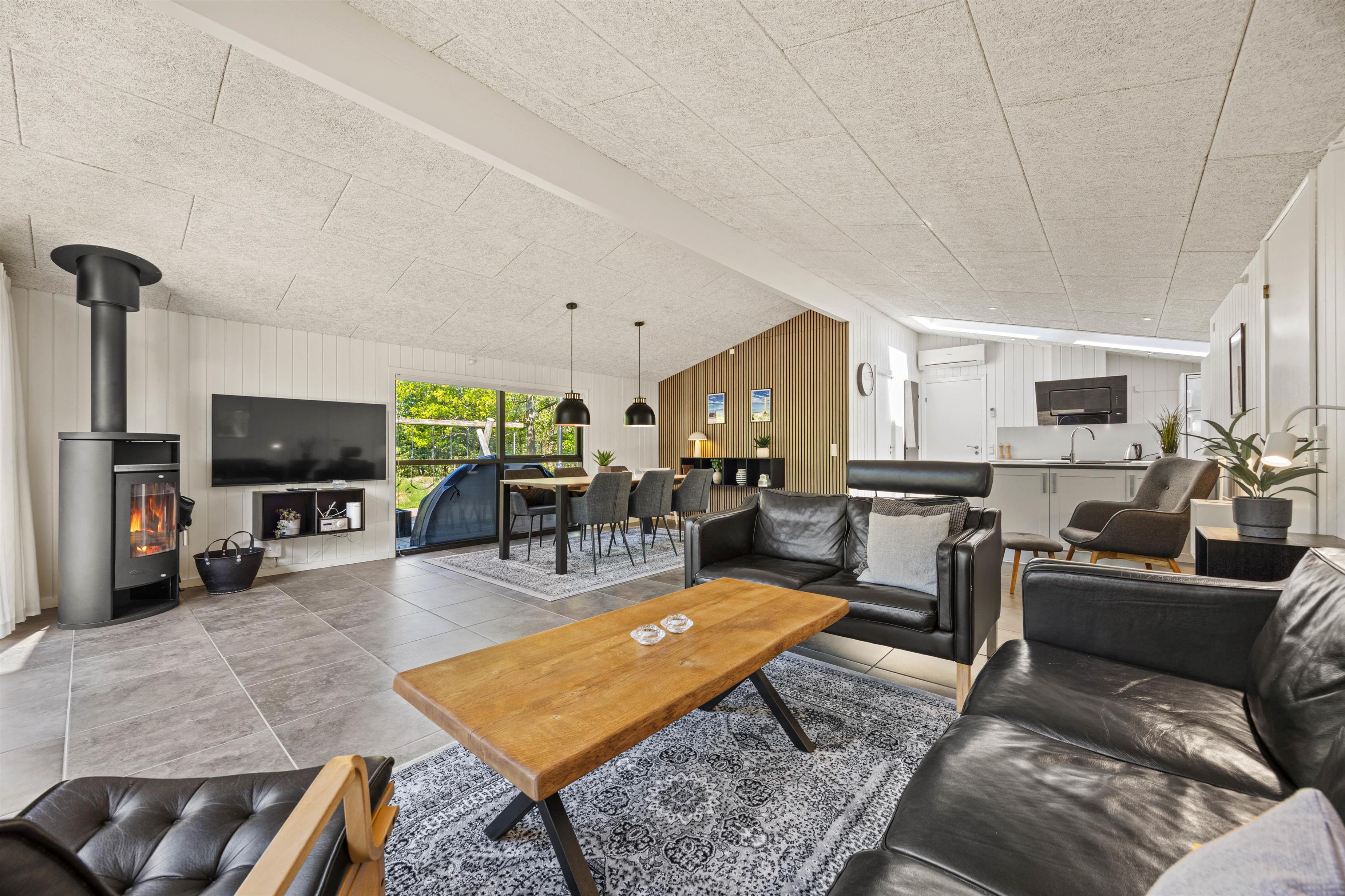 I samme rum er også en behagelig siddegruppe med sofa og stole, og i hjørnet sørger brændeovnen for at sprede varm og hygge. De store vinduespartier mod haven giver et fantastisk lysindfald og mulighed for at følge naturen udenfor. Et lille sparetip: brug varmepumpen og spar energi.
