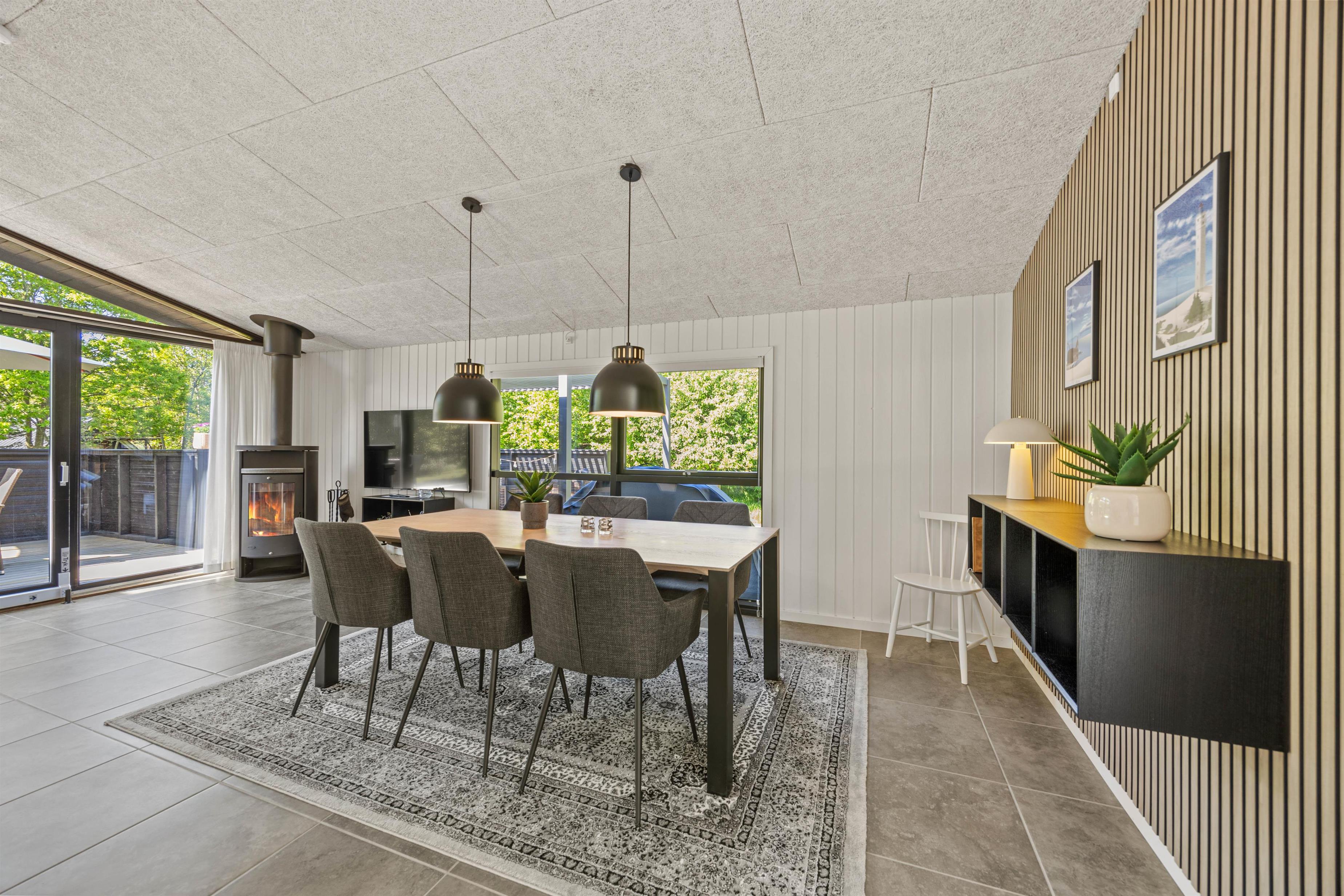 Straks I træder ind i feriehuset via hoveddøren i køkkenet, har I overblik over opholdsrummet, hvor der er god plads til alle. Selve køkkenet har god bordplads til tilberedningen, og køkken-øen kan også bruges som serveringsplads. Spisebordet er placeret langs med de store vinduer, der giver et dejligt lys til de indendørs måltider. I køkkenalrummet er der plads til at være sammen, også mens I laver forskellige aktiviteter.
