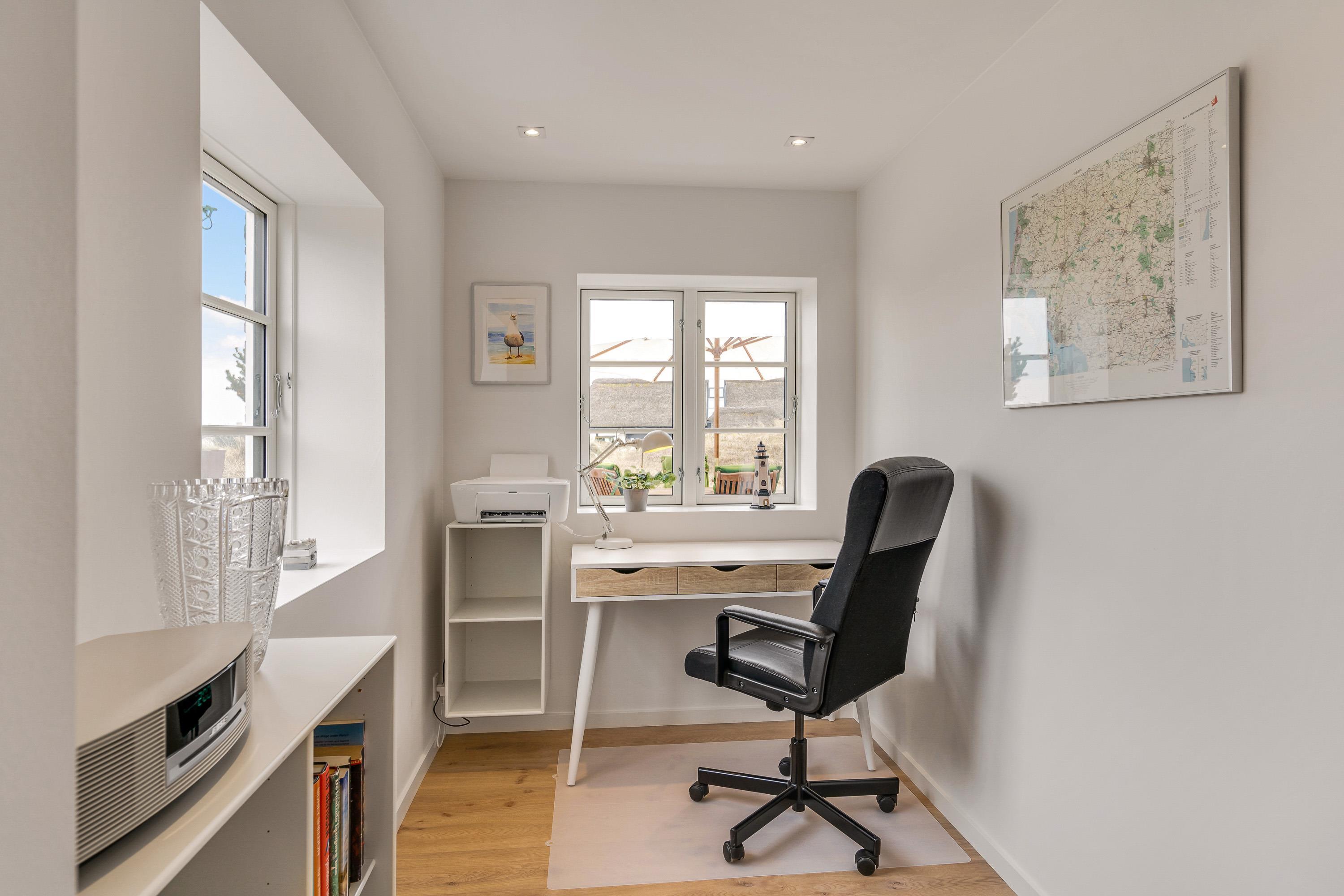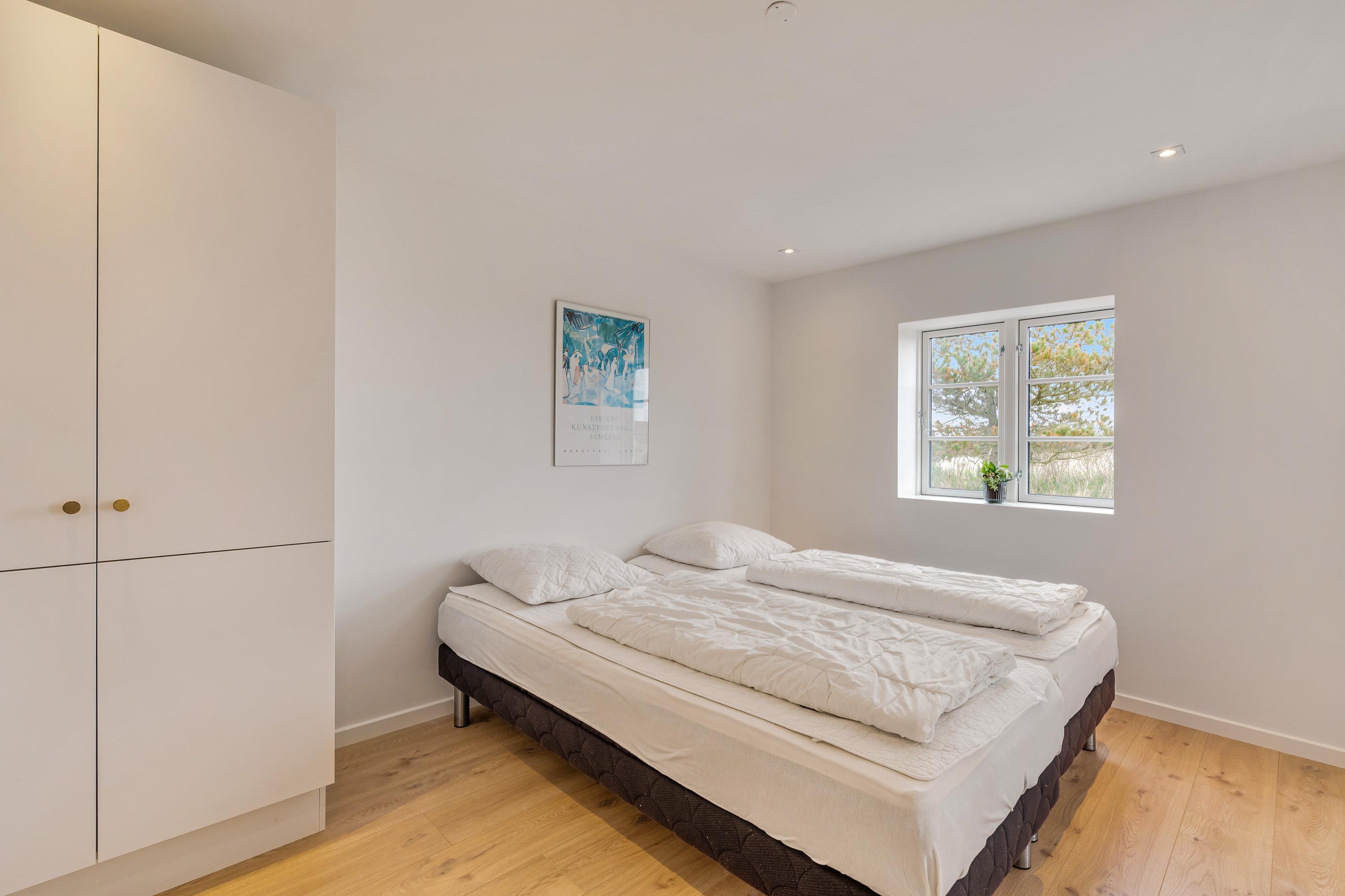 Sommerhuset i Blåvand har plads til op til otte personer med tre hyggelige soveværelser, der hver er udstyret med en komfortabel dobbeltseng og dertil en sovesofa på 1. sal - bemærk, at trappen til overetagen er lidt stejl.
