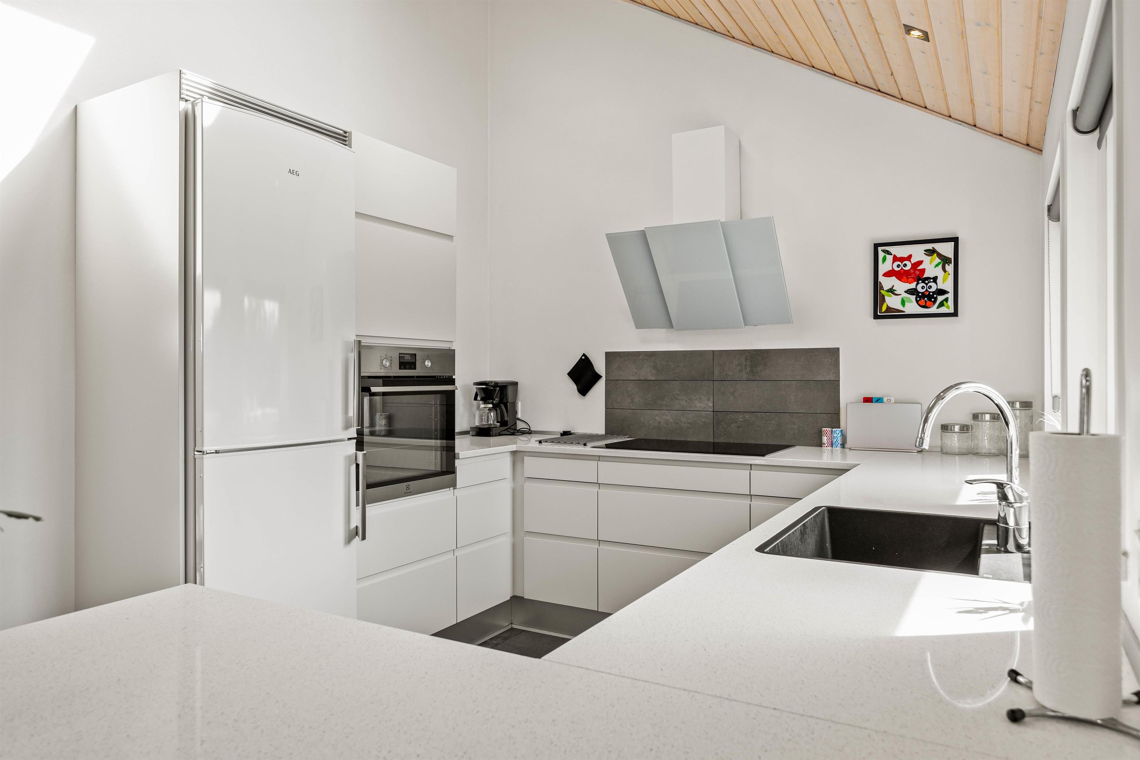 I sommerhusets alrum kan I samles til hyggelige stunder med hele familien. Tænd op i brændeovnen for ekstra hyggelig feriestemning, mens I spiller brætspil ved spisebordet. Måltiderne kan tilberedes i det veludstyrede køkken, og opvaskemaskinen klarer jeres opvask. Som et ekstra plus er der både vaskemaskine og tørretumbler i sommerhusets entré.
