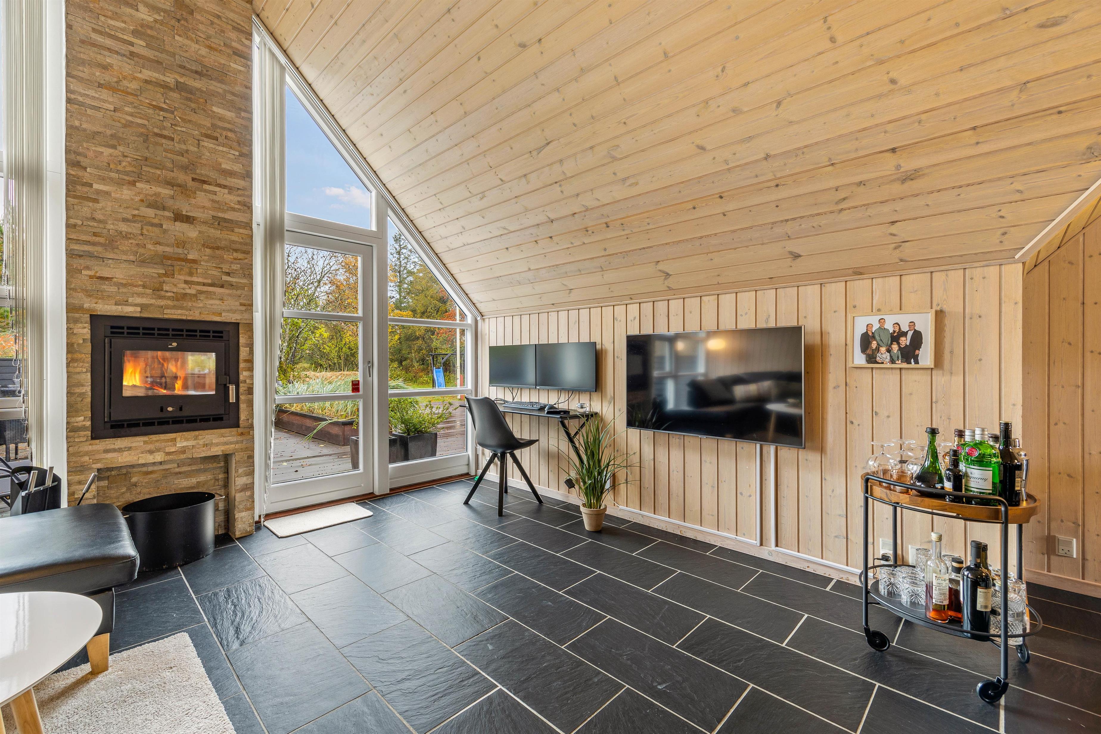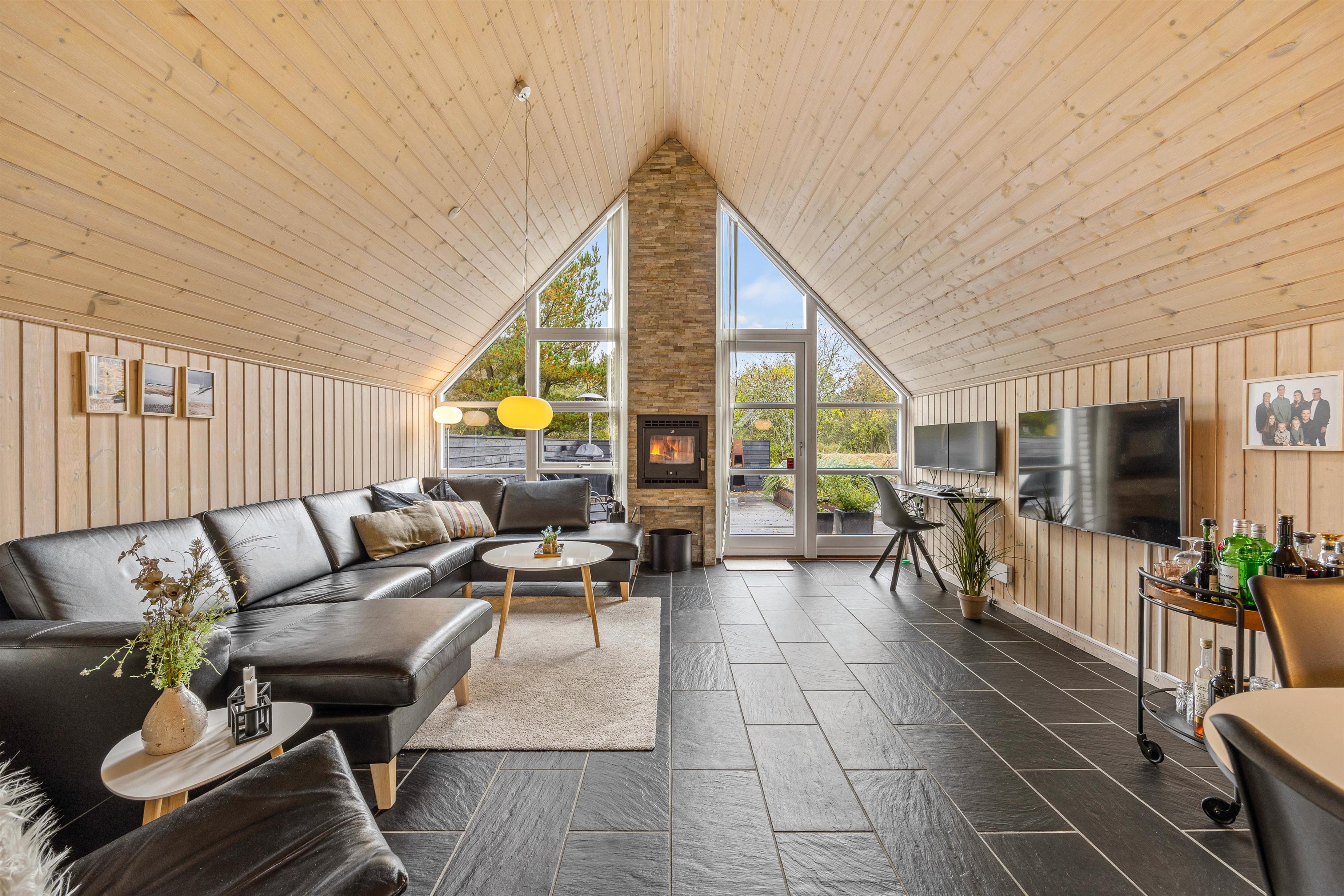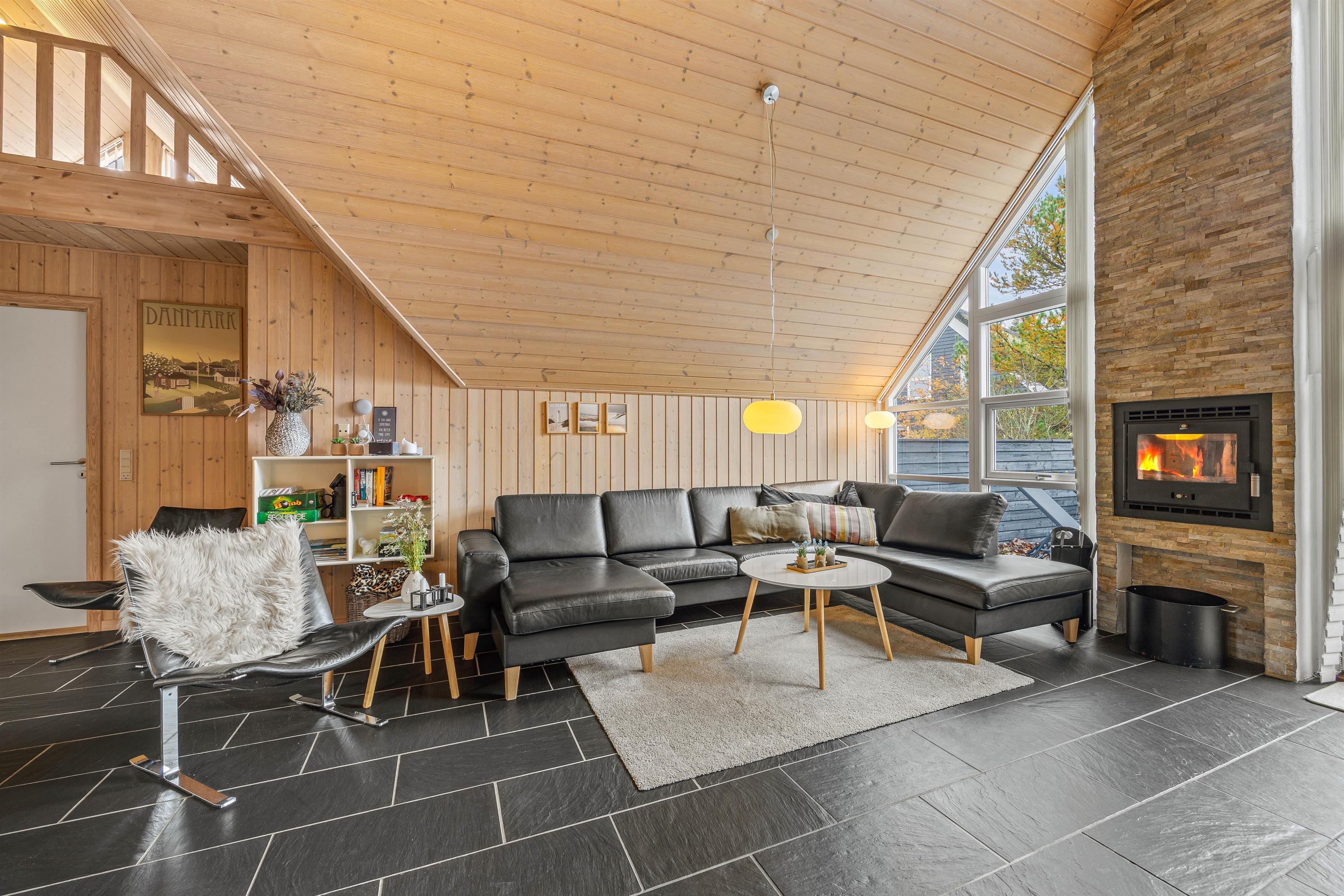 Det sorte klinkegulv med gulvvarme går igen i hele opholdsrummet, der ender i den hyggelige stue med det store vinduesparti, der lukker lyset og naturen ind og den flotte murstenssøjle med brændeovnen. Den store lædersofa indbyder til at slænge sig til en film eller en god bog. Et lille tip: brug den energivenlige varmepumpe for en jævn behagelig temperatur.