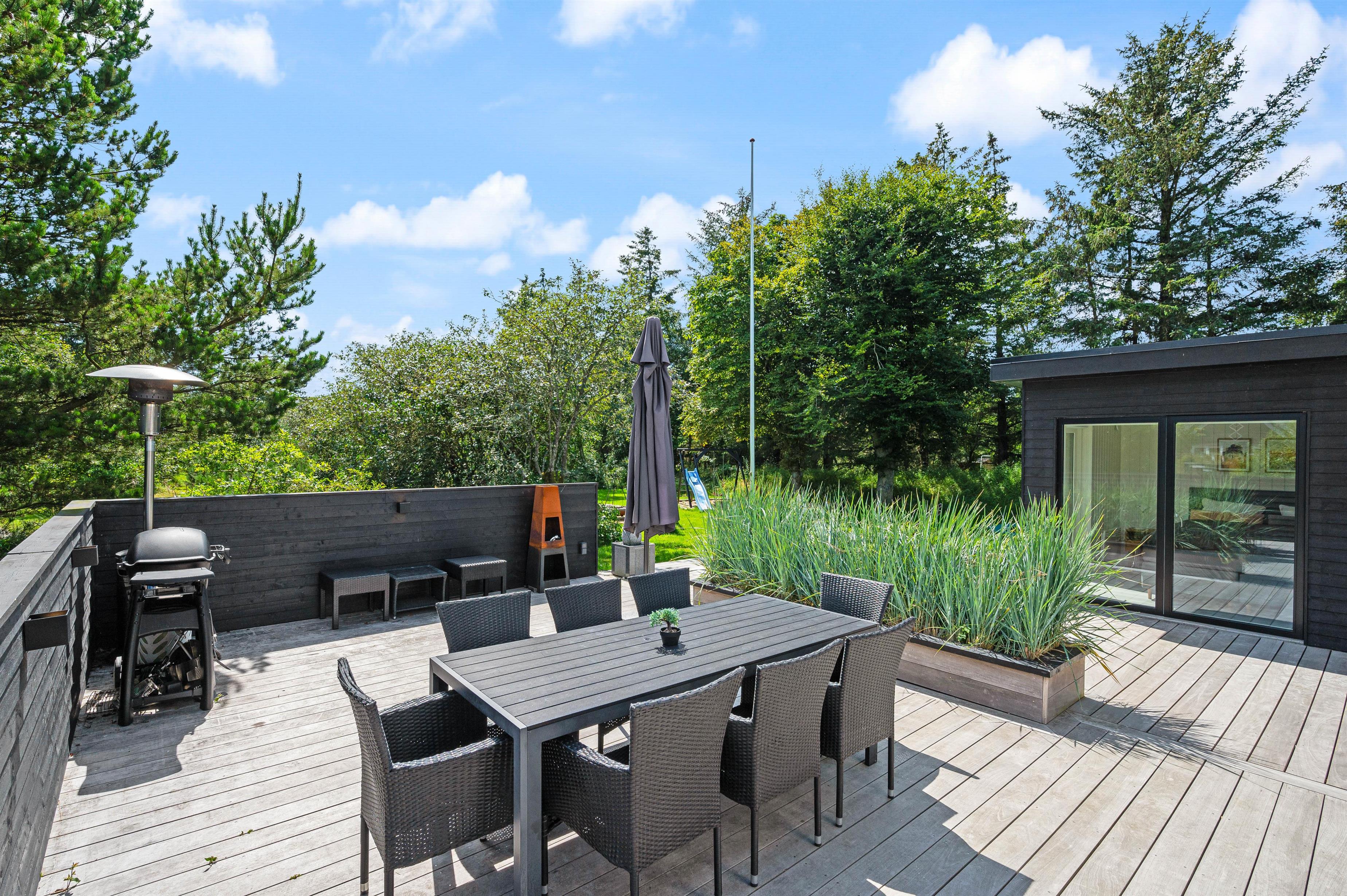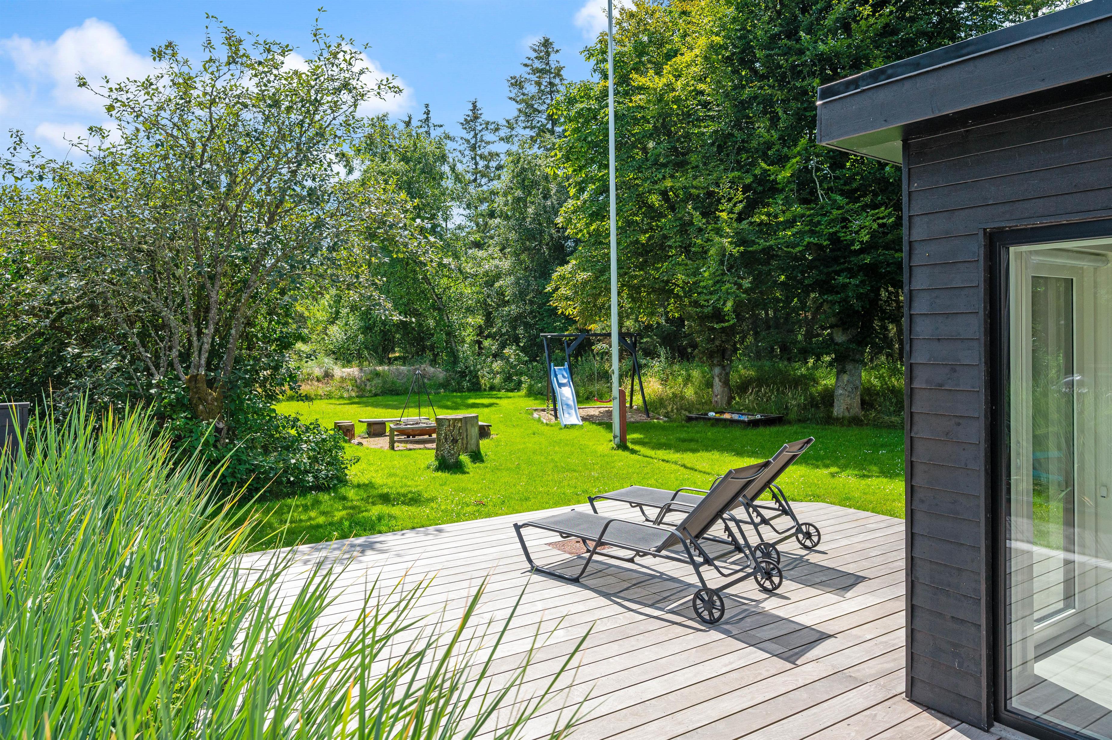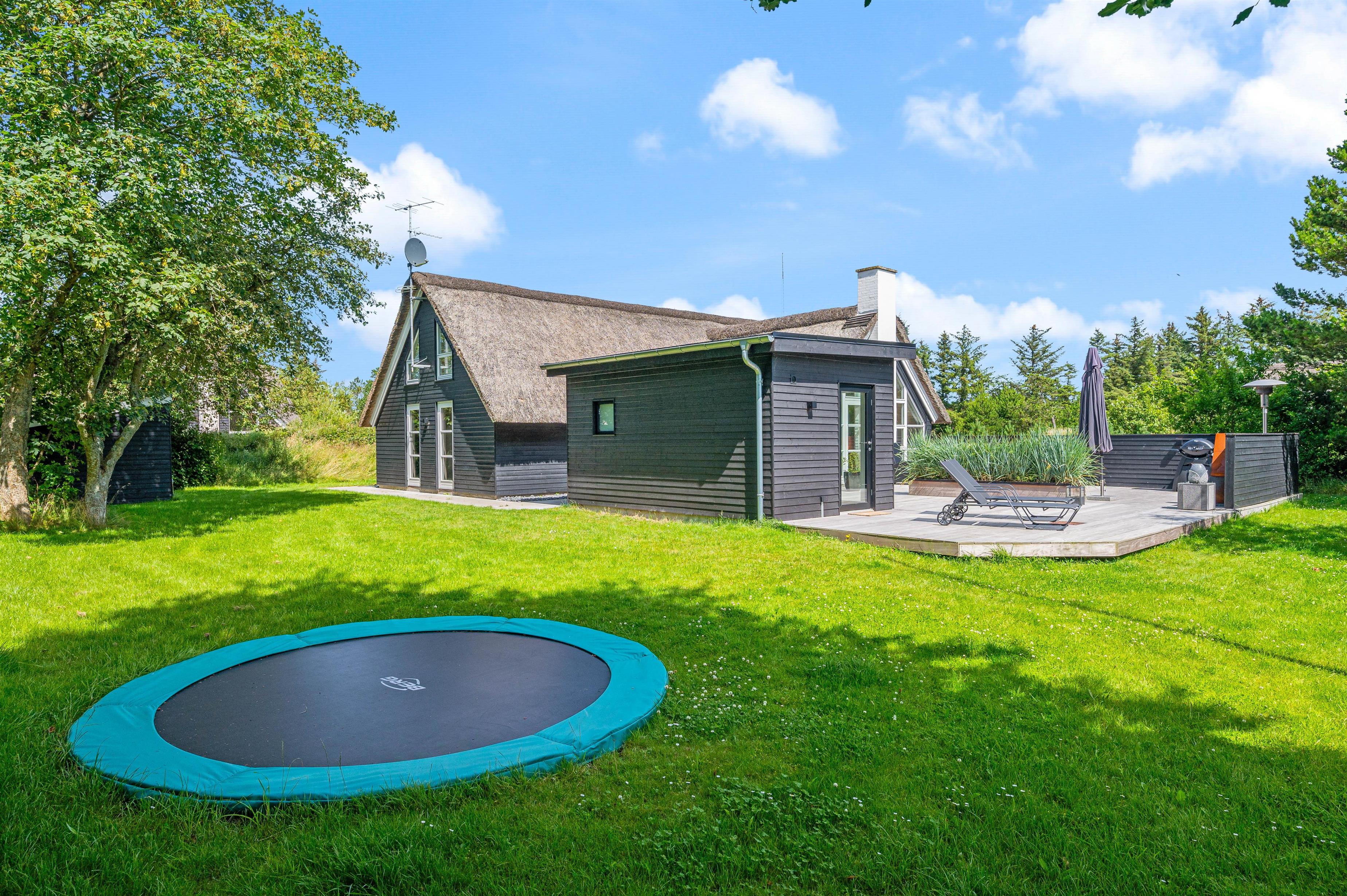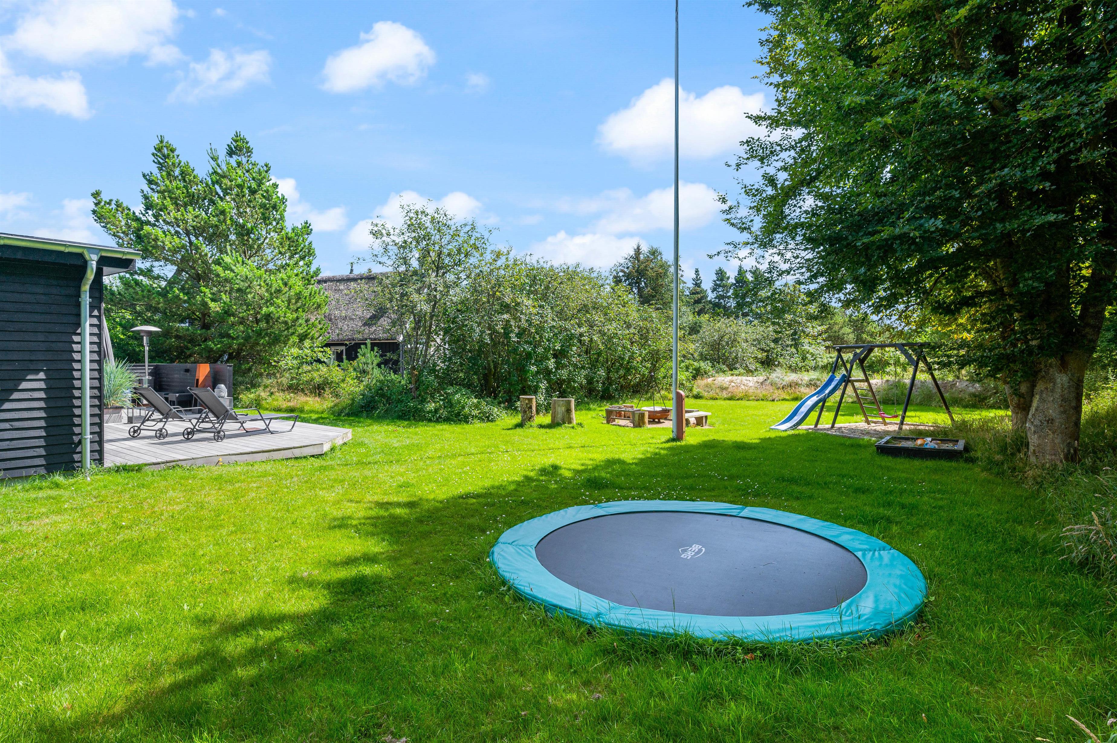 Har I lyst til udeleg, er der både bålplads, sandkasse, gynger og trampolin. Her kan børnene brænde energi af, hvis der er mere tilovers fra dagens aktiviteter, og plænen giver god plads til boldspil og leg. Den store træterrasse lægger op til samvær omkring havebordet, hvor også lidt lækkert fra grillen kan nydes, og ved havens andre hyggekroge kan I finde læ for vestenvinden.