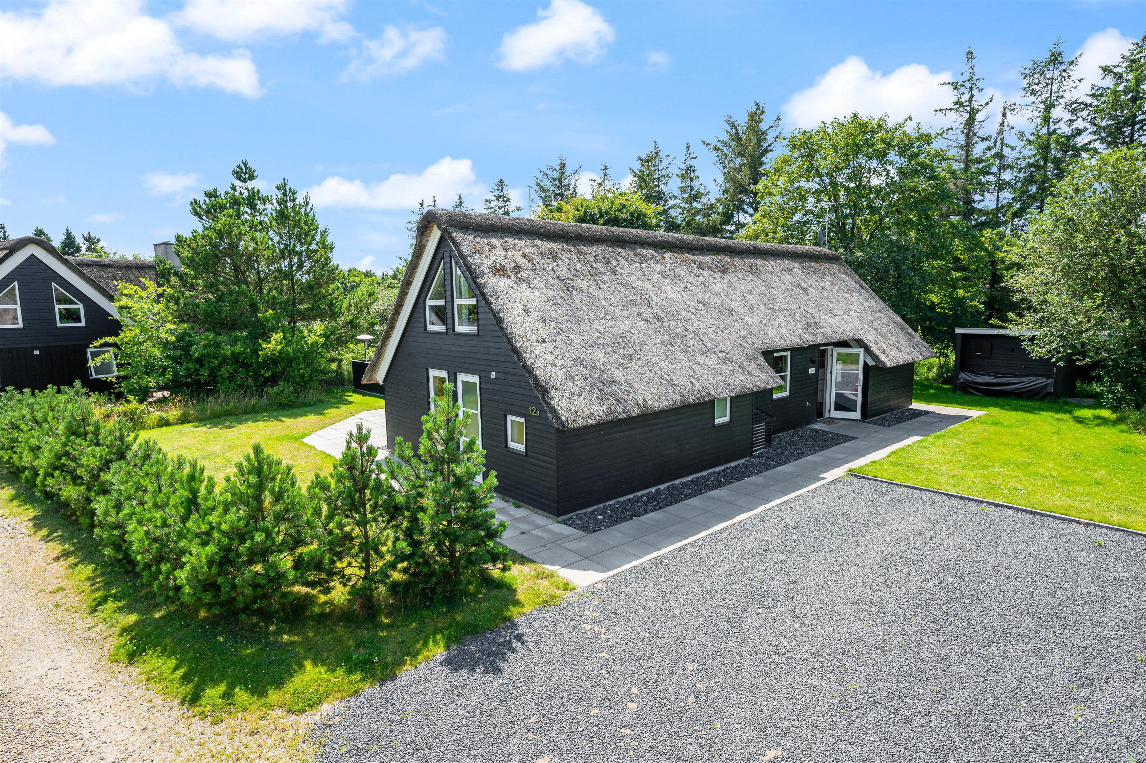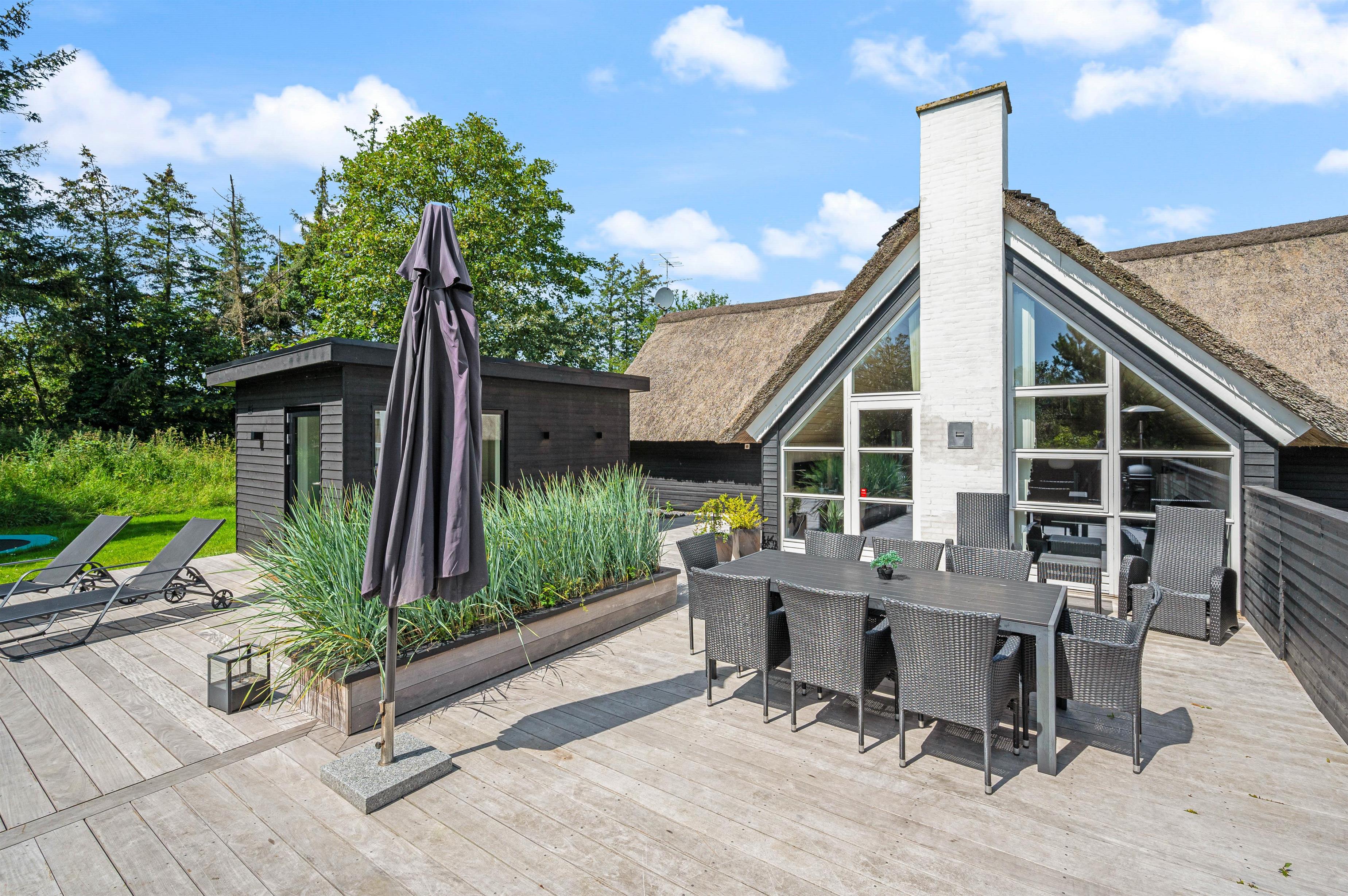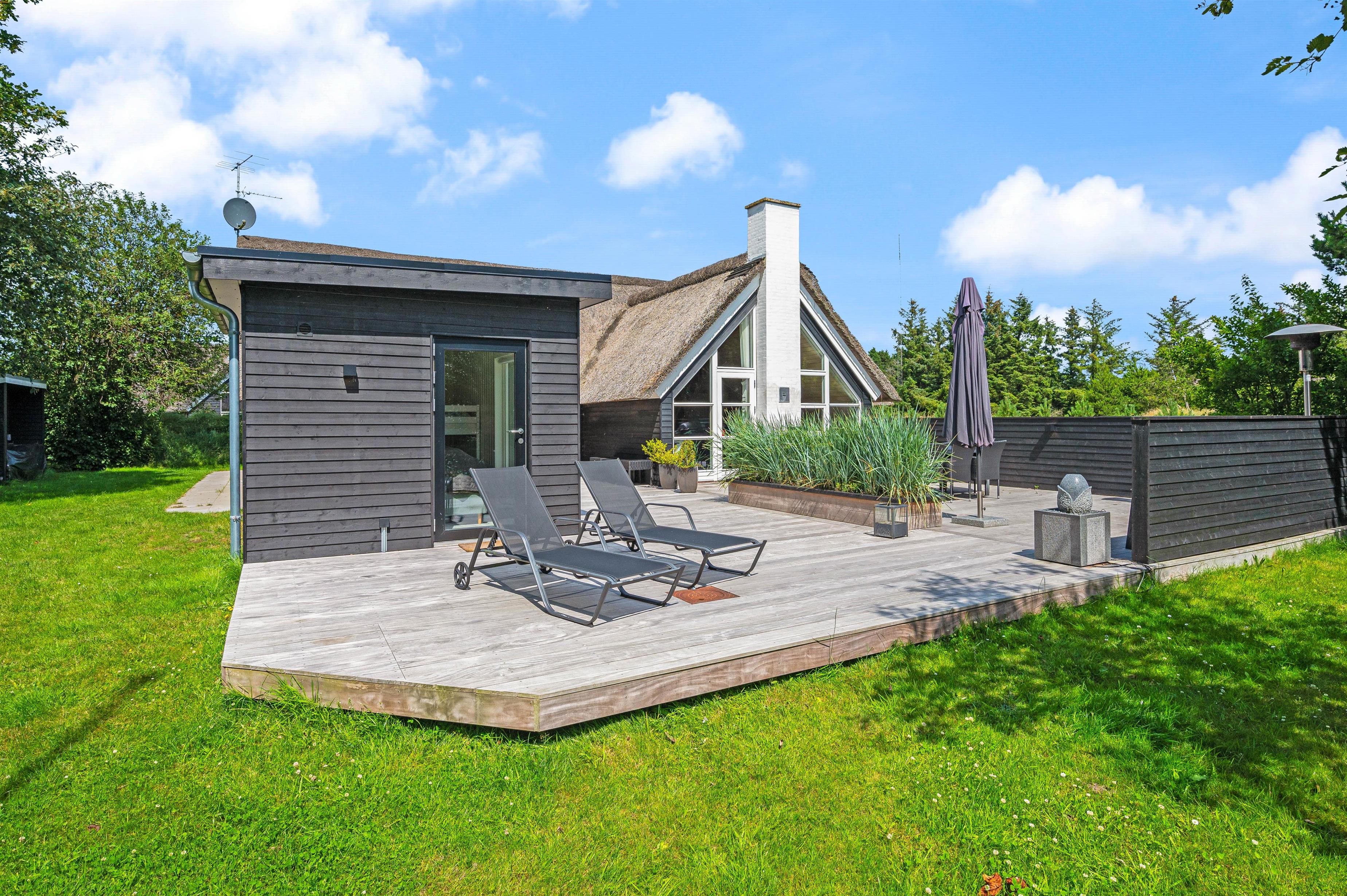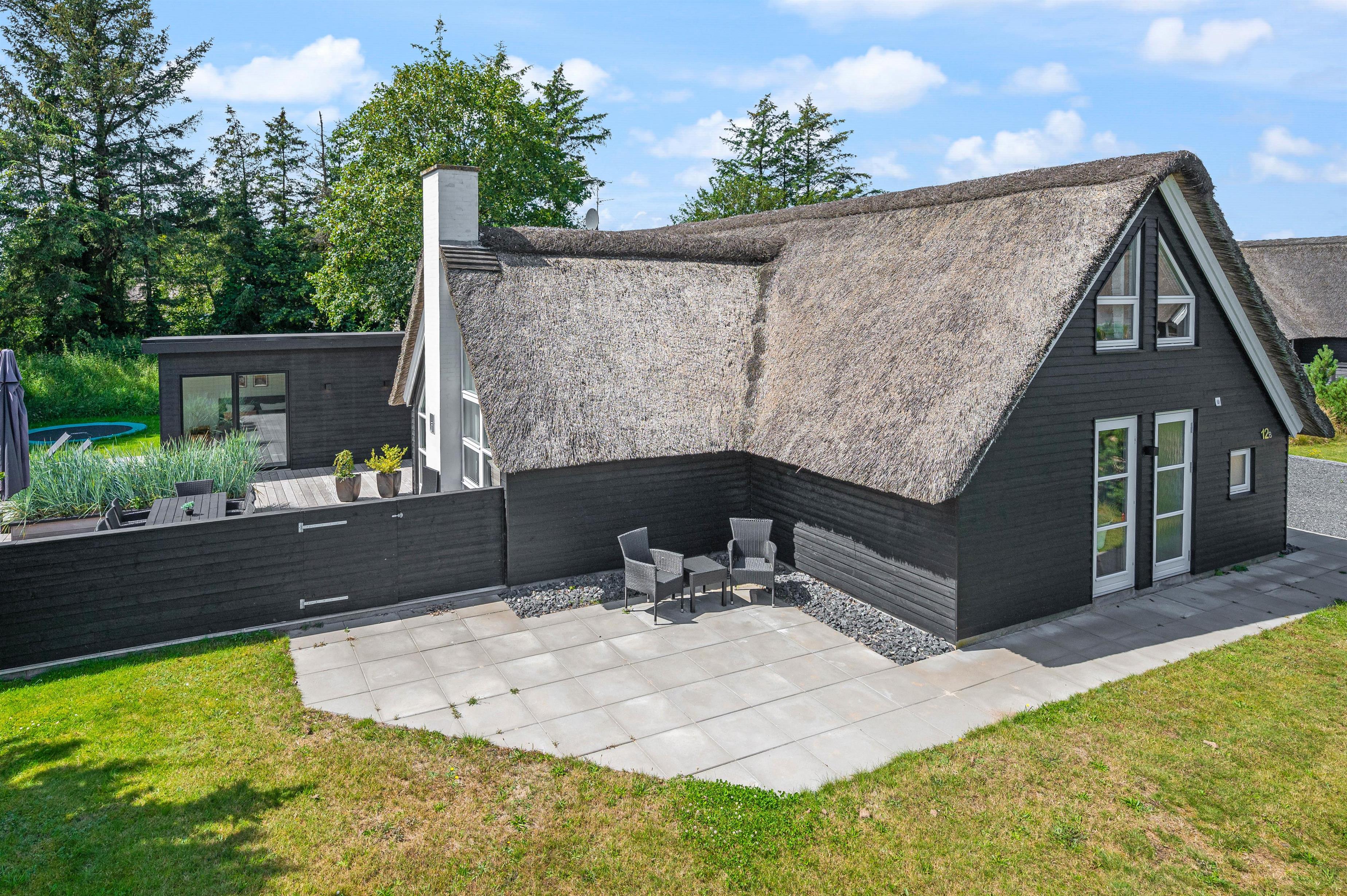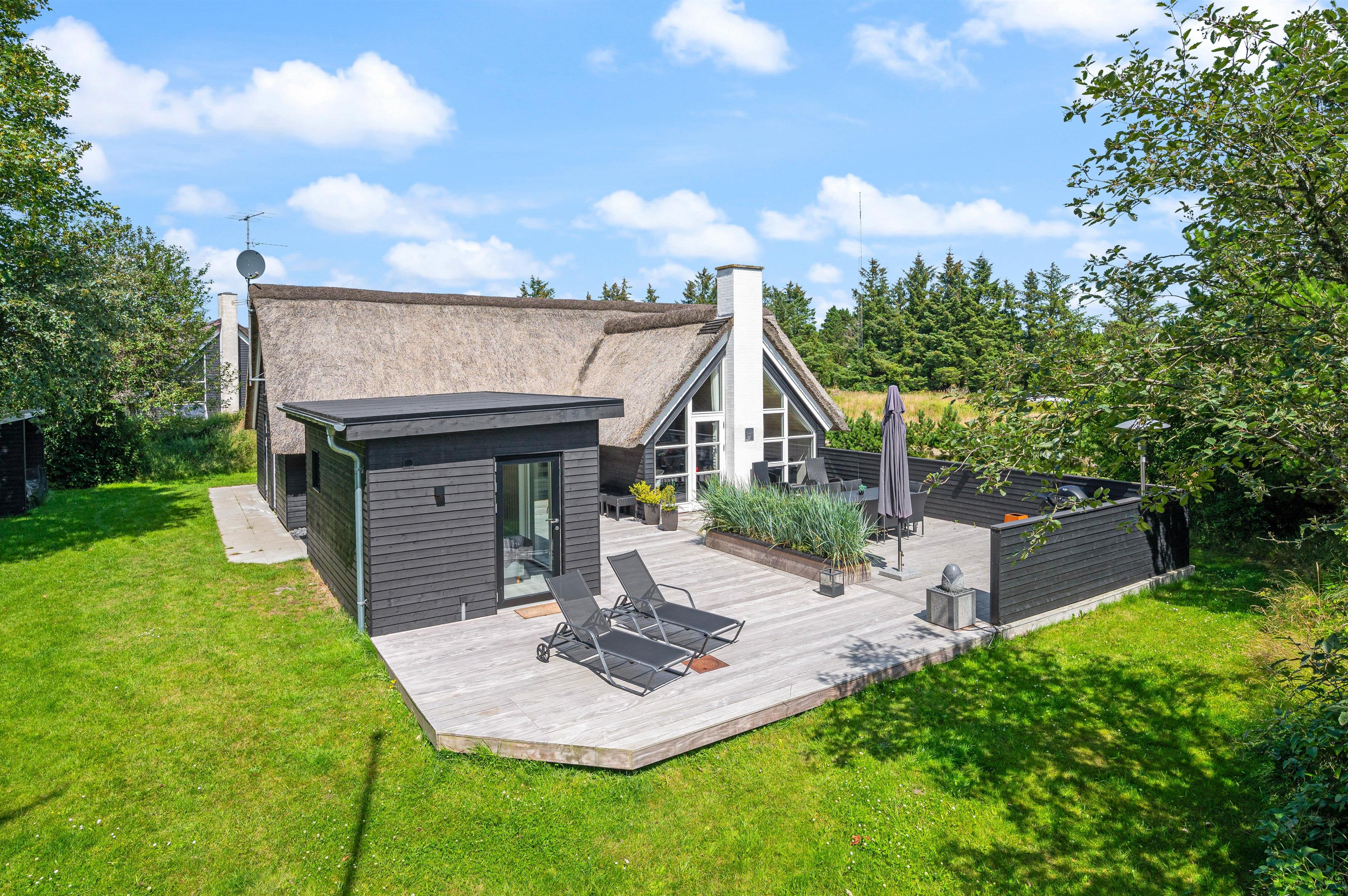 Et moderne stråtækt feriehus kalder på op til 8 feriegæster som står klar med veludstyret køkken i direkte sammenhæng med spisepladser og stilfuld stue. Gulvvarme, brændeovn og varmepumpe sørger for behagelig temperatur i det højloftede rum, og der er gjort plads til hygge og samvær for flere vennepar eller en større familie.