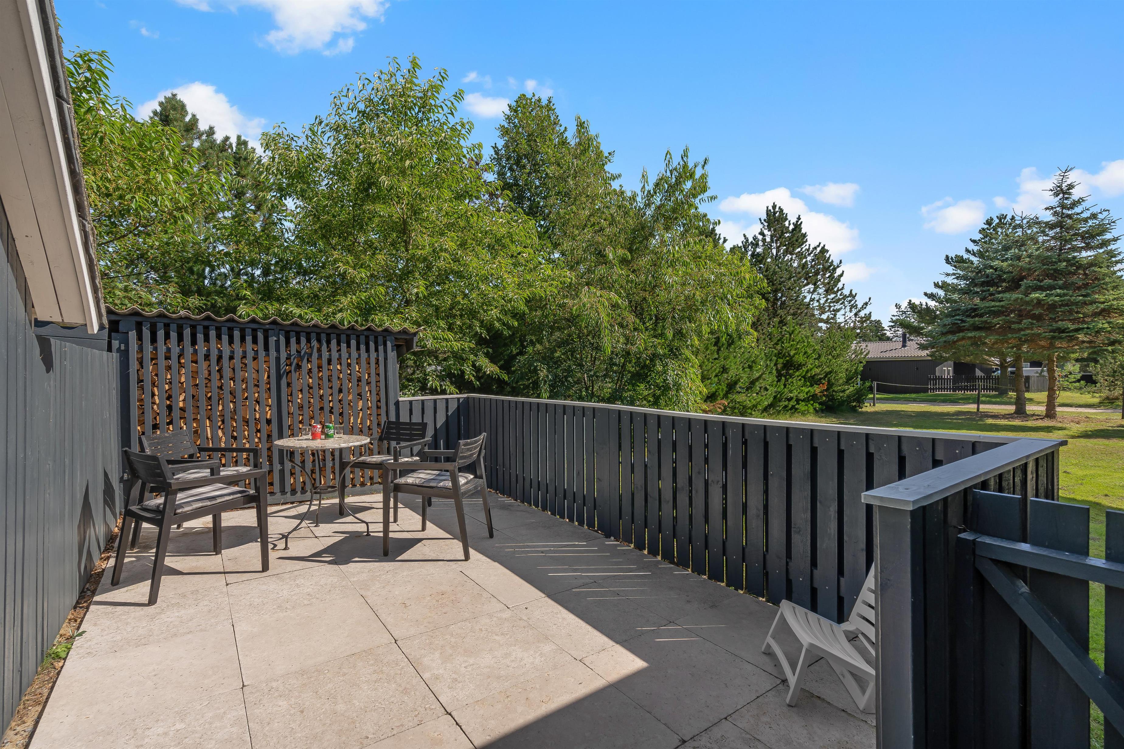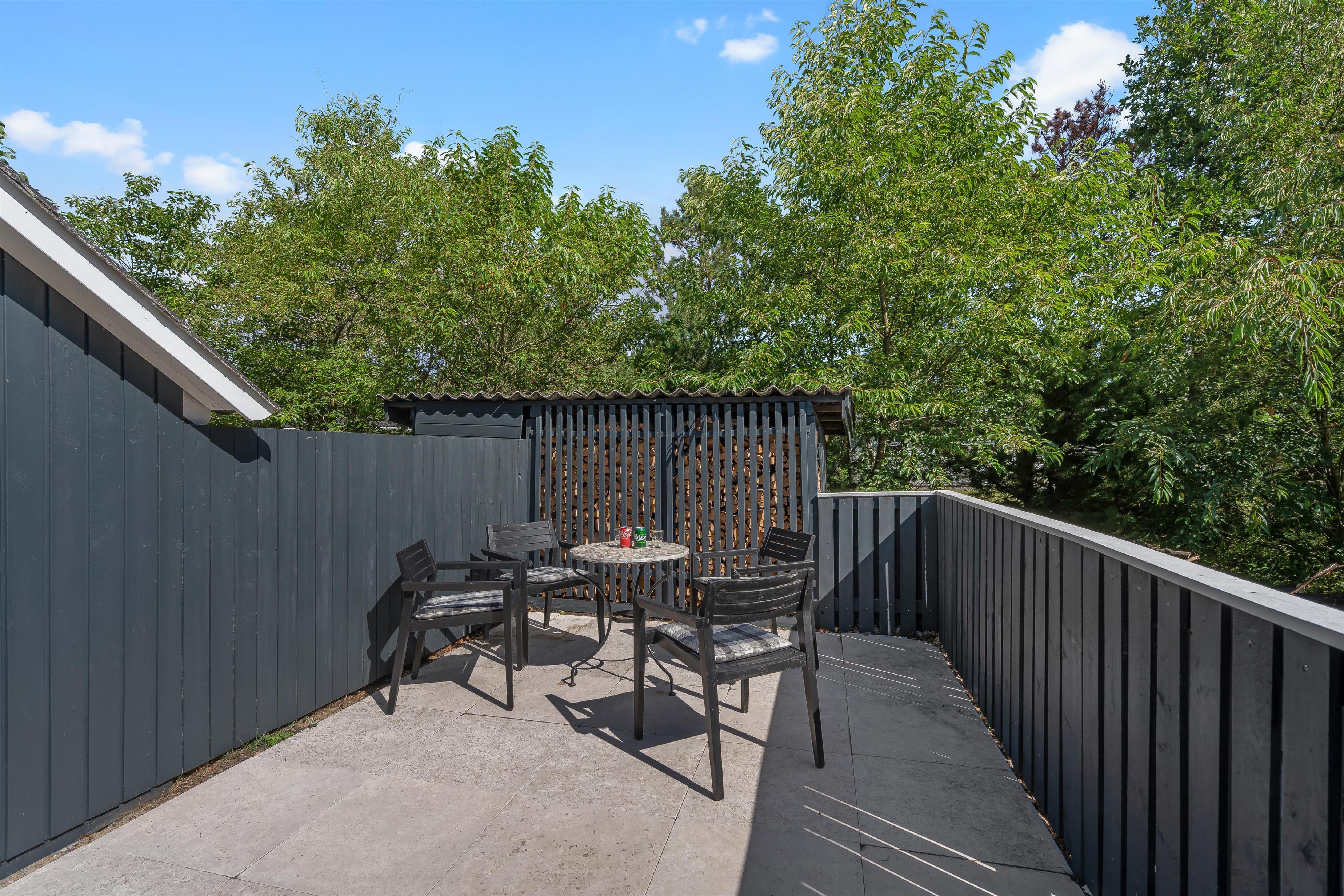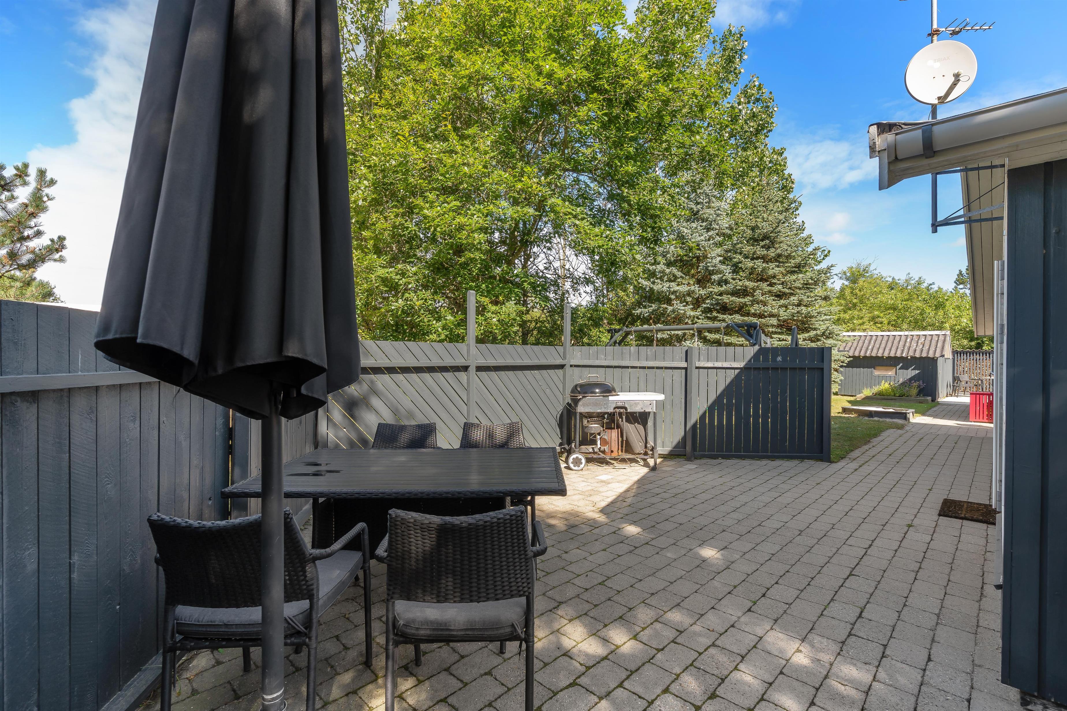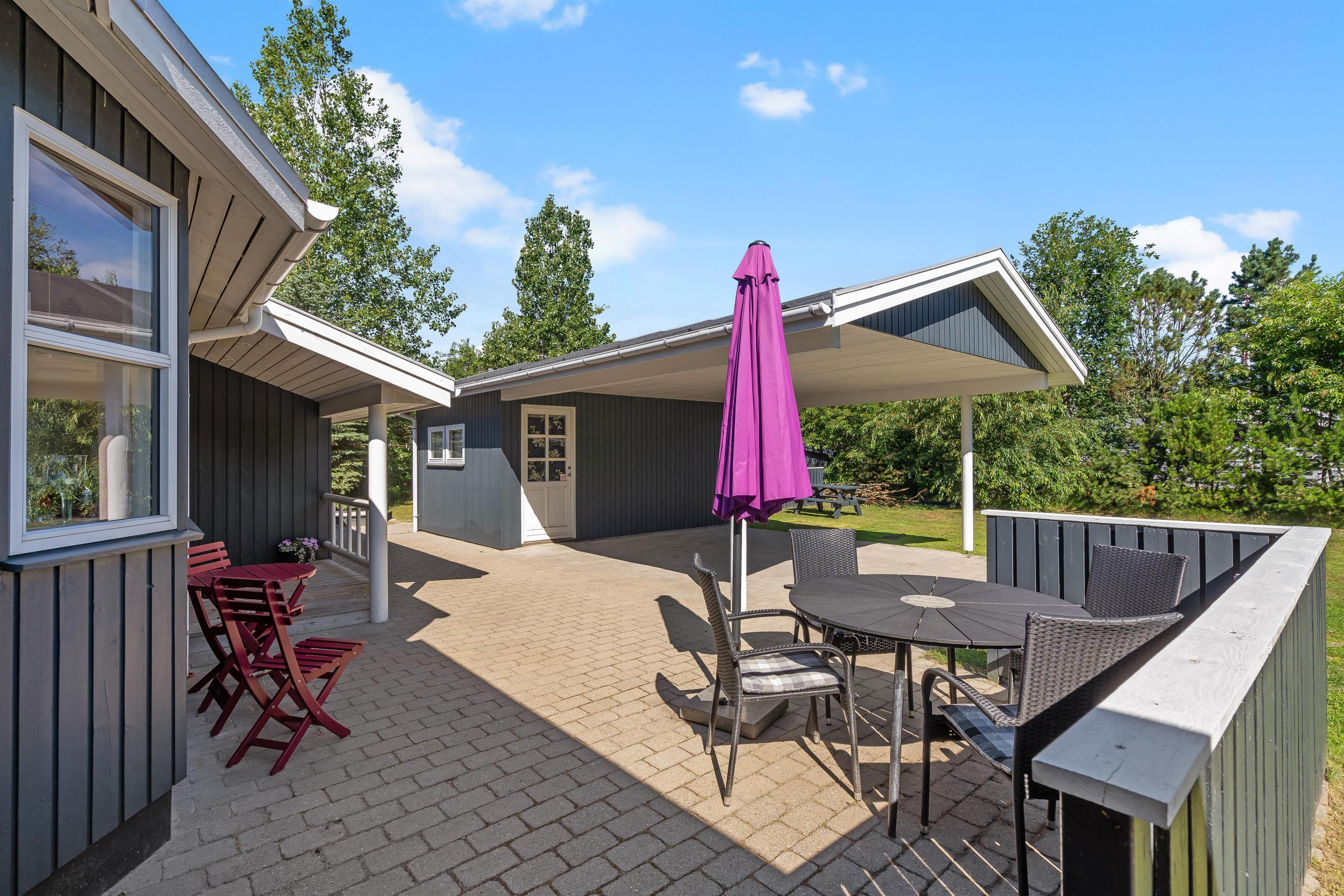 Når I har fået gummiben efter fodboldturneringen, kan I slappe af på sommerhusets store terrasse, som strækker sig fra den sydlige til den vestlige del af feriehuset. Her kan I altid finde en solstråle at slappe af i. Terrassen er afskærmet og delvist overdækket, så I der er mulighed for at kravle i skygge, hvis det bliver nødvendigt.