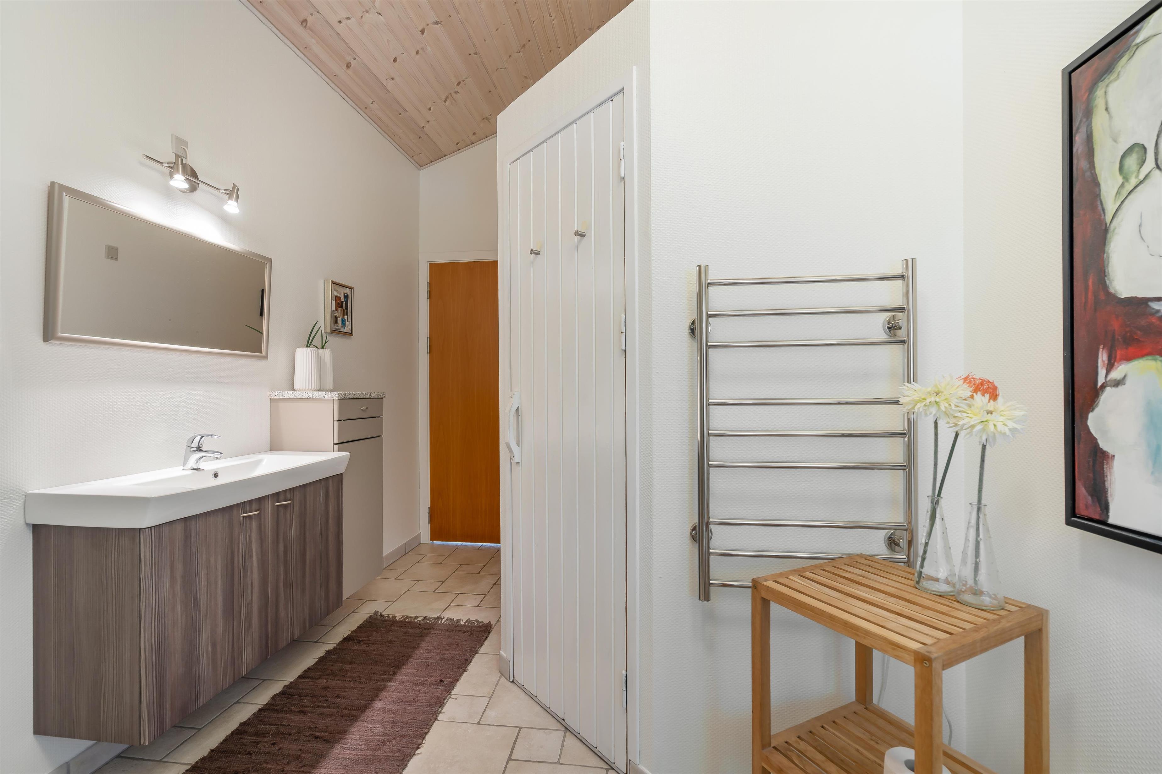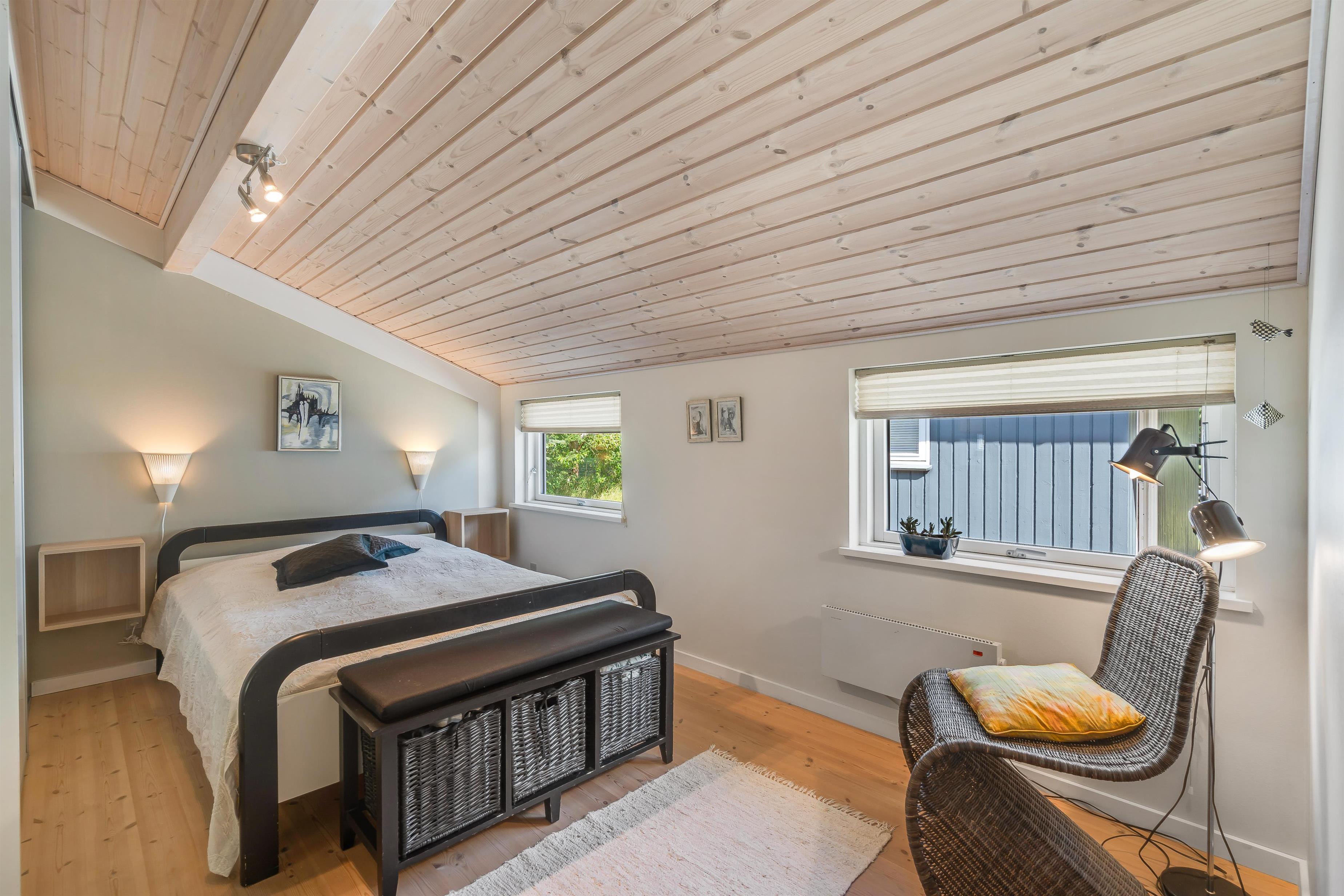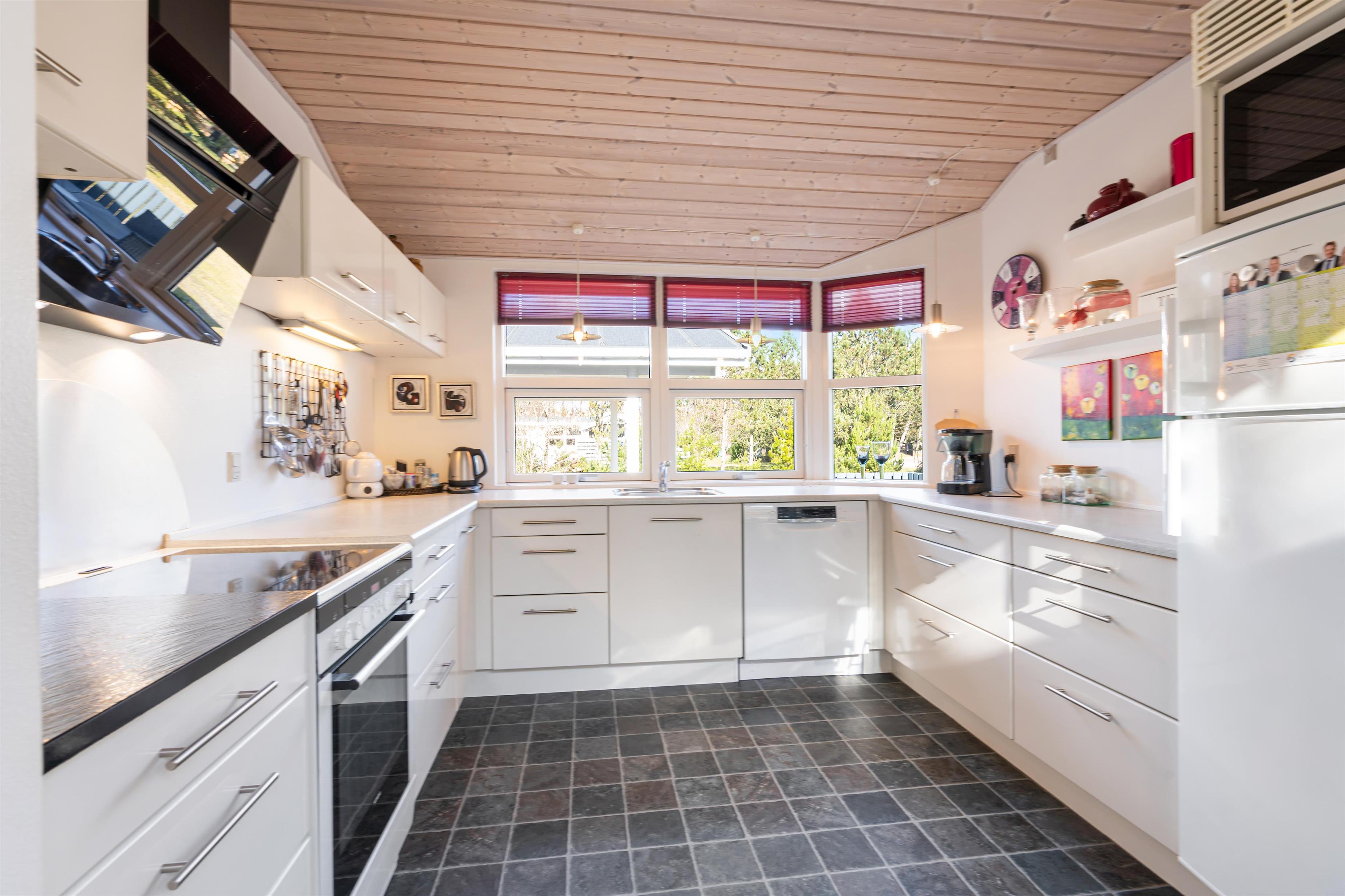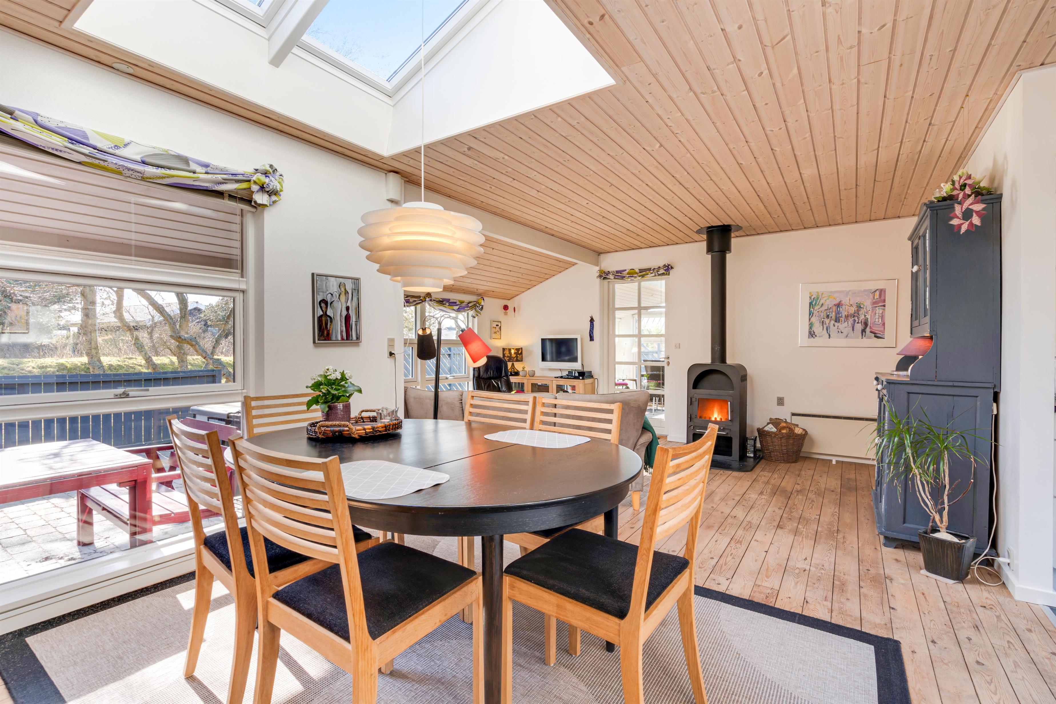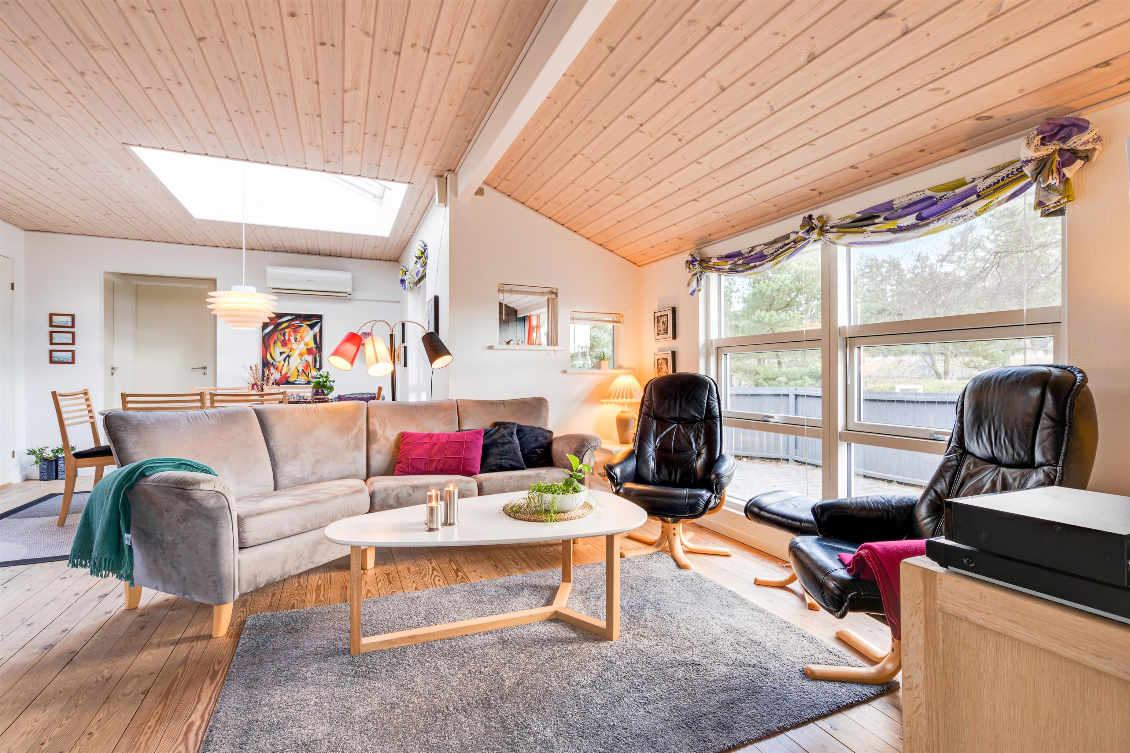 Sommerhuset er indrettet med stue og køkken-alrum i ét, så der er de bedste betingelser for socialt samvær og hygge foran brændeovnen. Over spisebordet er der et ovenlysvindue, som giver det flotteste lysindfald, når morgenmaden skal nydes. Desuden rummer sommerhuset en skøn udestue, og efter en gåtur i vestenvinden kan I med fordel smutte en tur i feriehusets dejlige sauna. Her kan I holde en lille ”wellness-eftermiddag”, læne jer tilbage og nyde ferien i fulde drag. Derudover indeholder sommerhuset en økonomisk varmepumpe, der sørger for varmen uden de store omkostninger.