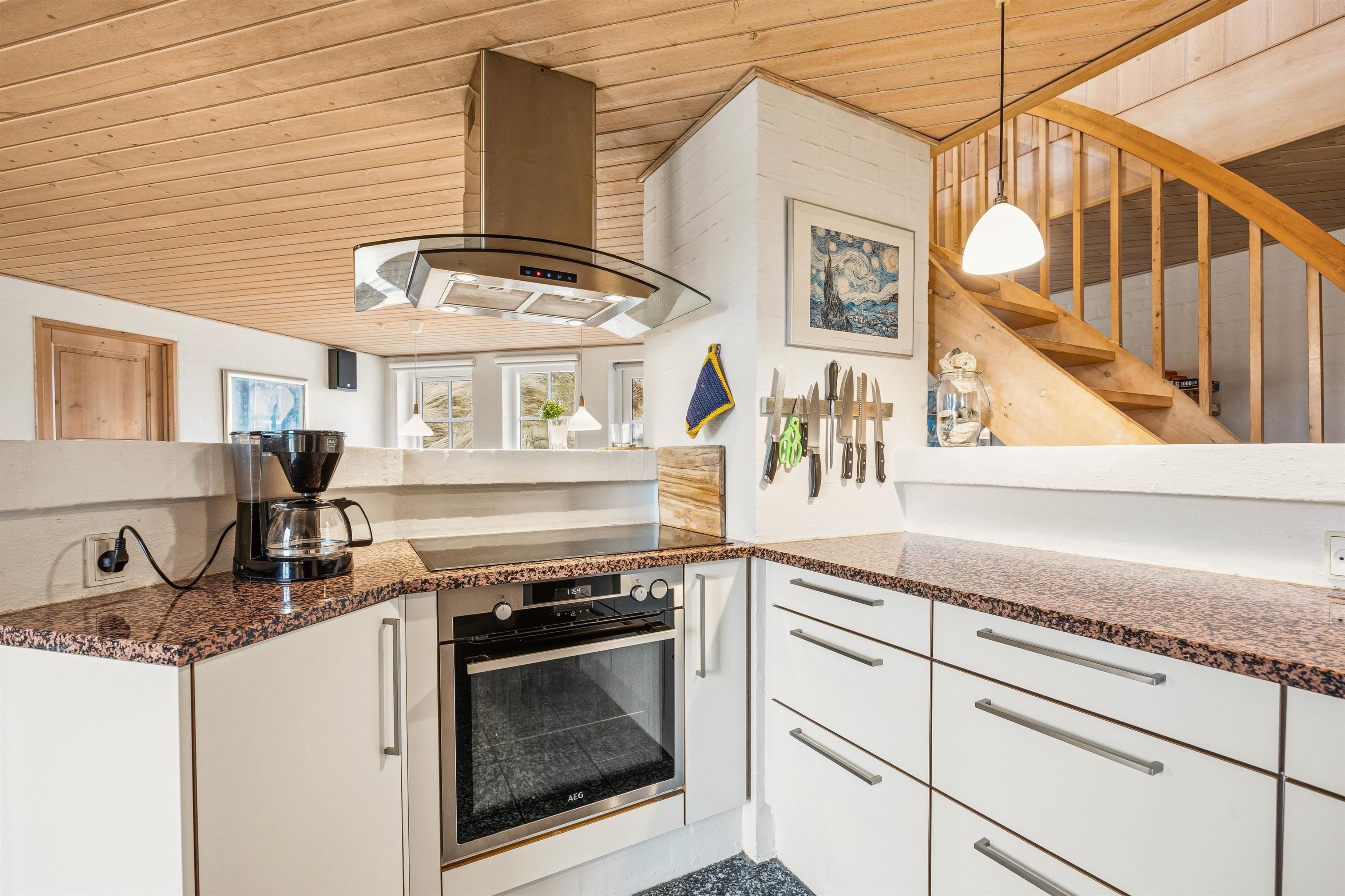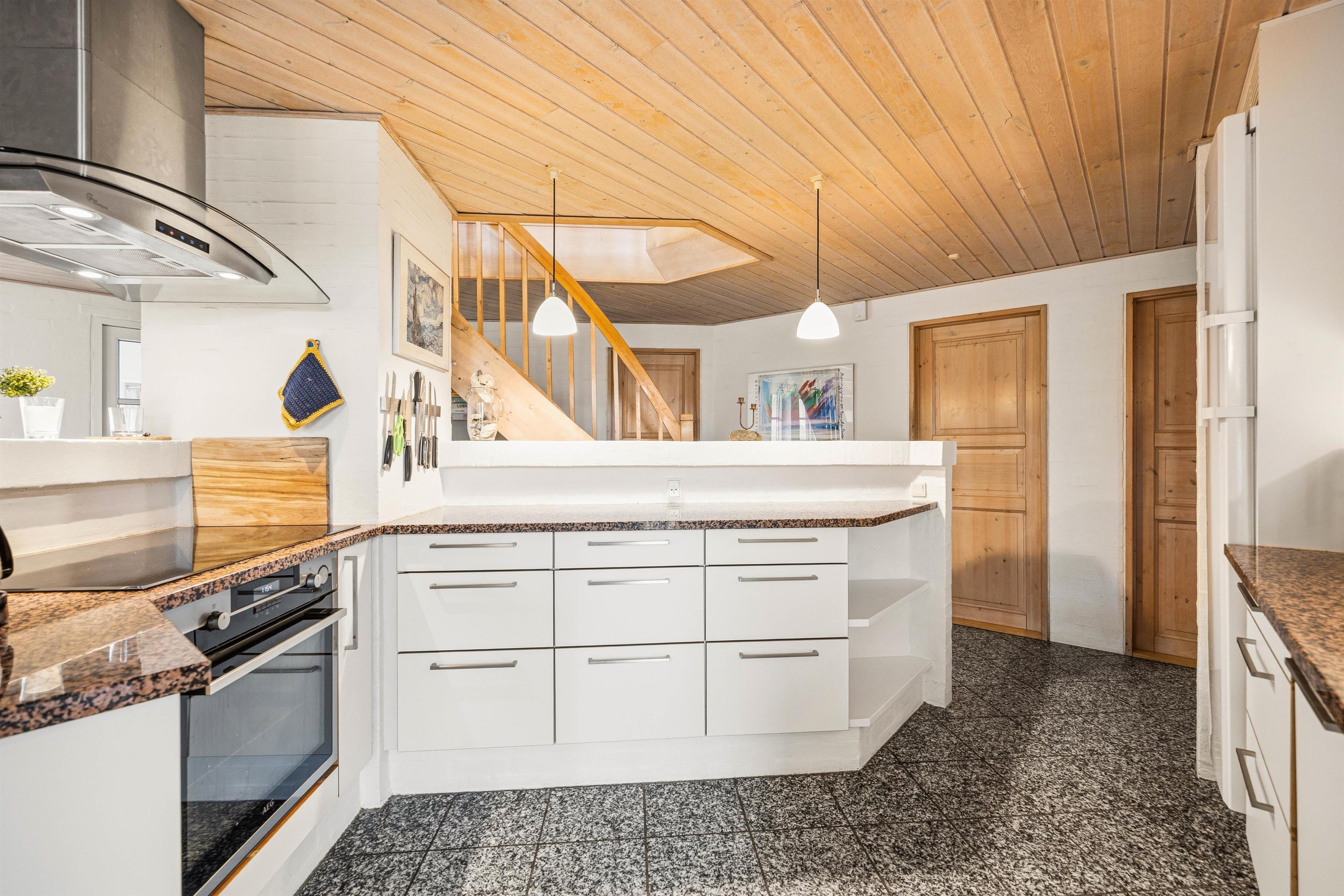 Køkken og spisestue er i åben forbindelse og udgør på den måde ét stort rum, hvor hele familien kan samles omkring fælles madlavning, brætspil eller en god film. Køkkenet er lyst og åbent med god plads til at kokkerere, og i spisestuen kan I nyde hinandens samvær foran den varme brændeovn.