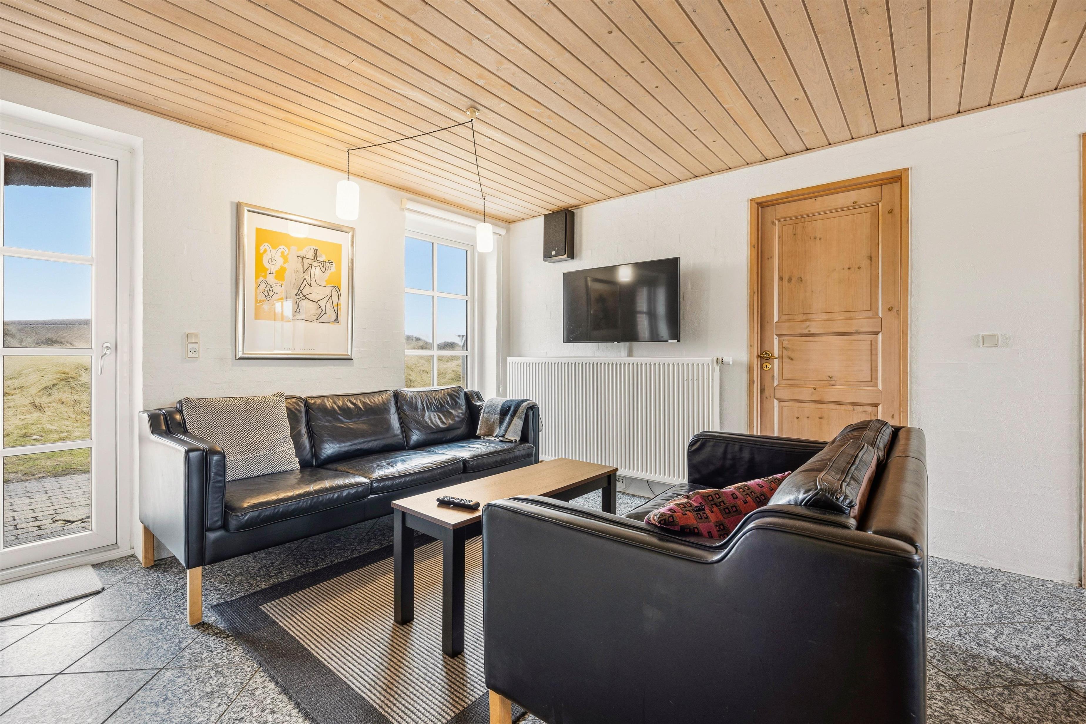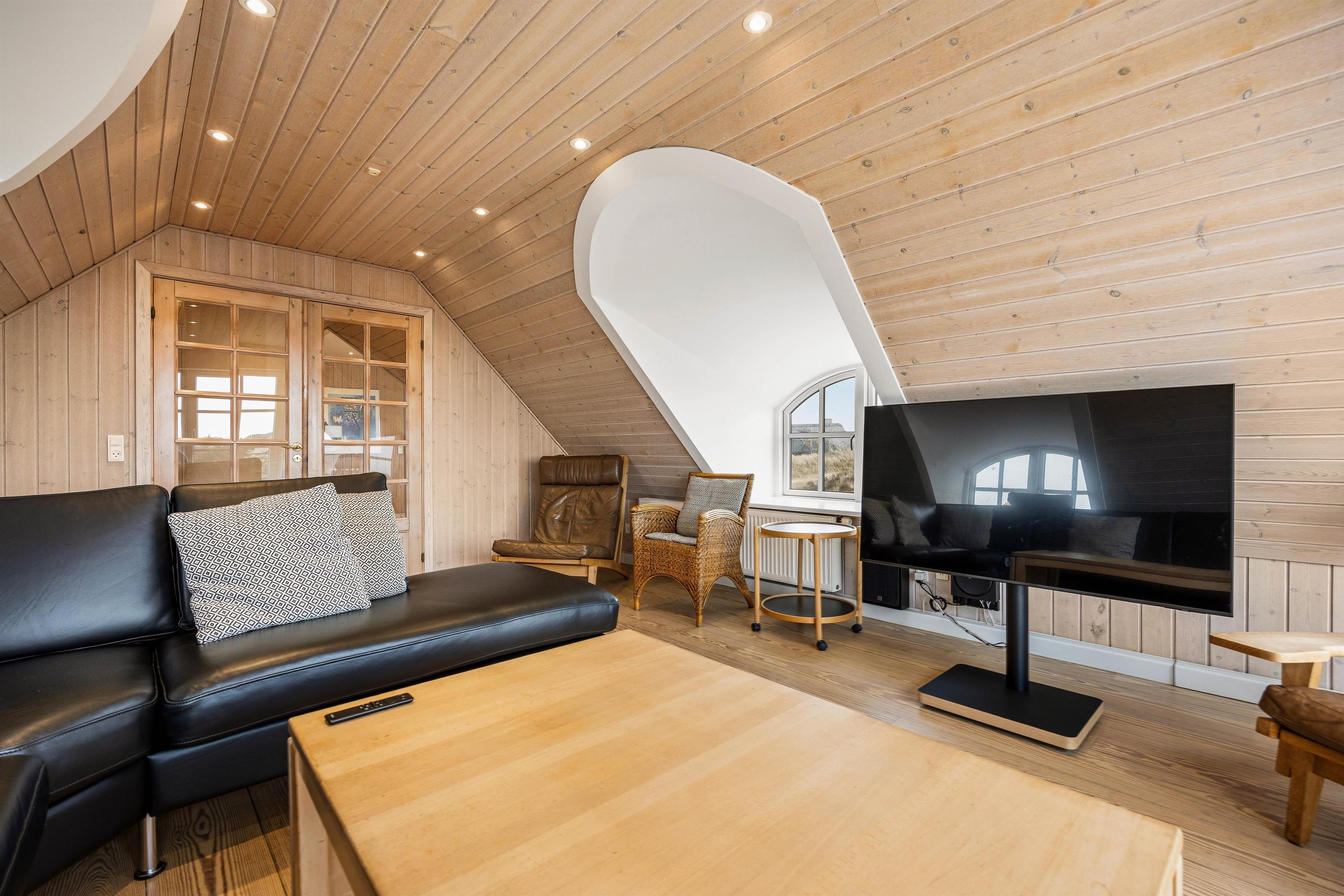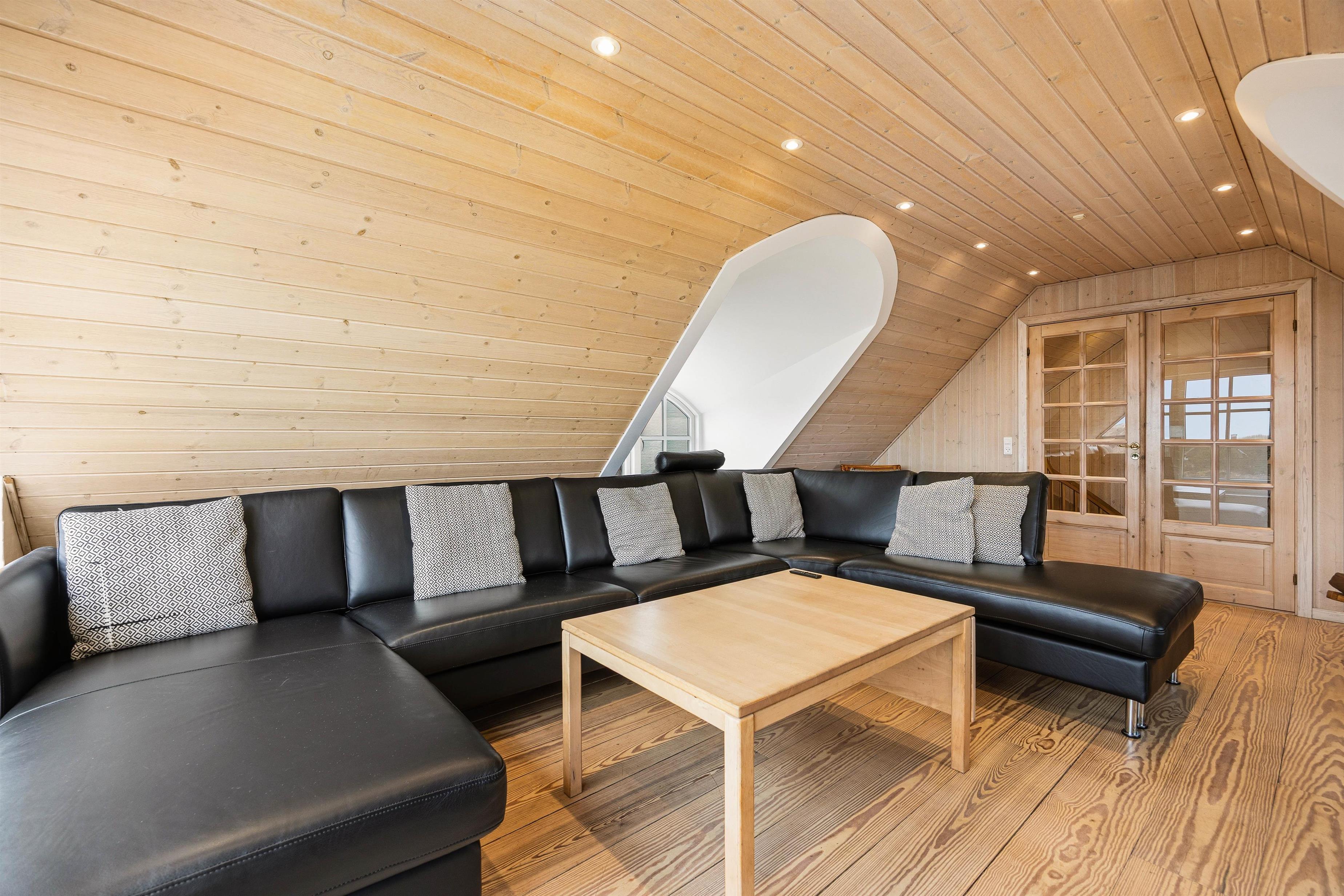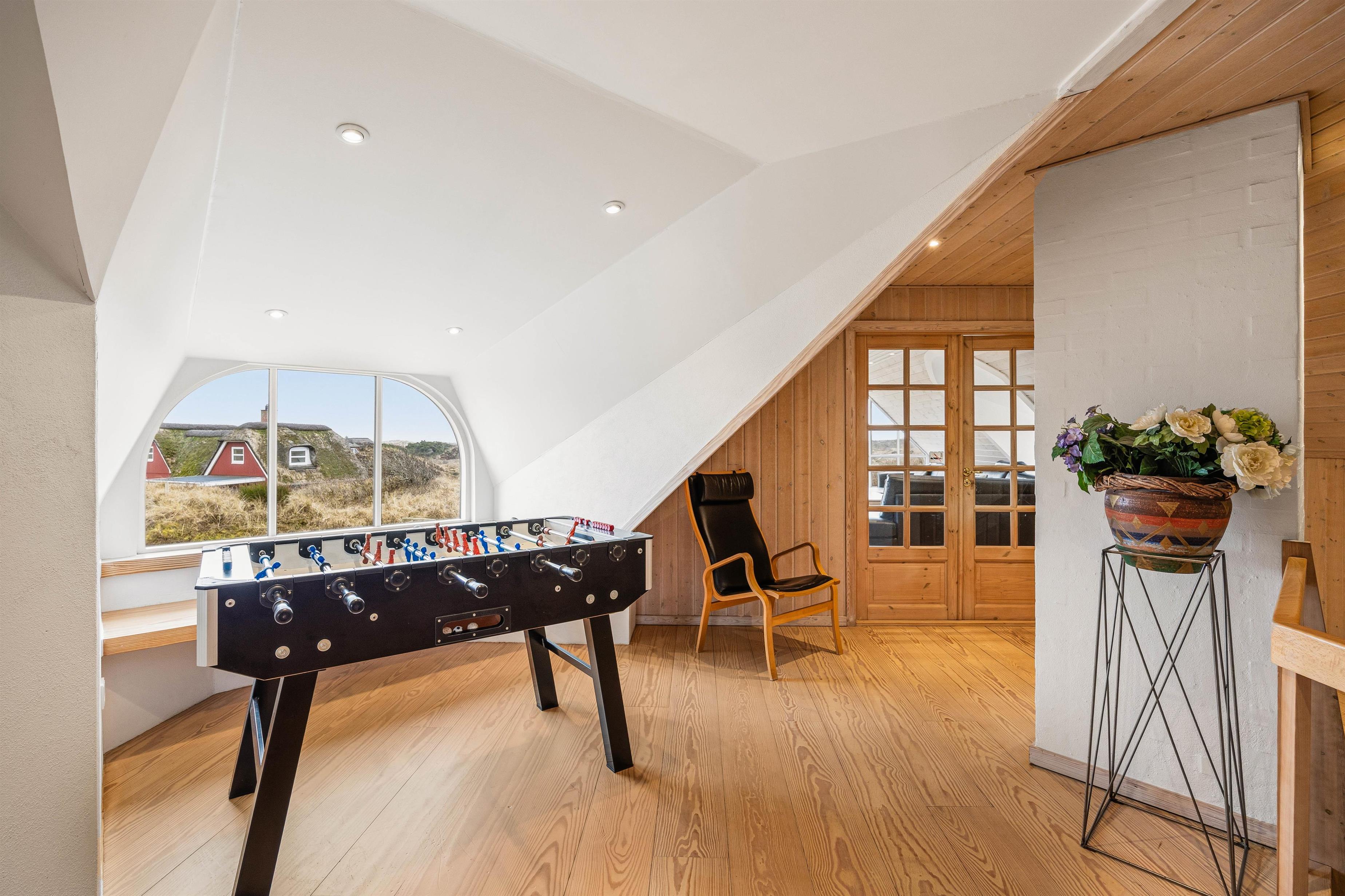 På første etage finder I endnu én opholdstue, hvor den smukke udsigt gør rummet helt unikt. Det store vinduesparti sørger både for en fantastisk panoramaudsigt ud over Blåvands natur og ikke mindst et dejligt lysindfald. På første etage finder I også et bordfodboldbord, og det er jo altid sjovt at udfordre hinanden til en omgang bordfodbold.