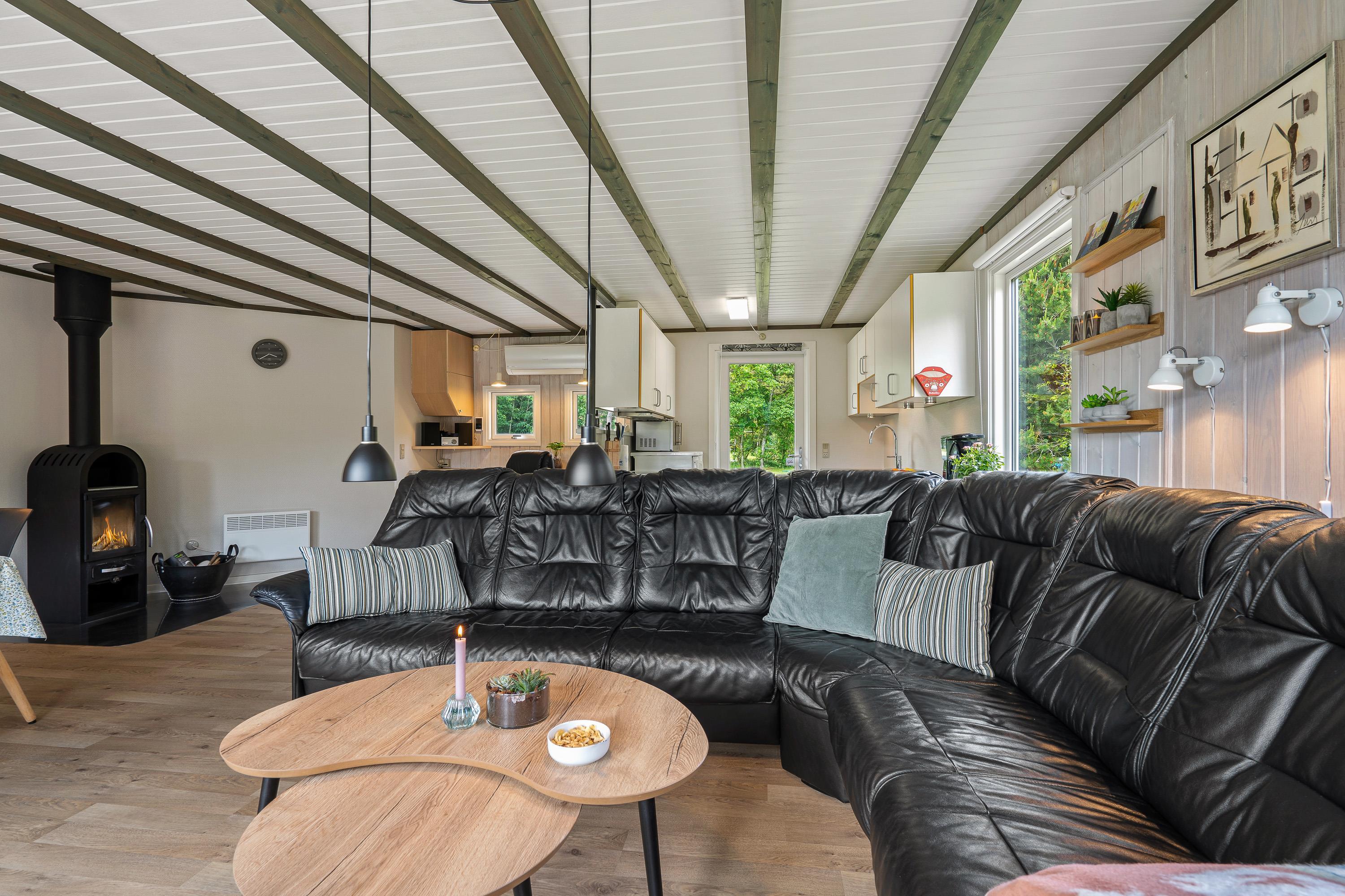 De fleste timer af ferien kommer I til at bruge i sommerhusets samlingspunkt – den hyggelige stue, der er kombineret med køkkenet. I stuen er der i 2021 monteret nyt gulv og ny brændeovn, så feriehuset er parat til at sørge for en god ferie til jer!