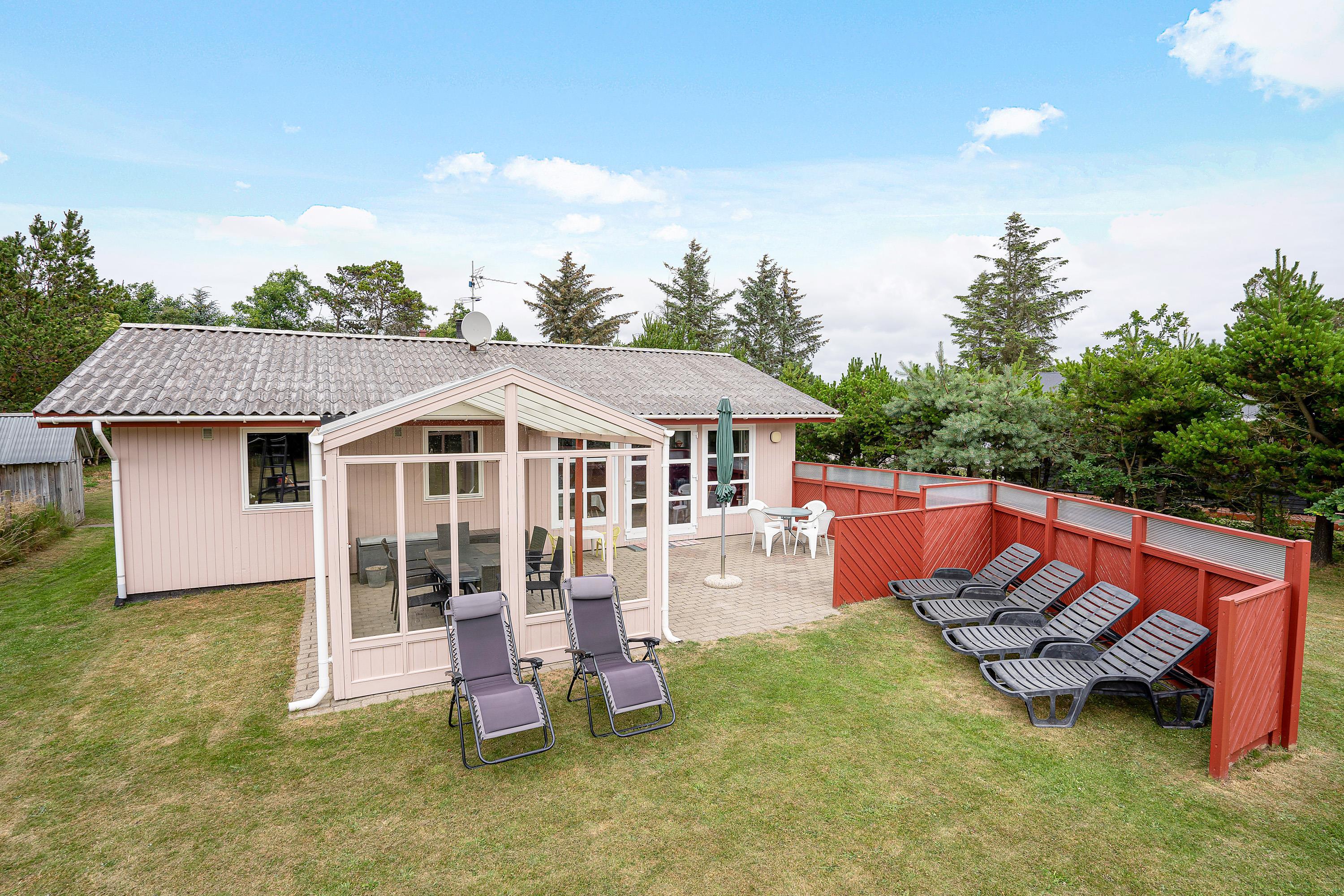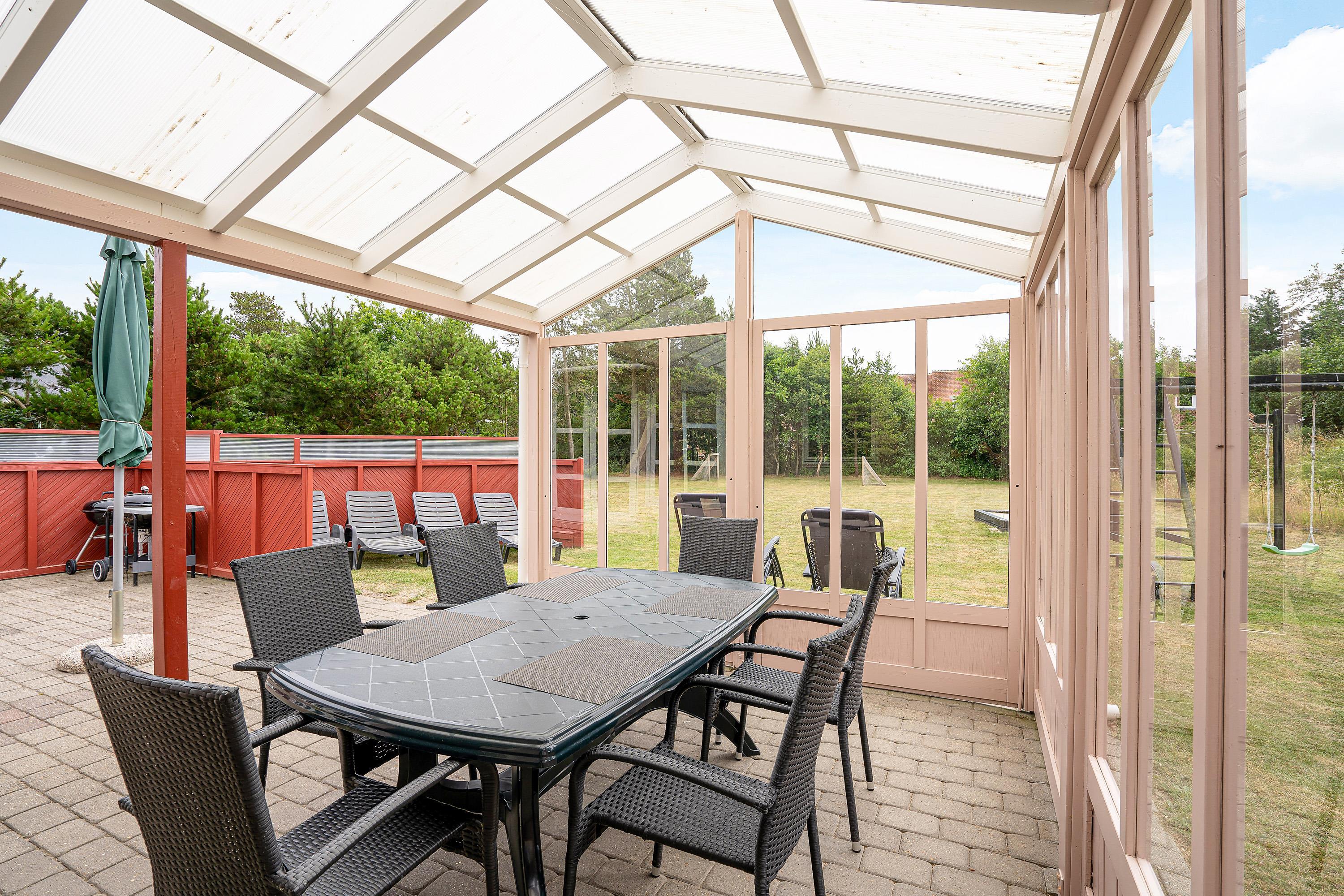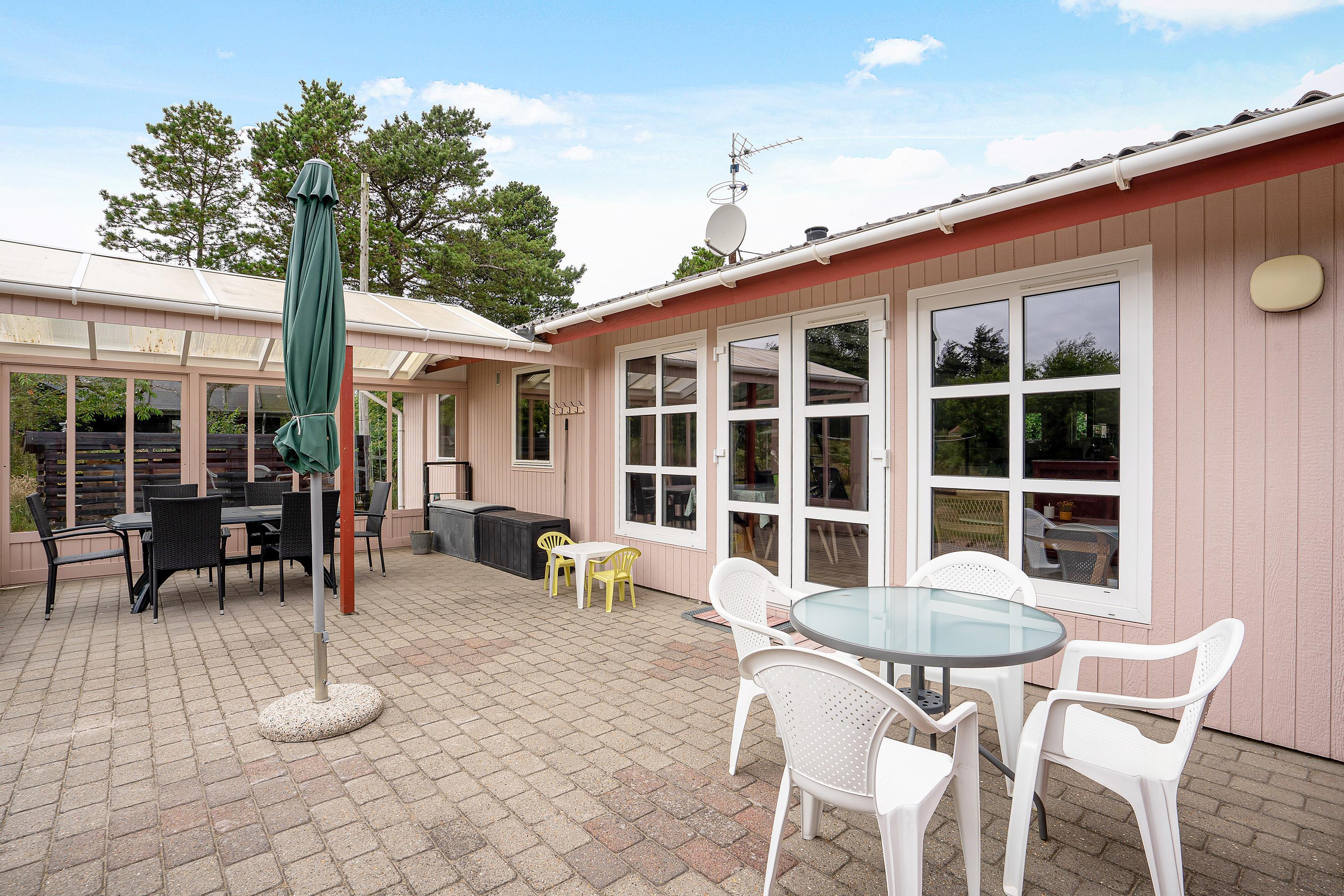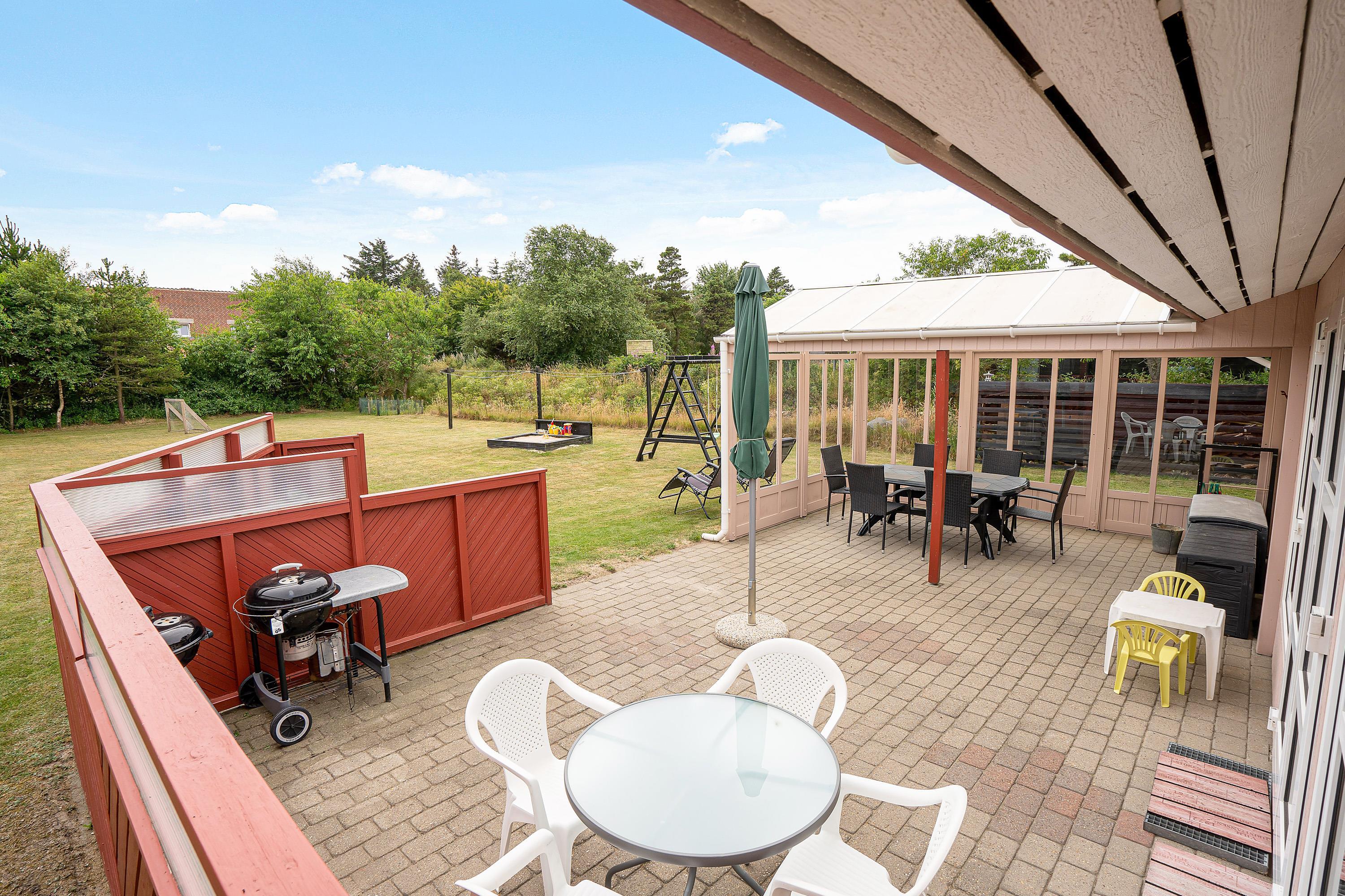 Når I skal se til, mens børnene leger, kan I med fordel gøre det fra sommerhusets sydvendte terrasse. Her kan I finde solens stråler det meste af dagen, og det er det perfekte sted at grille et lækkert aftenmåltid. Desuden vil I også møde en flot udestue, hvor I kan nyde følelsen af at være udendørs - uanset vejret.