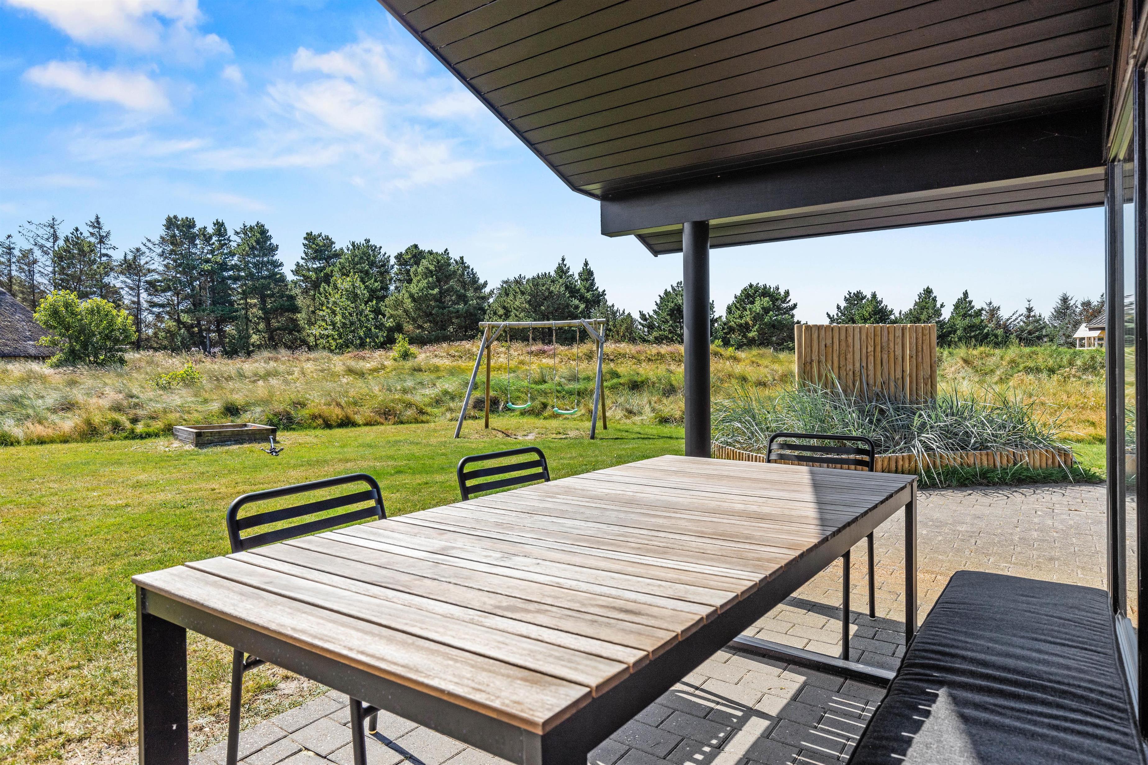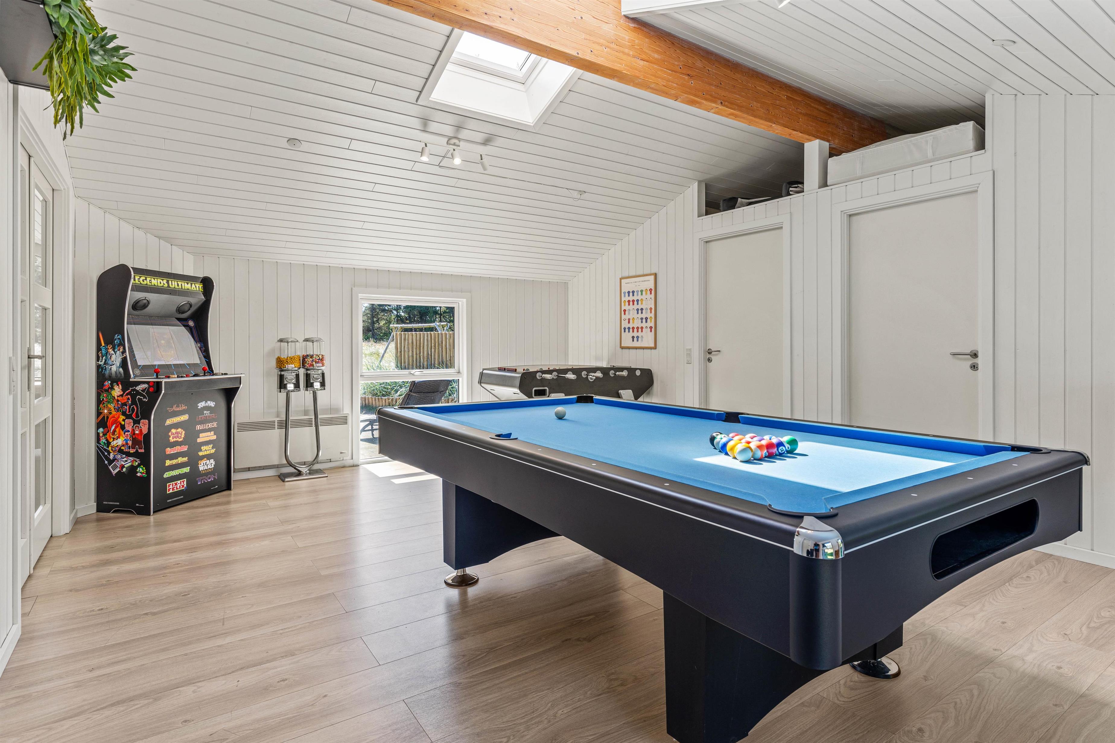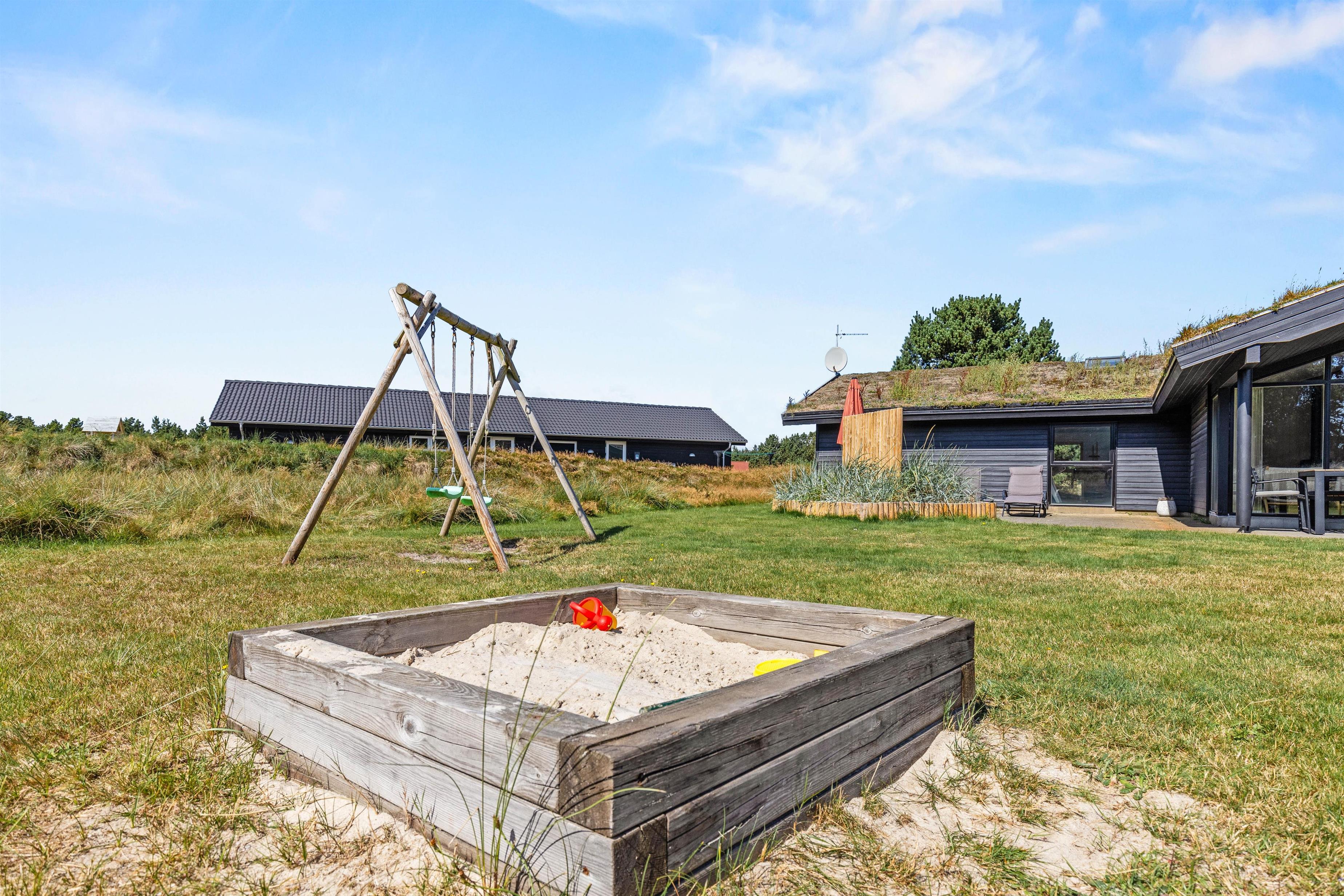 Sommerhuset tilbyder en bred vifte af faciliteter til både afslapning og aktivitet, og med både sauna og standspa er der rig mulighed for luksuriøs selvforkælelse efter en lang dag. For de mere energiske byder aktivitetsrummet på underholdning i form af poolbillard og bordfodbold. Børnene kan lege frit og fantasifuldt på den store, grønne plæne, hvor gynge, sandkasse og trampolin indbyder til timevis af leg og sjov. På den hyggelige, overdækkede terrasse kan I tænde op i grillen, lægge et par saftige bøffer på risten og nyde lange, stemningsfulde aftener under den åbne, blå himmel.