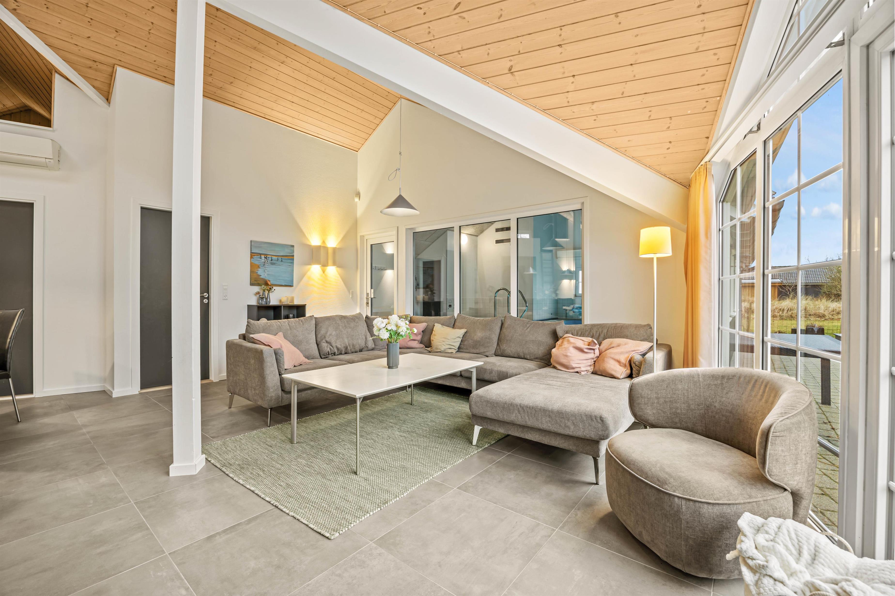 De store vinduespartier skaber et skønt lysindfald i køkken/alrummet med det imponerende loft, så her vil det selv på mørke vinterdage være en daglig glæde at samles omkring spisebordet og høre om hinandens ferieoplevelser over skøn feriemad.