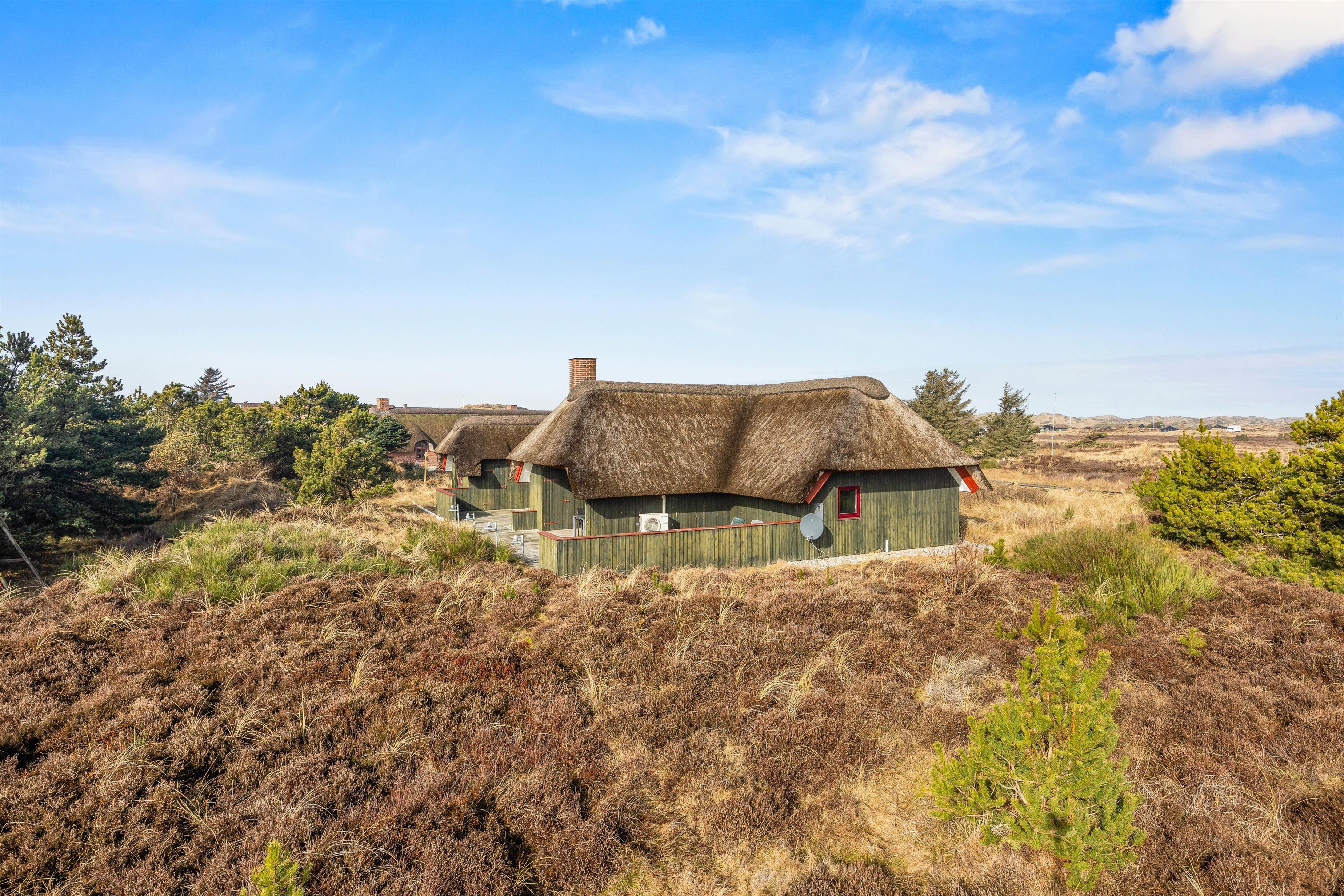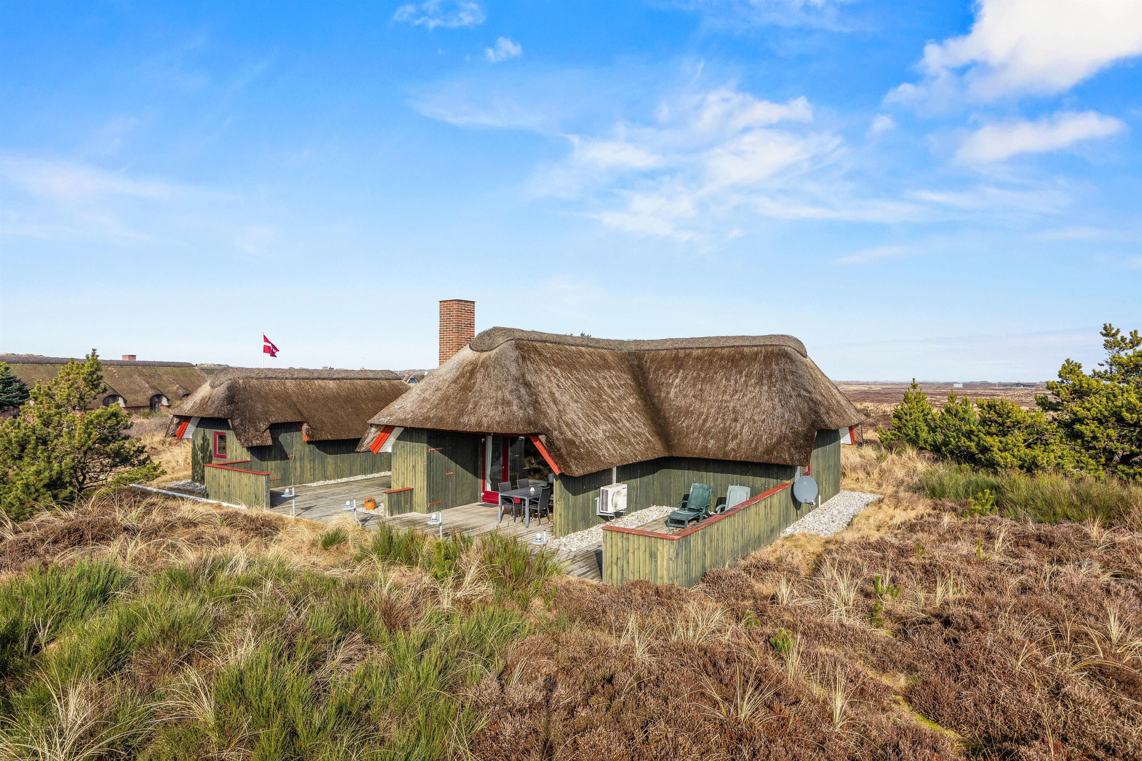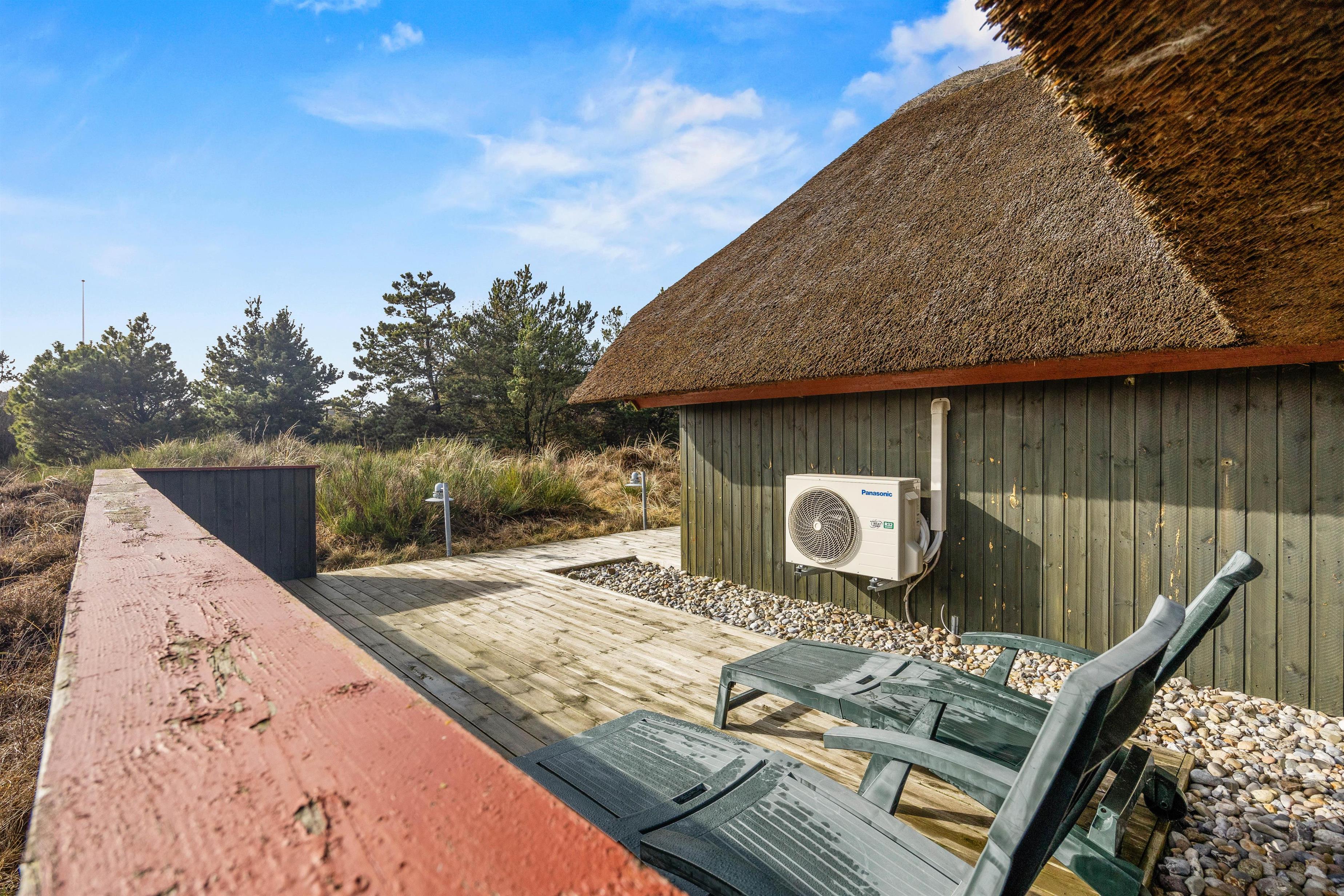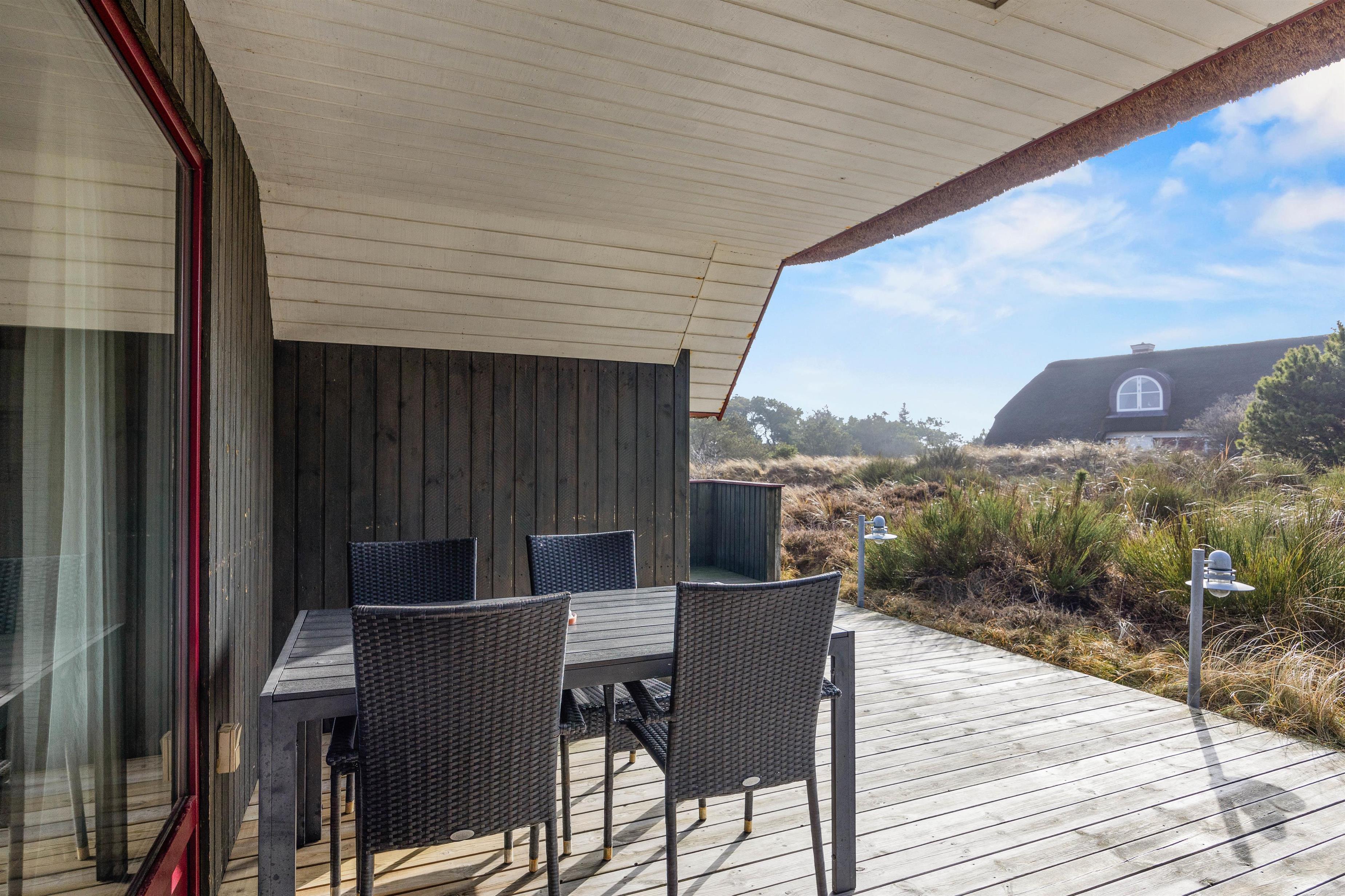 På den 2605 m² store naturgrund har I rigelig plads til at nyde jeres ferie udendørs. Flere forskellige terrasseindretninger giver jer friheden til at vælge det bedste sted afhængigt af vejret og tidspunktet på dagen: åbent for sol, afskærmet for blæsende øjeblikke eller overdækket, hvis I alligevel gerne vil være udenfor. Der står havemøbler klar, så I komfortabelt kan spise morgenmad udenfor eller afslutte dagen med en grillaften.