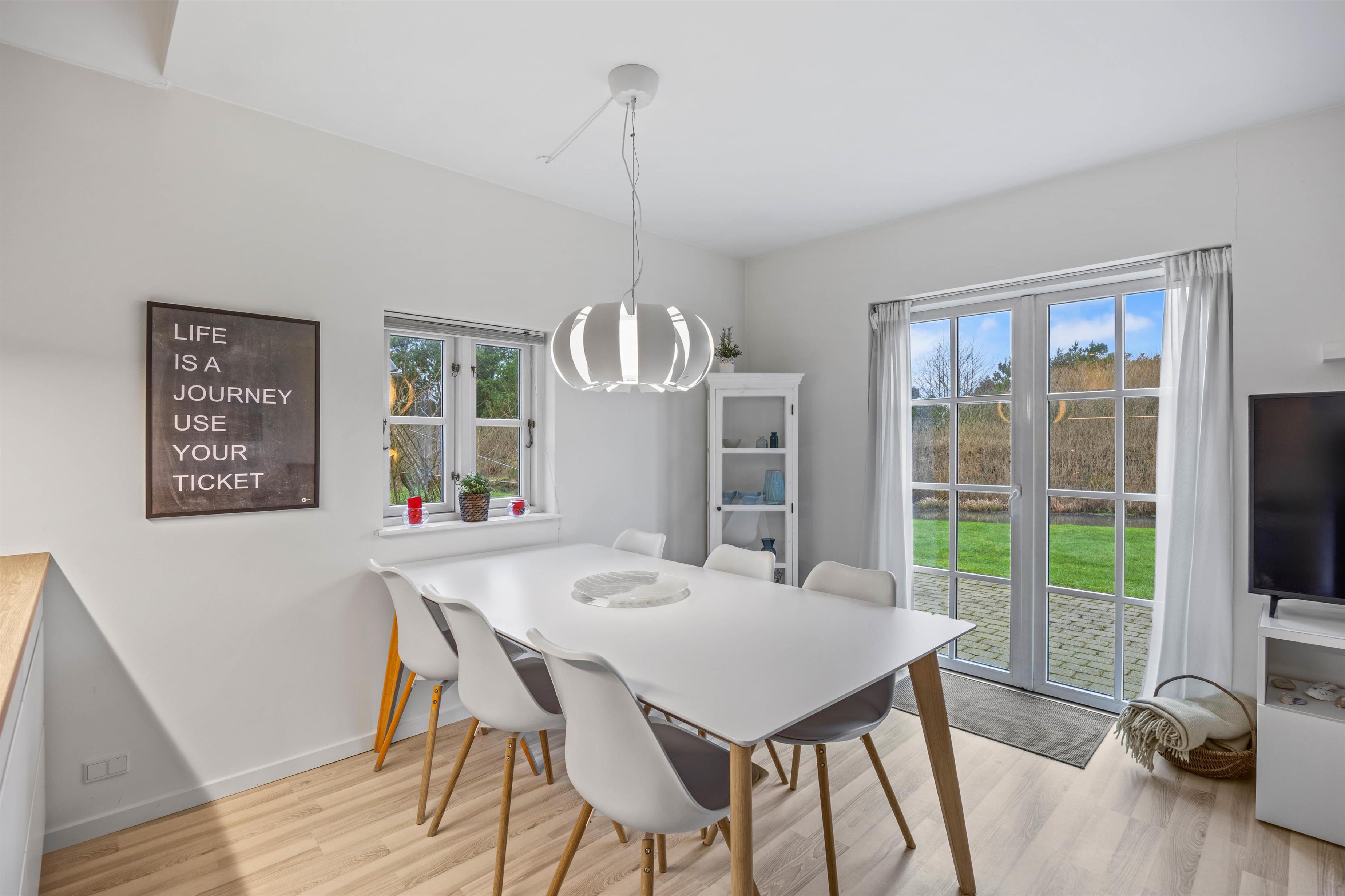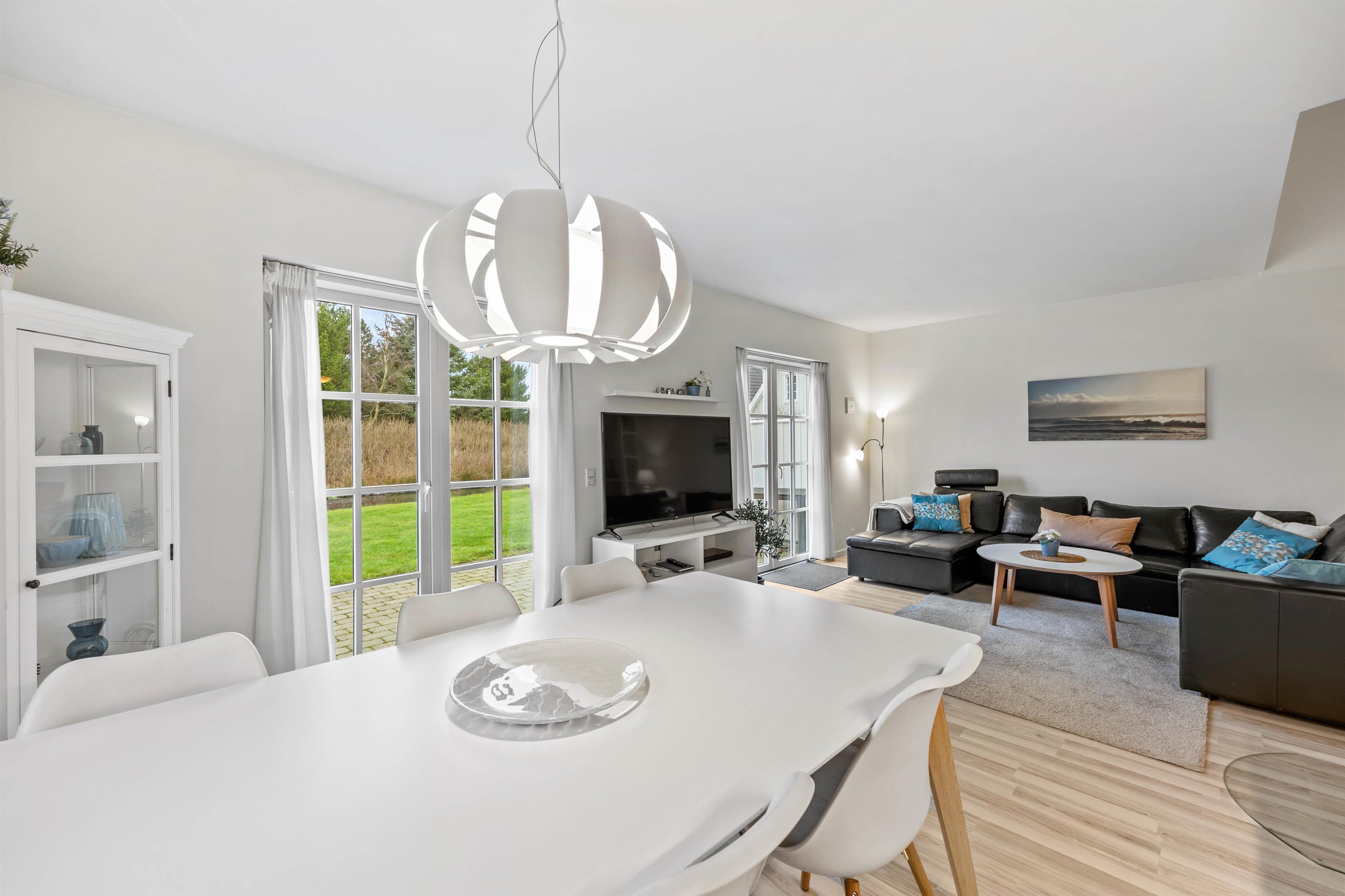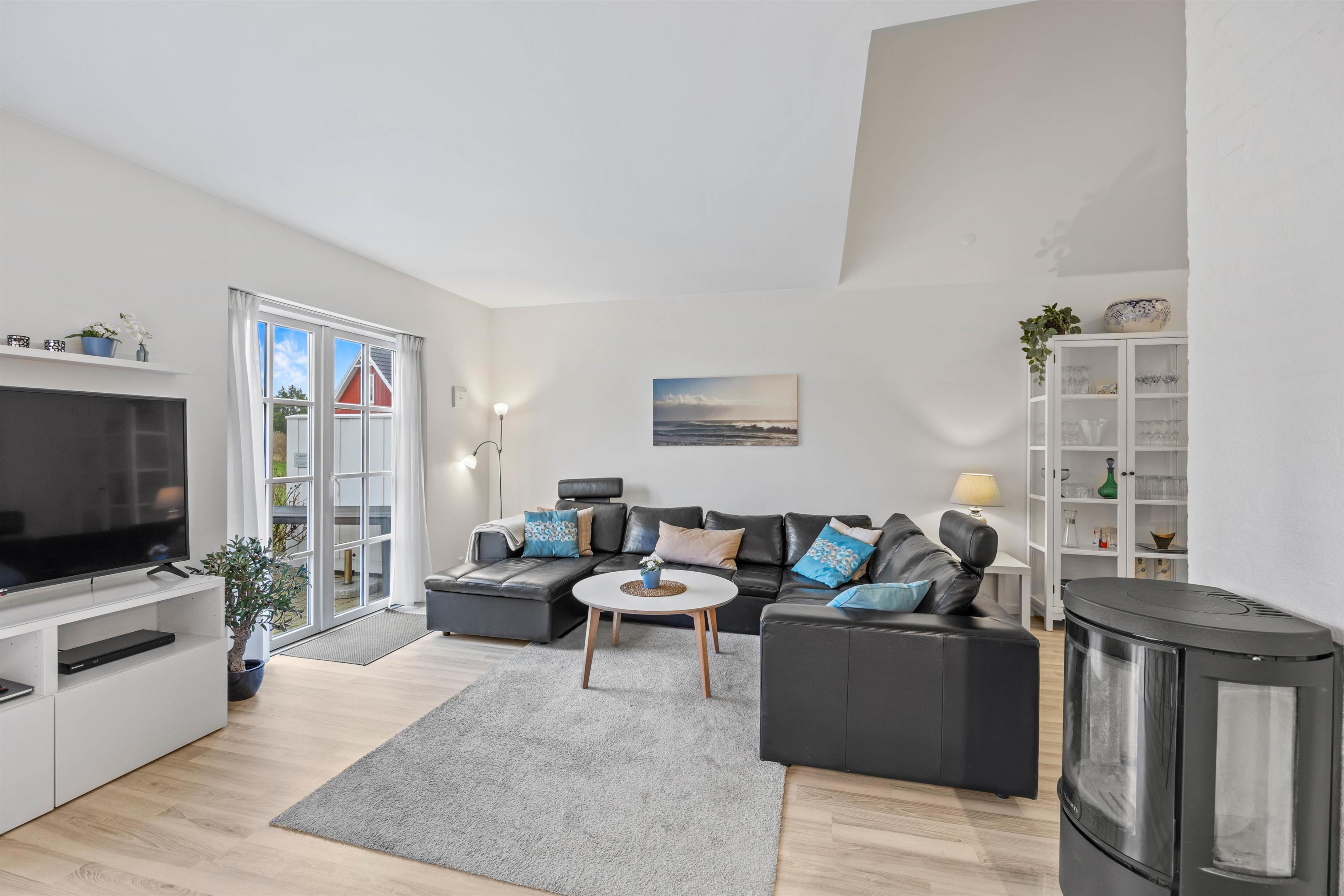 Det indbydende opholdsrum med stue, køkken og spiseafdeling kombineret i ét og med brændeovnen i midten lægger op til masser af hyggelige feriestunder sammen med familien med hjemmelavede måltider omkring spisebordet og sene aftener på sofaen.