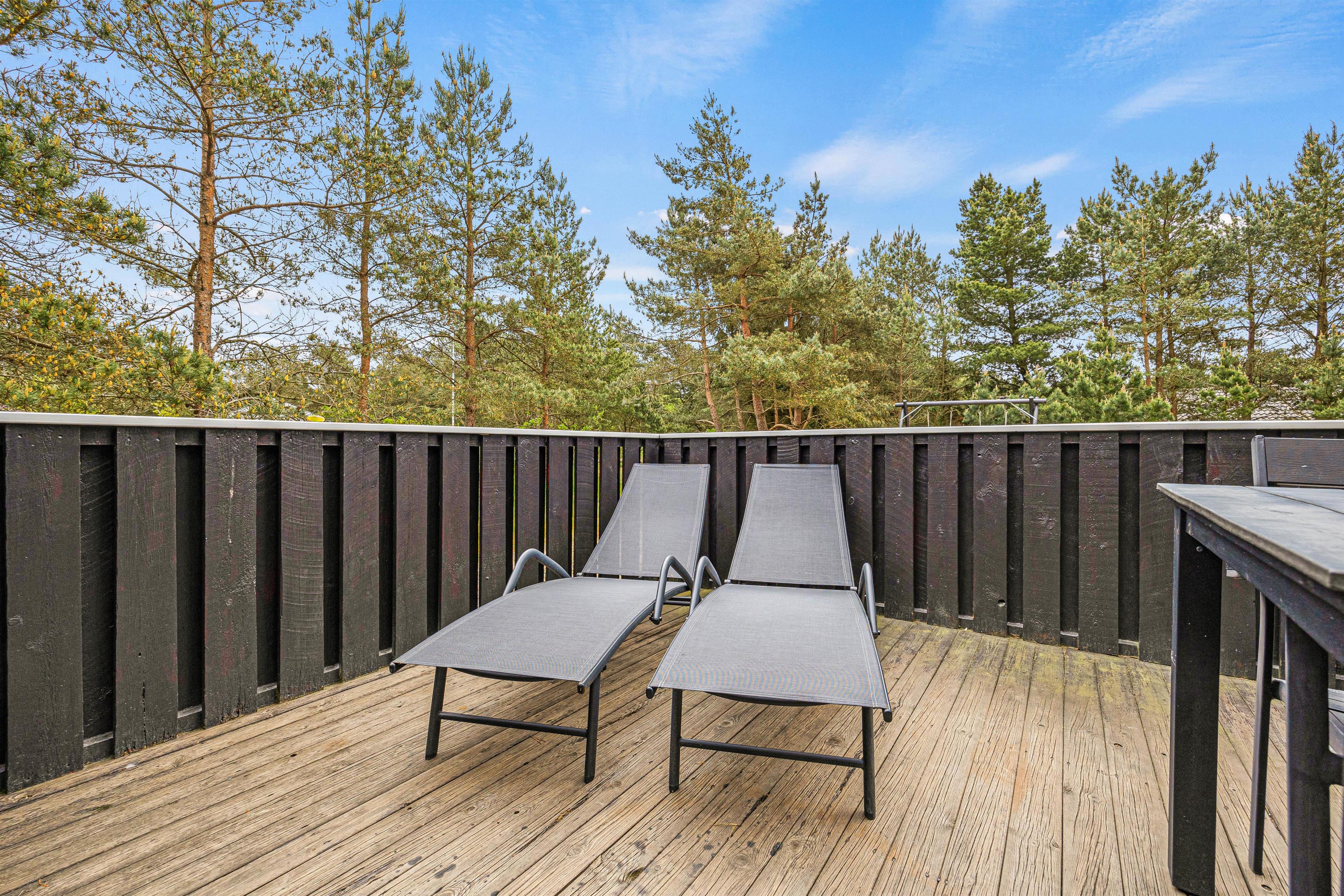 På de solrige feriedage kan I rykke ud på terrassen. Sommerhusets terrasse er lukket, og derfor kan I sagtens også have jeres hunde med derud. På terrassen har I havemøbler og liggestole til rådighed, som I kan læne jer godt tilbage i, mens I nyder ferien, solen og udsigten til den omkringliggende natur.