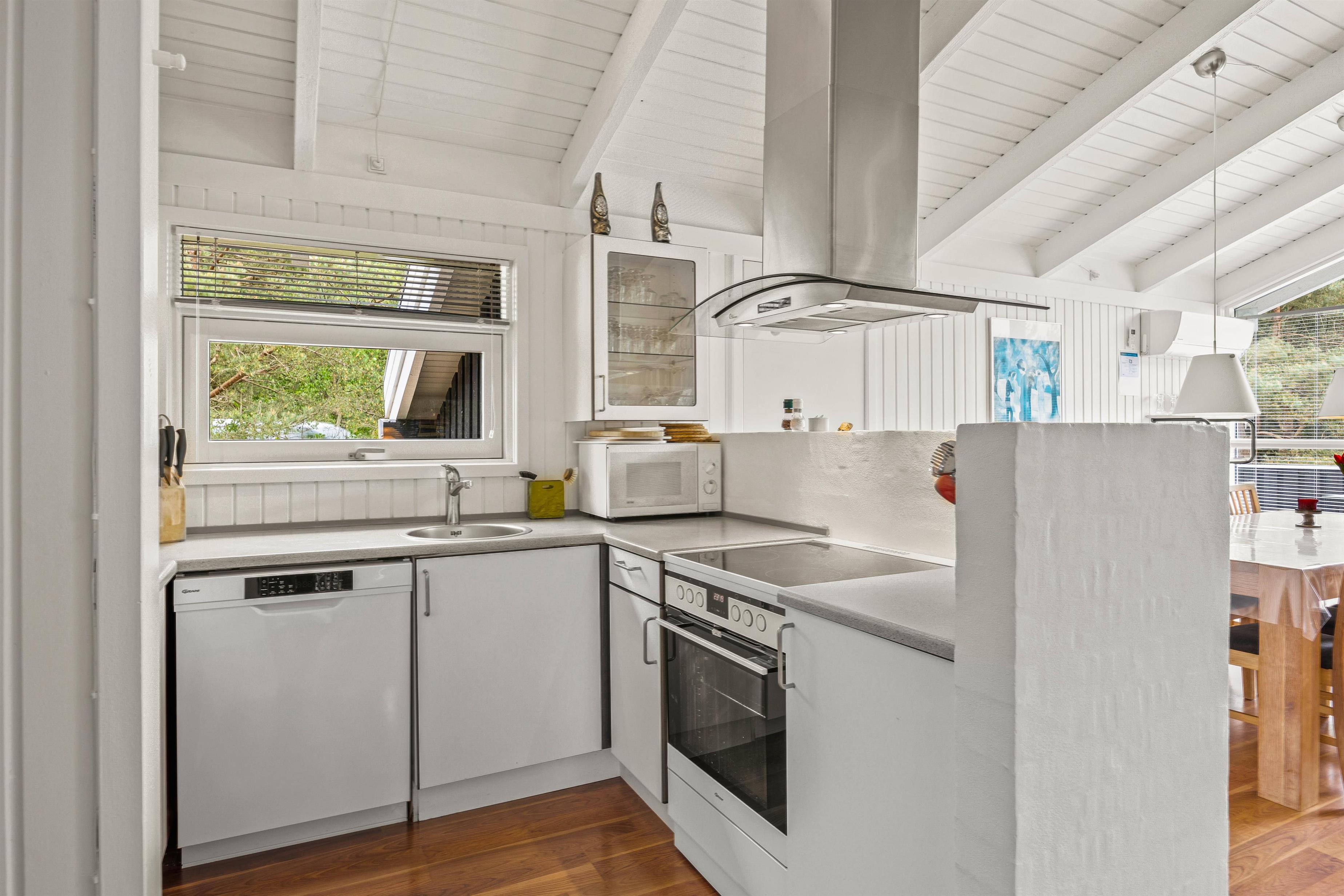 Feriehuset byder desuden på et alrum, der forener køkken, spiseplads og stue, og som kommer til at danne jeres samlingspunkt. Her kan I blandt andet lave lækker mad i køkkenet eller se gode film i tv’et, mens brændeovnen knitrer i baggrunden. Desuden er der en varmepumpe, der sørger for et godt indeklima.