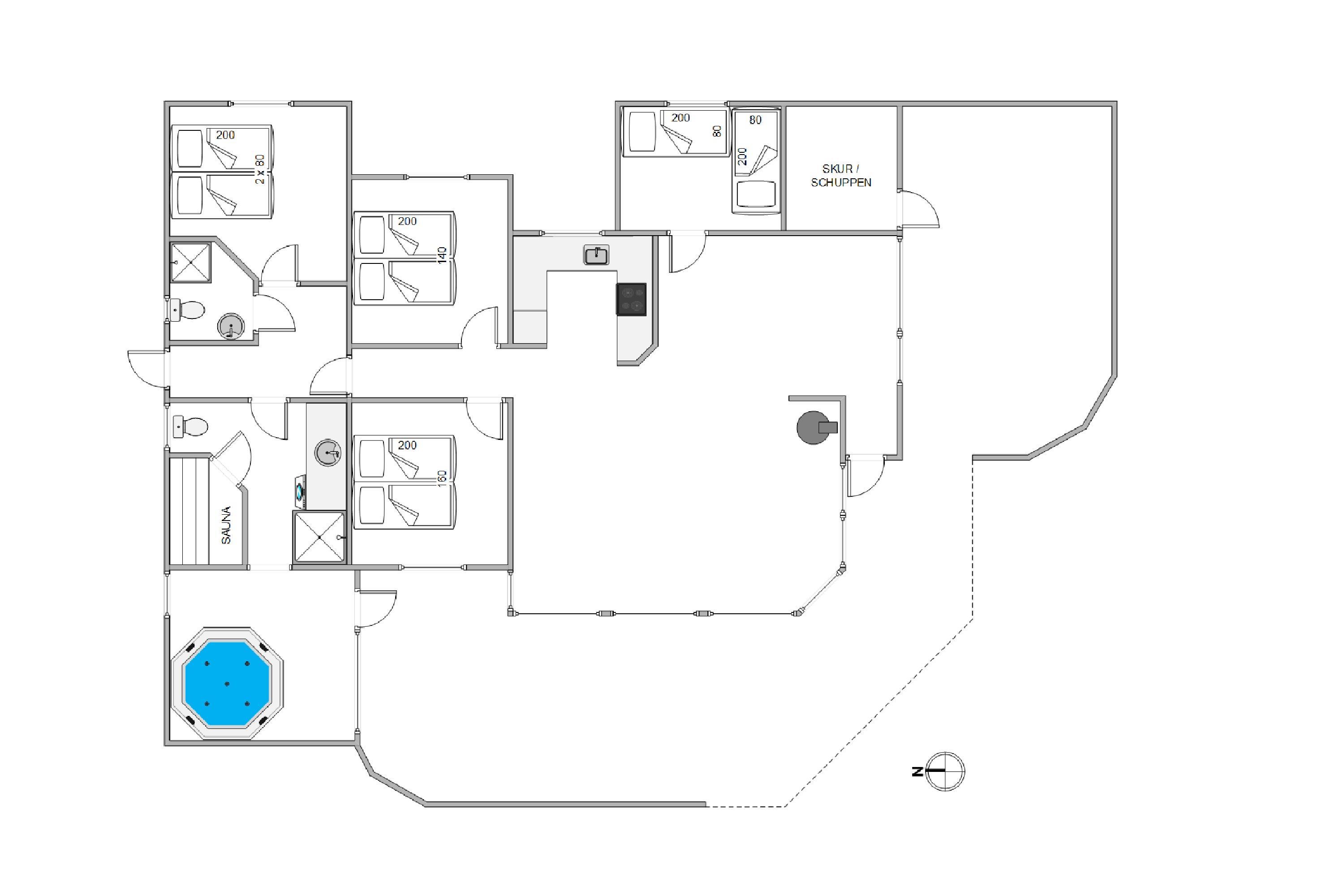 Fra alrummet kan I bevæge jer op på hemsen, hvor I finder en soveplads. Ellers er sovepladserne at finde på sommerhusets 4 soveværelser, der i alt er indrettet med 3 dobbeltsenge og 2 enkeltsenge, som I kan få jeres skønhedssøvn i. Der er et par små trin ned til to af soverummene. Om morgenen slipper I for kø, da der er 2 badeværelser i sommerhuset.