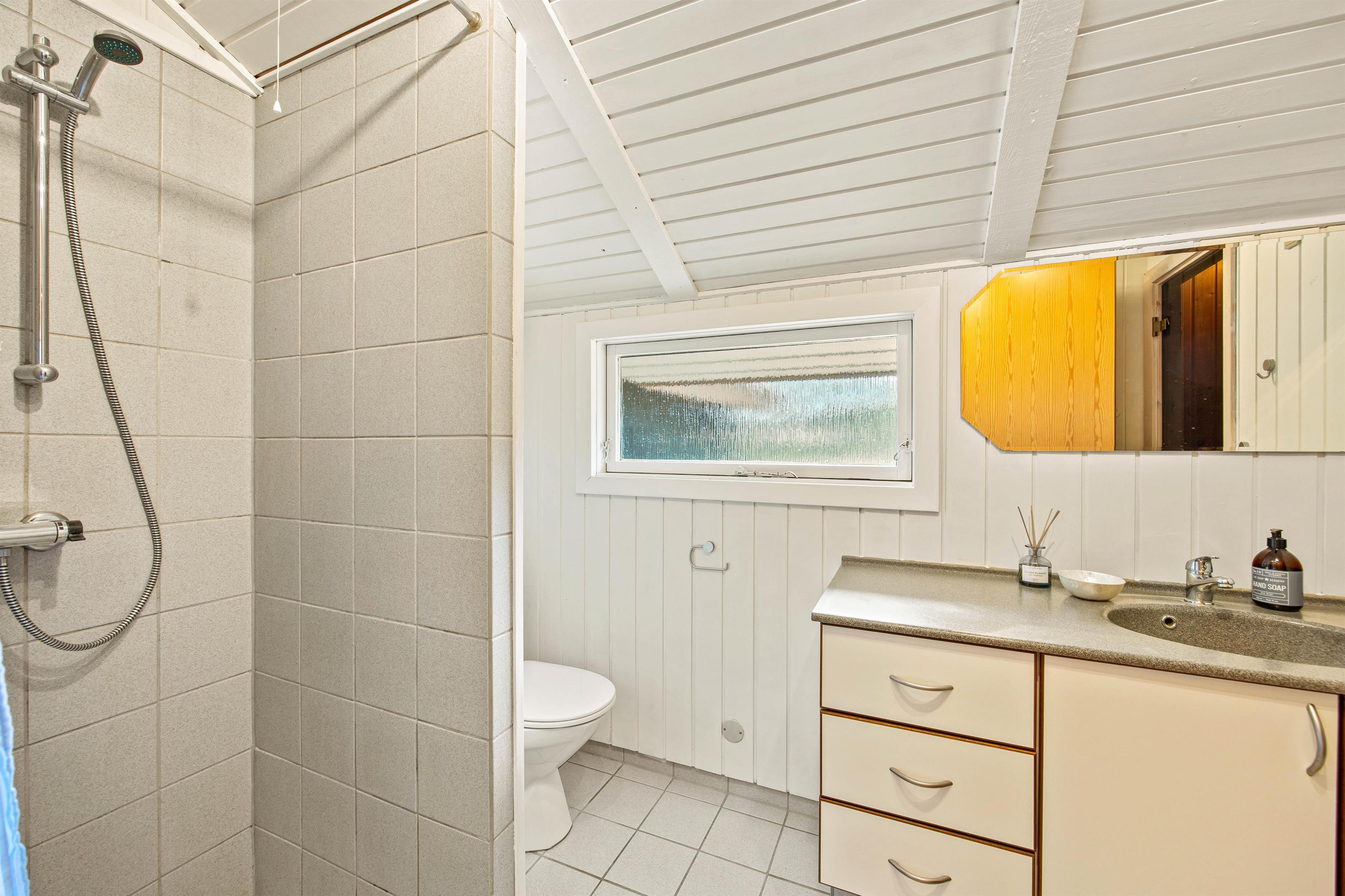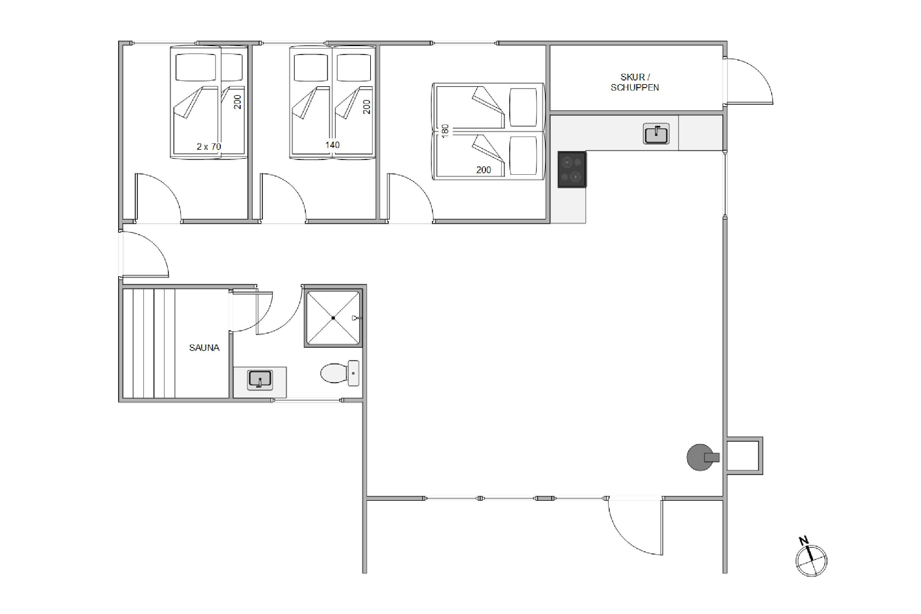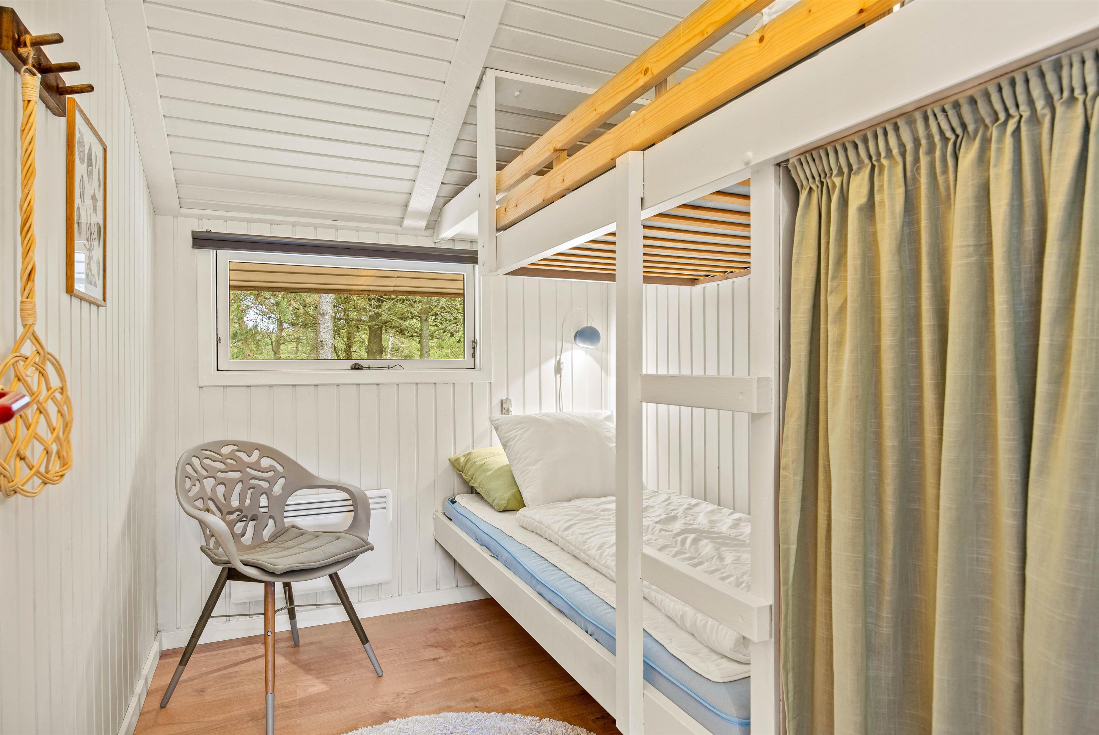 I resten af feriehuset findes ét badeværelse med tilhørende sauna, så I rigtig kan blive varmet igennem efter en aftentur ved stranden eller blot koble af fra hverdagen. Efterfølgende kan I kravle til køjs på et af de tre værelser, hvor I kan sove godt og samle ny energi til den kommende dag. Her er tre fine soverum, hvoraf ét af værelserne har to køjesenge – det vil børnene helt sikkert glæde sig til!