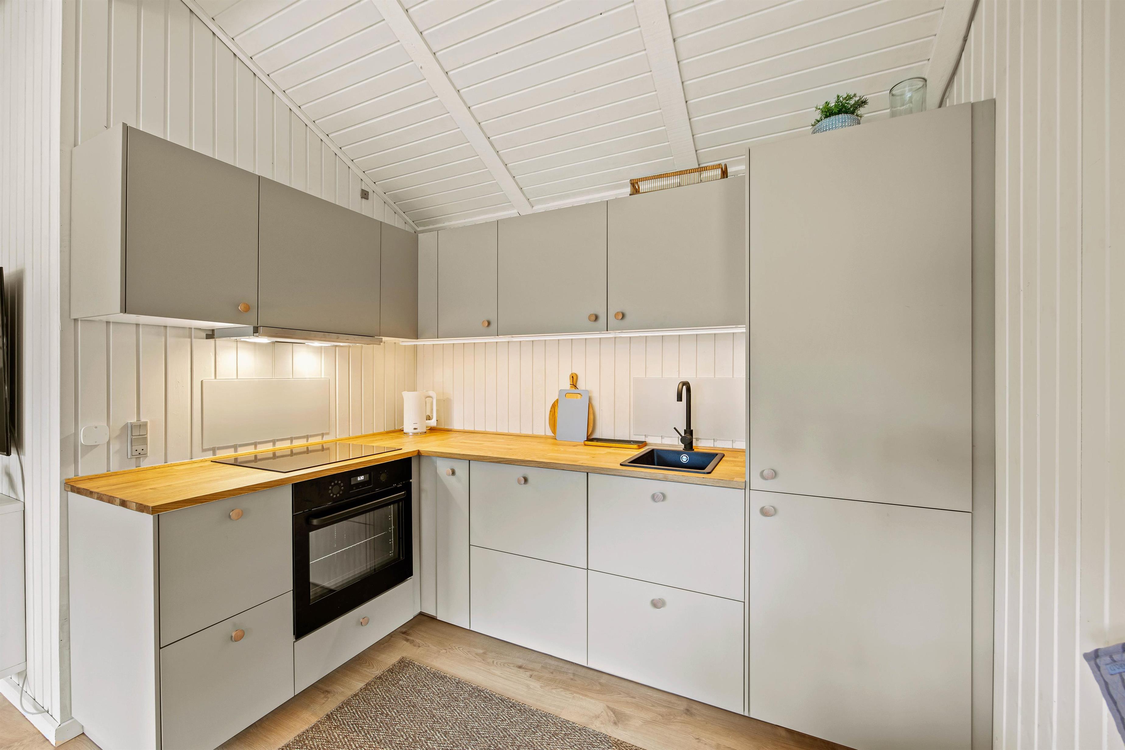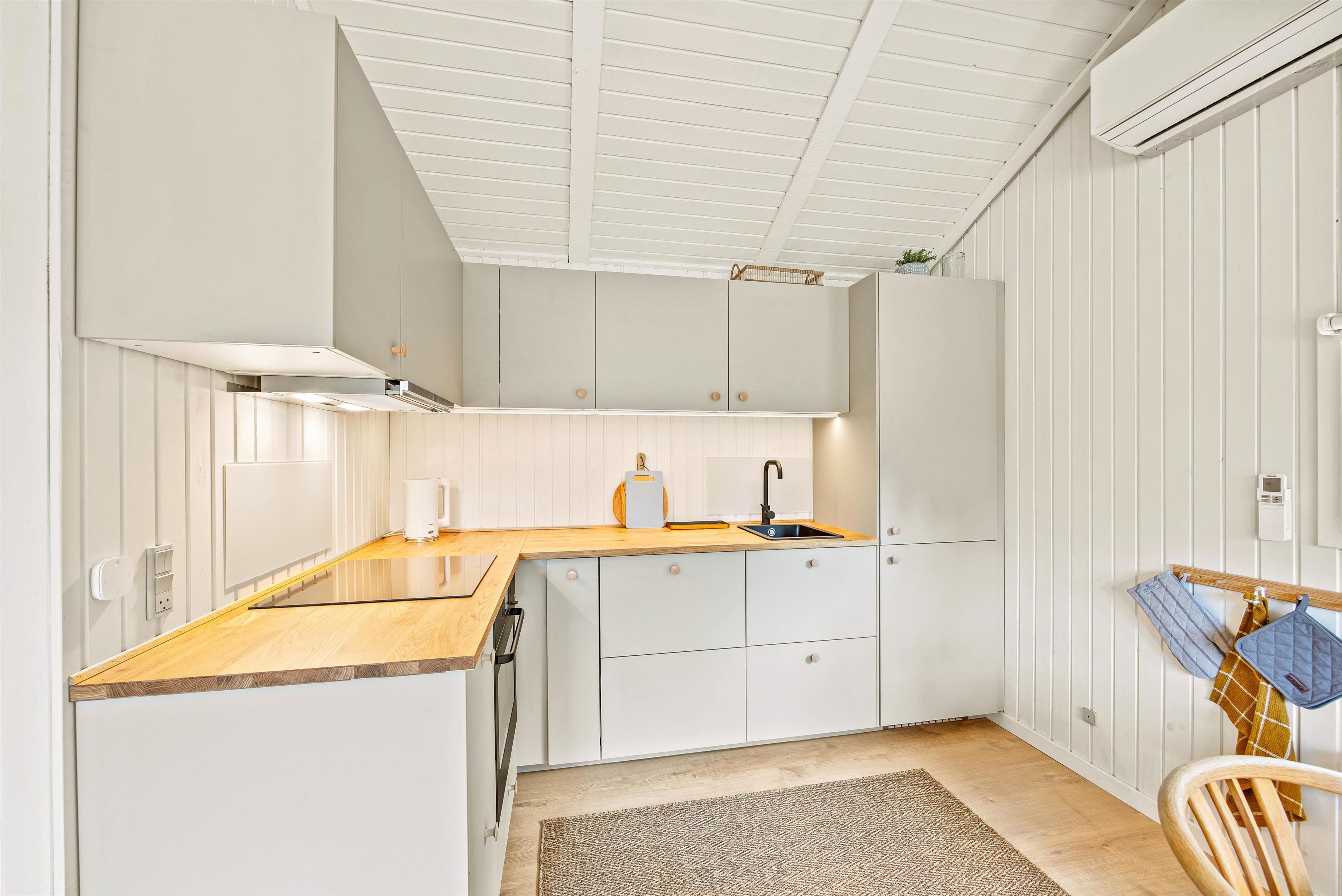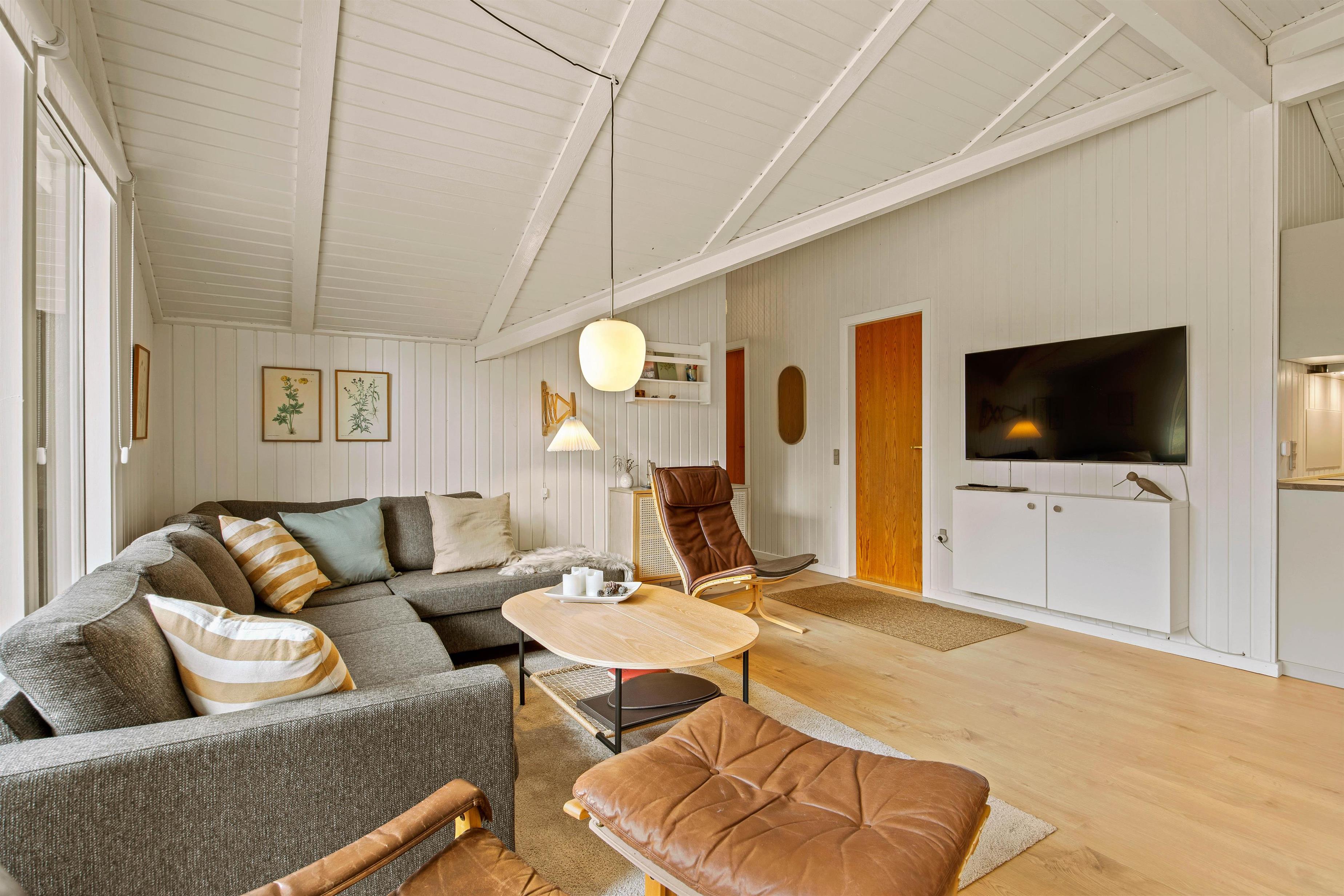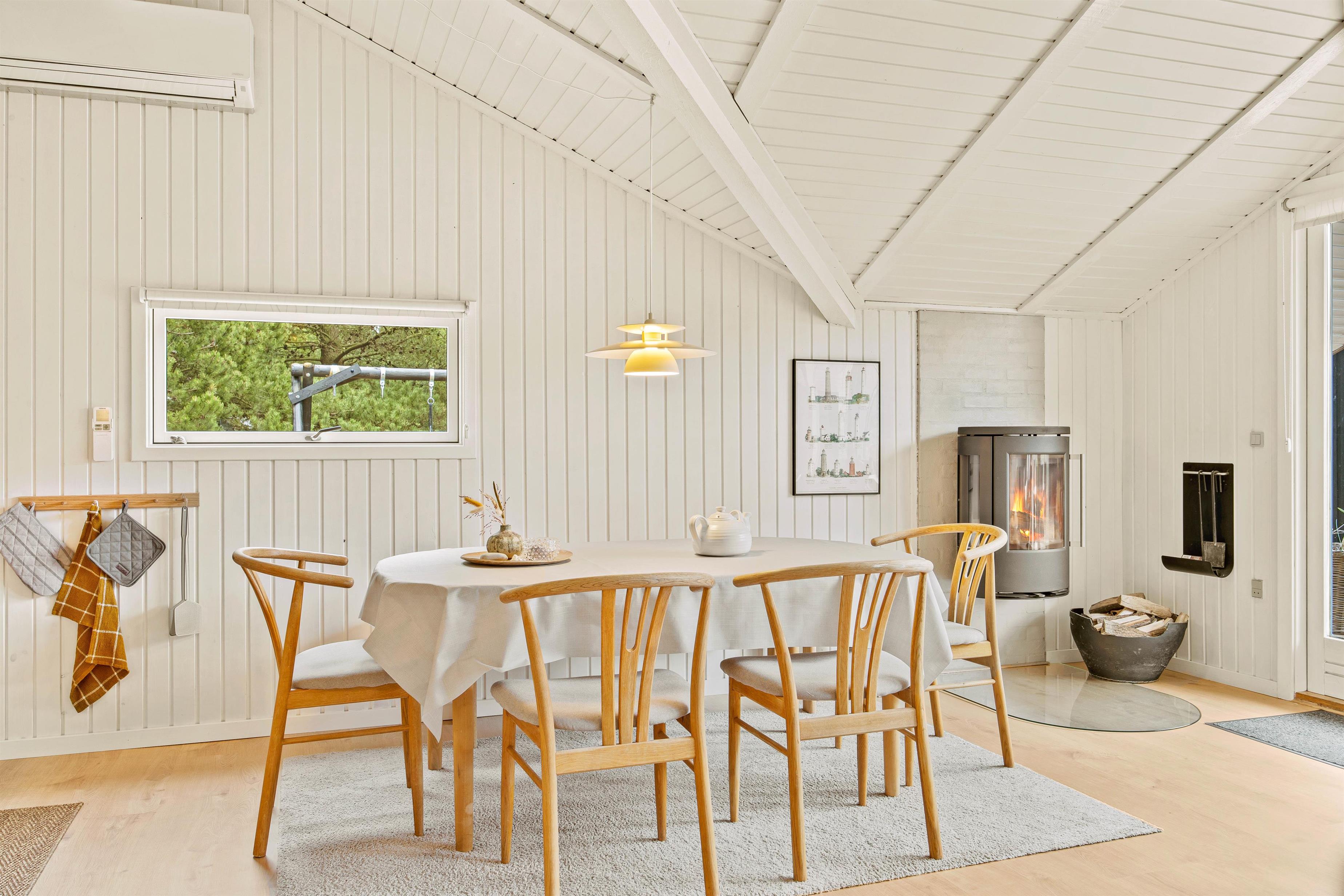 Samlingspunktet i sommerhuset bliver helt sikkert det lyse køkkenalrum, hvor stuen ligger i åben forbindelse. Her kan op til 6 feriegæster samles i sofaen til filmhygge, brætspil eller lave et lækkert måltid i det funktionelle køkken. I alrummet er der plads til, at I kan opholde jer sammen, selvom I evt. har gang i hvert sit. Loftet til kip og det store vinduesparti skaber en luftig atmosfære, som sammen med brændeovnens varme skaber den ideelle sommerhusstemning – også i de koldere måneder, hvor en kop varm kakao og god bog også hører sig til.