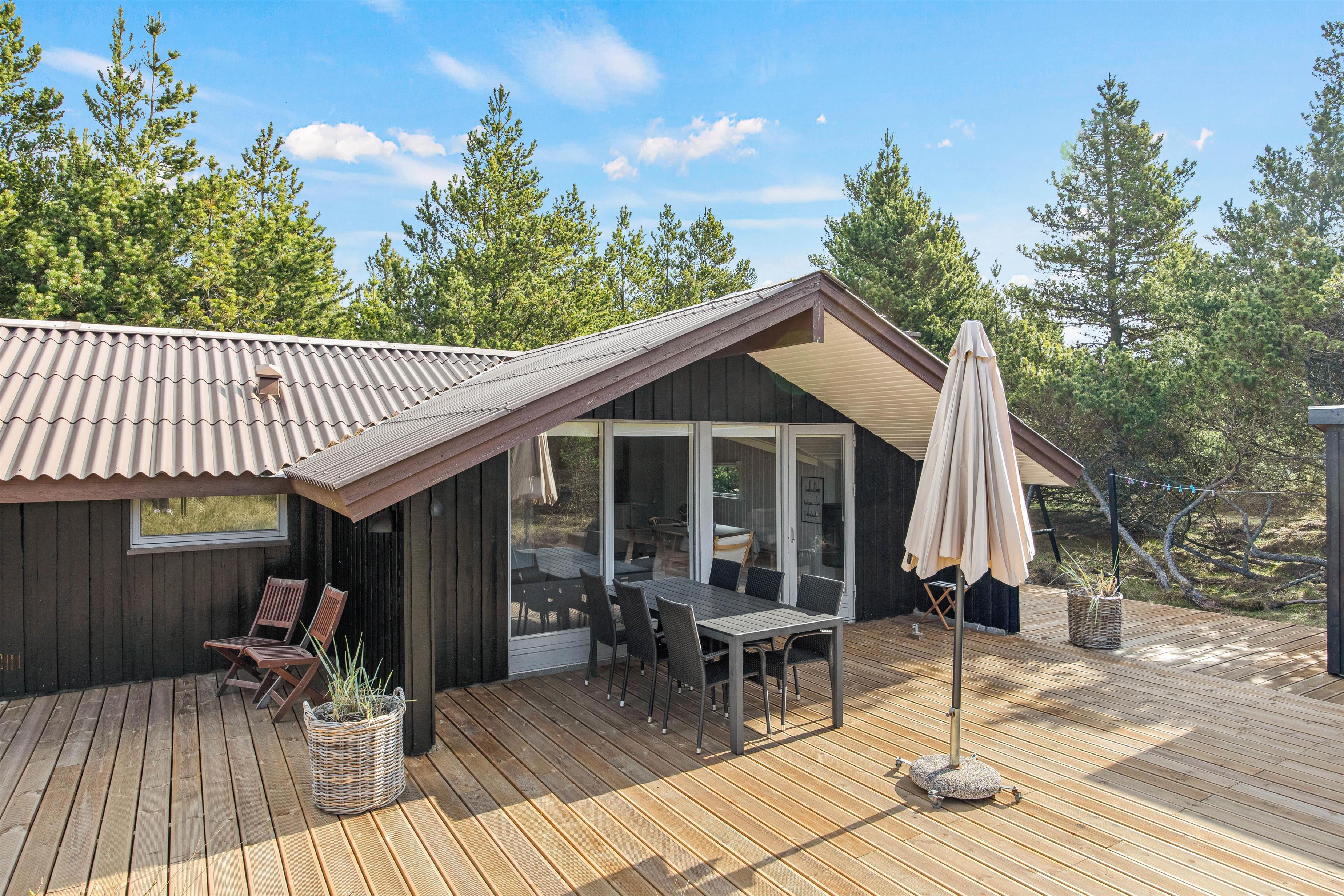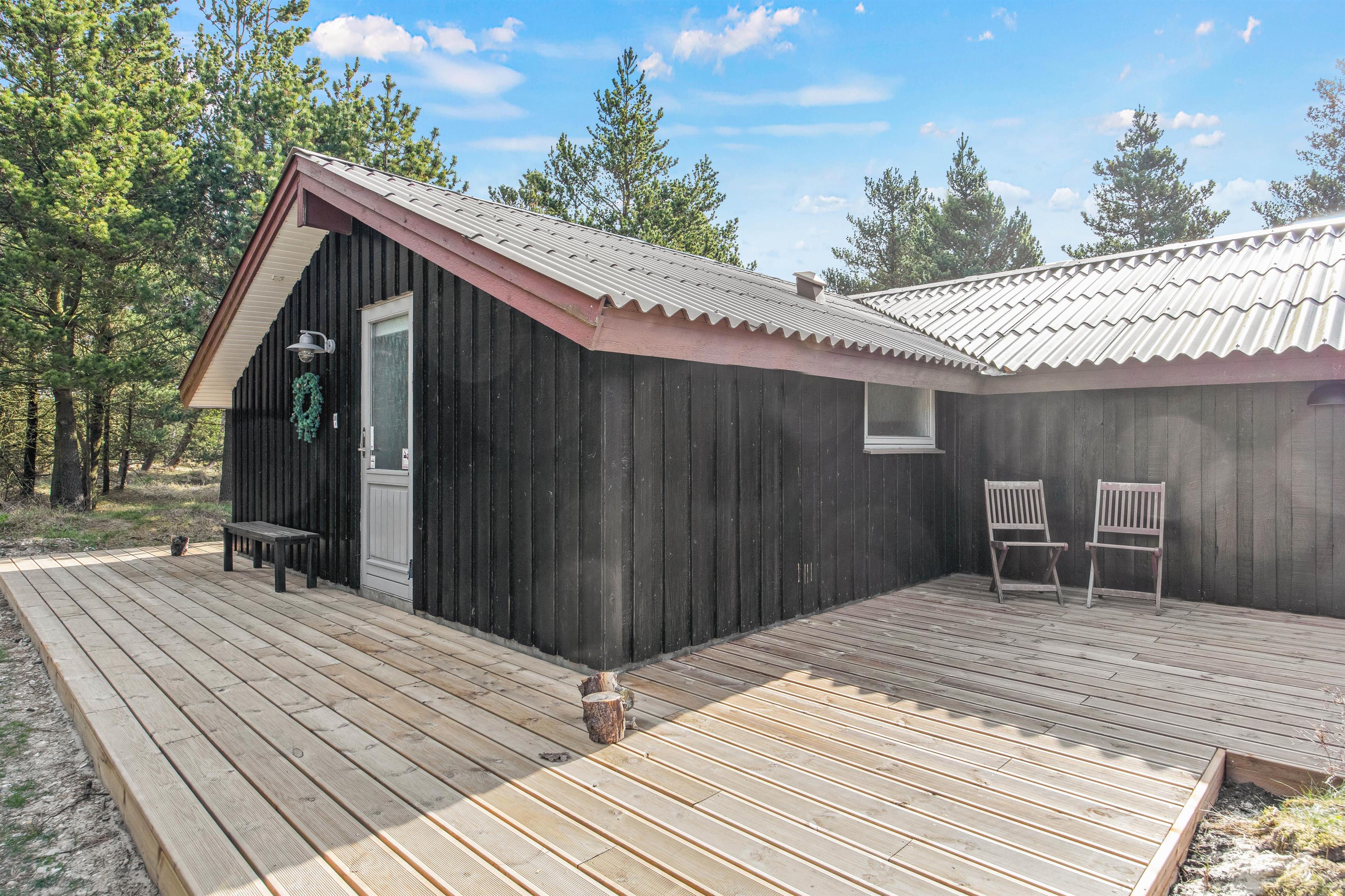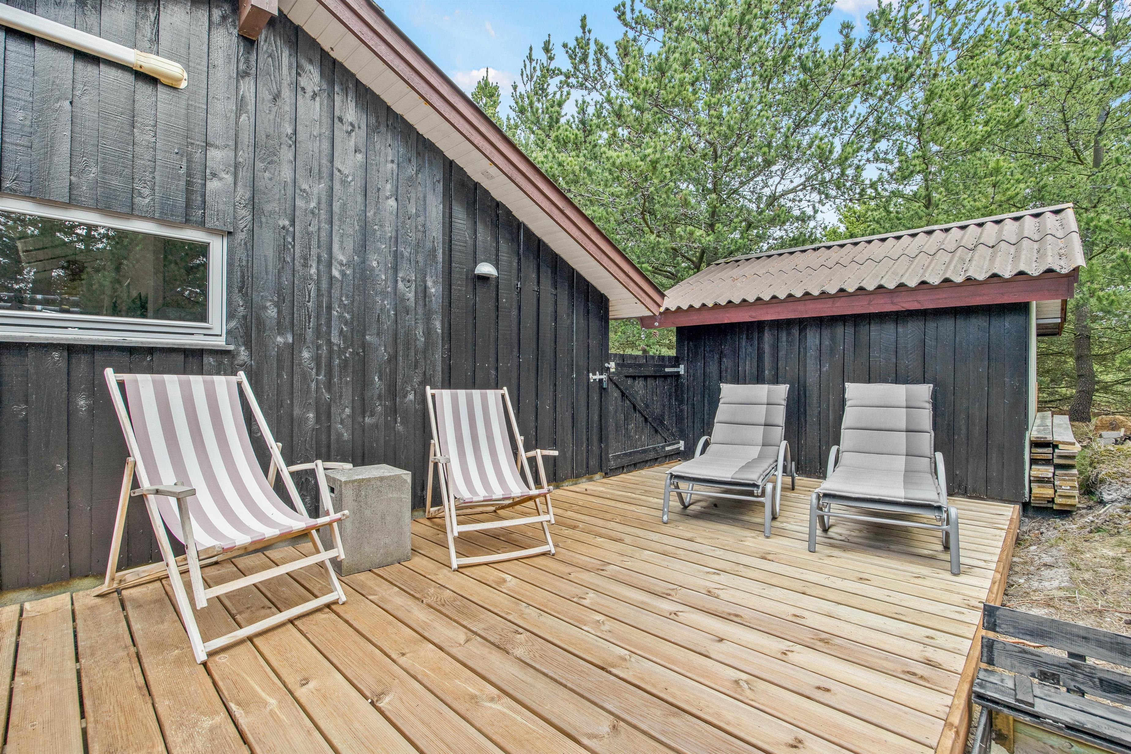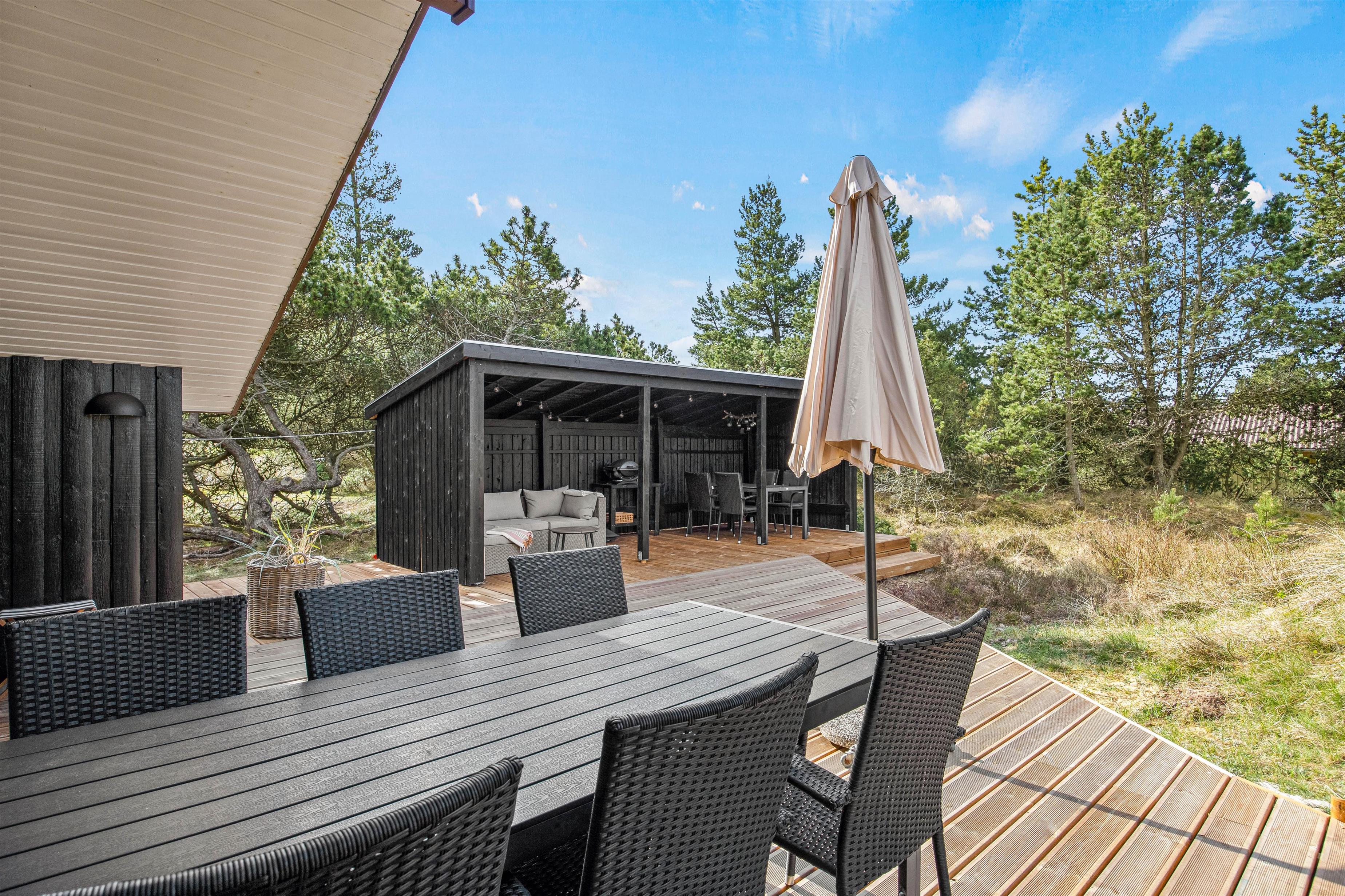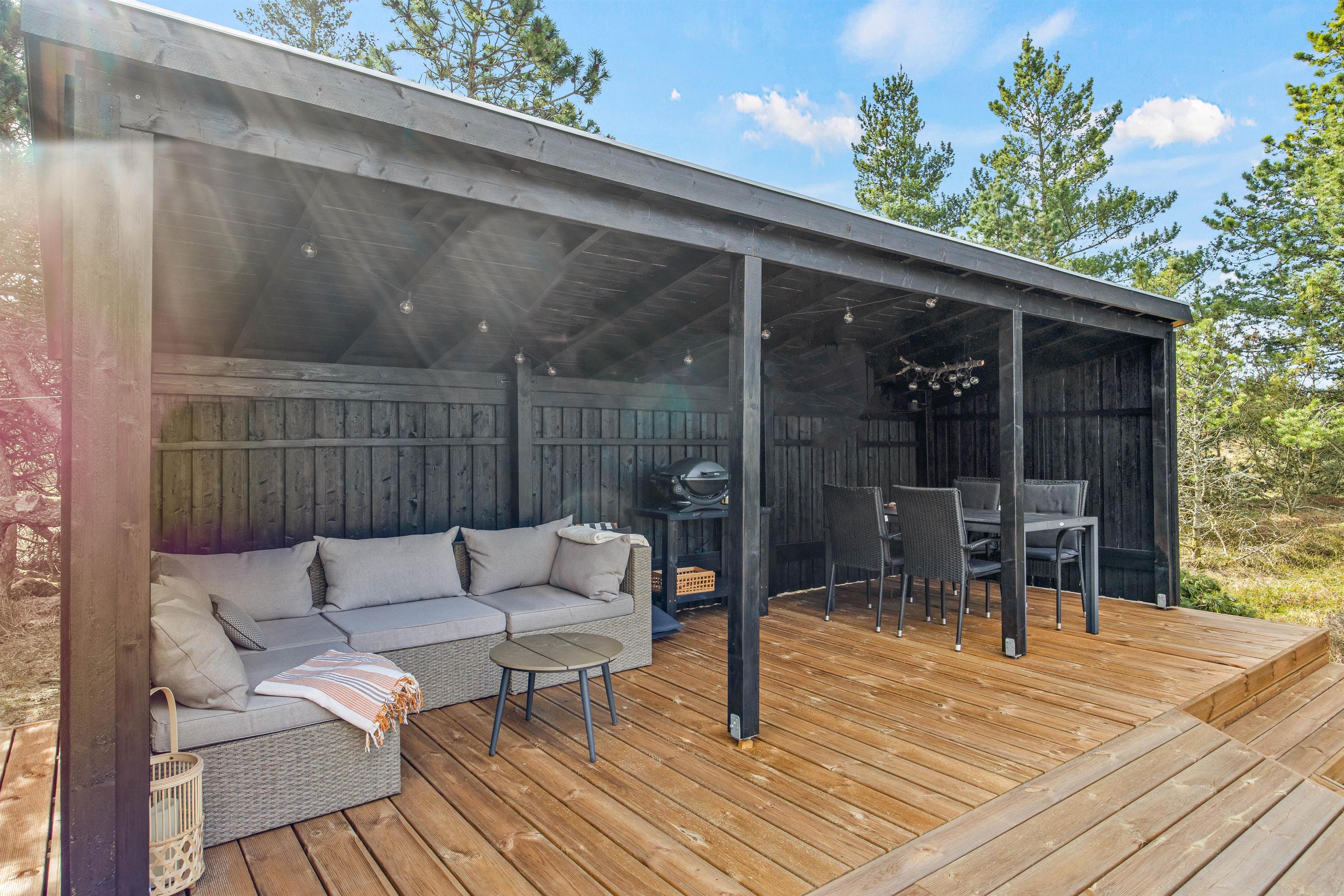 Det fine sorte sommerhus ligger på en dejlig stor naturgrund og omfavnes af en skøn åben træterrasse. Her er altid mulighed for at finde en plads i solen, om det er til aftensmadstid eller morgenkaffen. Mod sydvest står havemøbler og liggestole klar til jer, mens I yderst finder en afskærmet pergola med gasgrill og loungesofa. Om dagen er sofaen den ideelle plads i skyggen, mens den på de lune sommeraftner indbyder til et godt glas. Sid her, mens solen langsomt går ned, marehalmen vifter roligt i vinden og kun lyskæderne i loftet lyser.