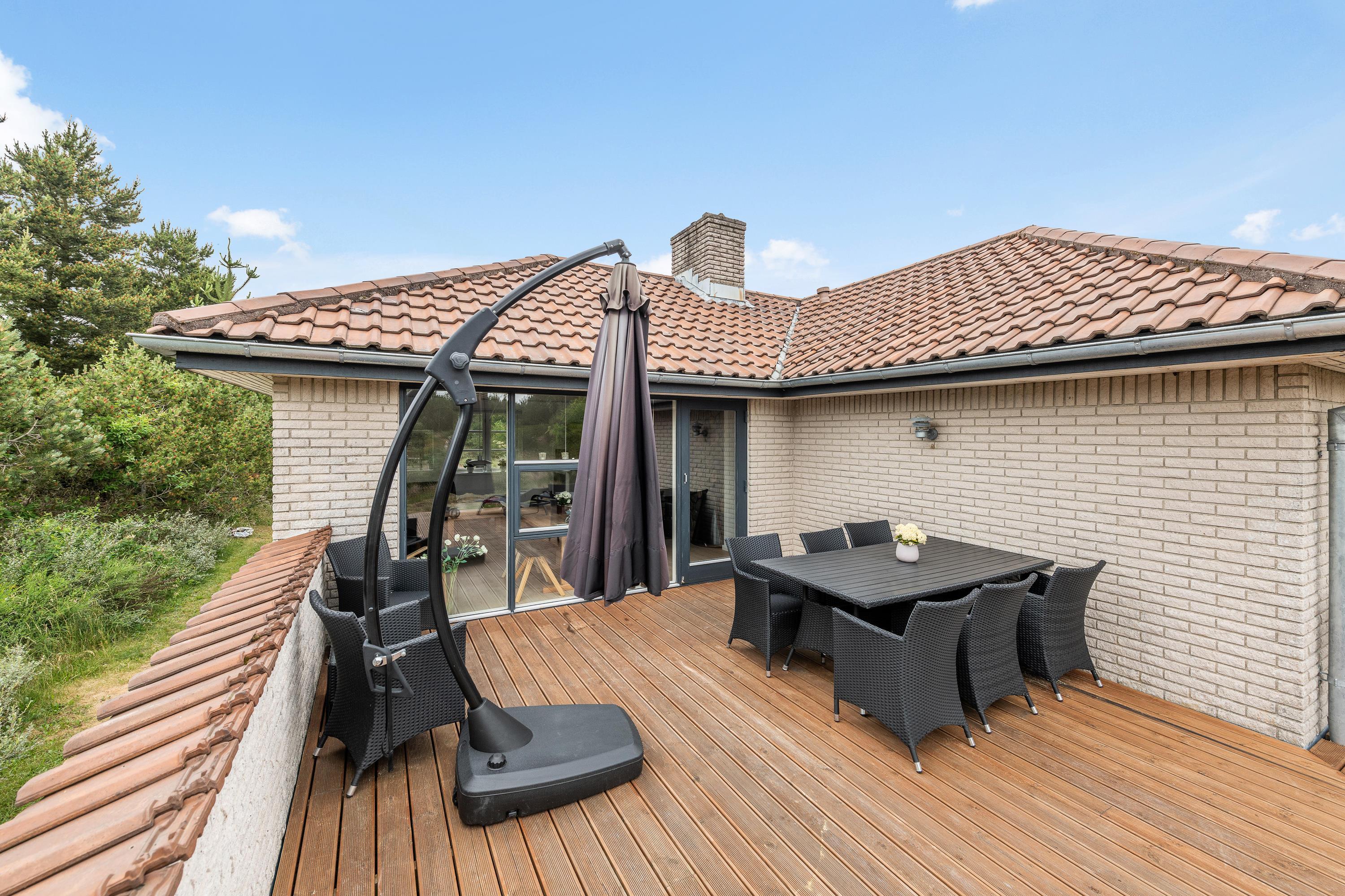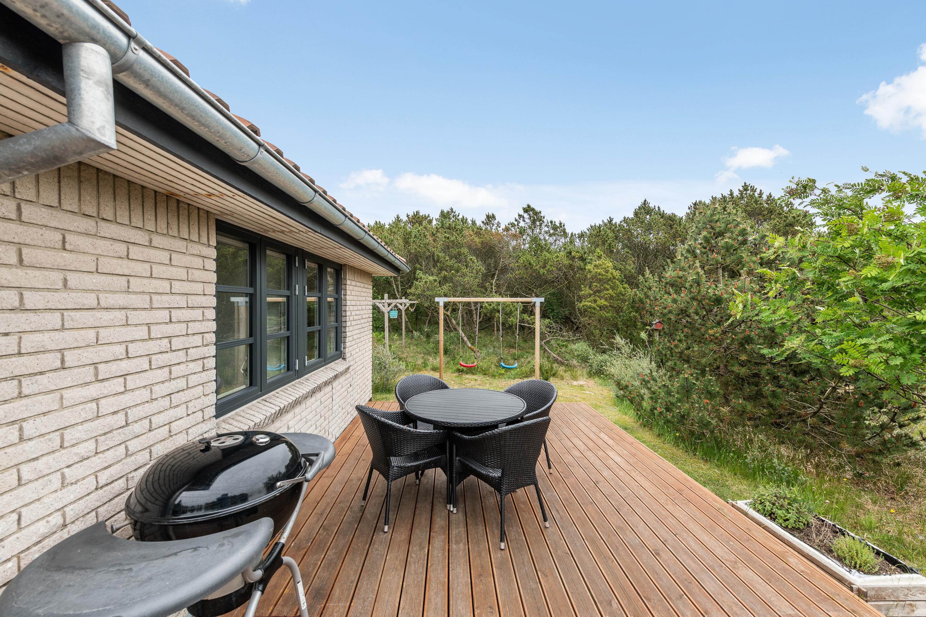 Gl. Hovej 10 har den skønneste terrasse. Foran huset er den store træterrasse hævet op og flot anlagt, så der er god plads, masser af sol-indfald og samtidig gode læforhold. Begynd dagen med at sætte morgenkaffen over, træk evt. i en hyggetrøje og sæt dig ud og nyd, når den nye dag vågner med fuglekvidren og solens første varme stråler. Når børnene så står op, vil de sikkert ud og gå på opdagelse på den skønne naturgrund, lege på legeredskaberne eller i sandkassen med det samme.