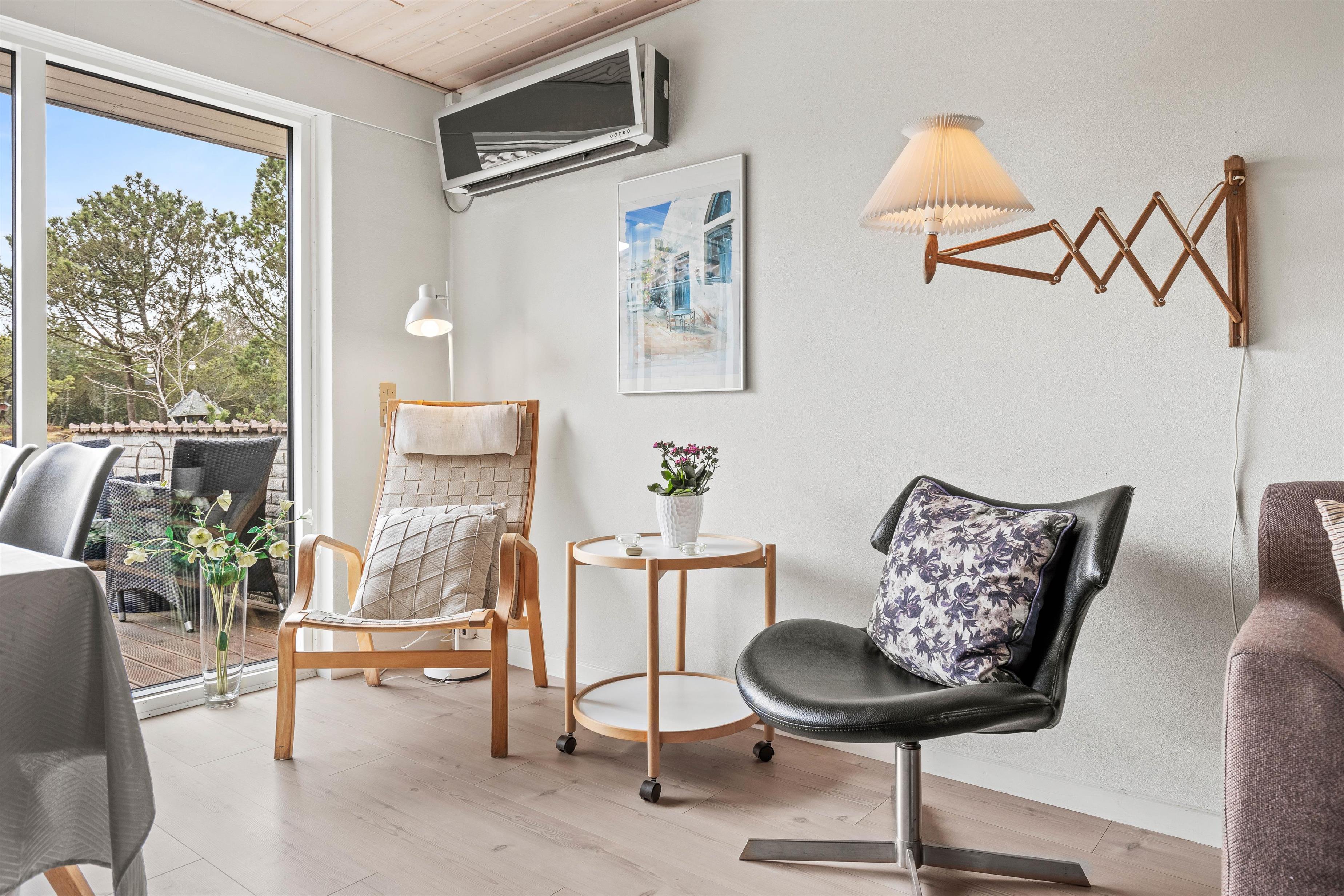 Den hyggelige stue med det store vinduesparti med havedør er indrettet med en stor sofa, hvor der er god plads til familiehygge foran fjernsynet. En lænestol ved vinduet indbyder til at finde en god krimi, tænde op i den fine indbyggede brændeovn og bare holde fri.