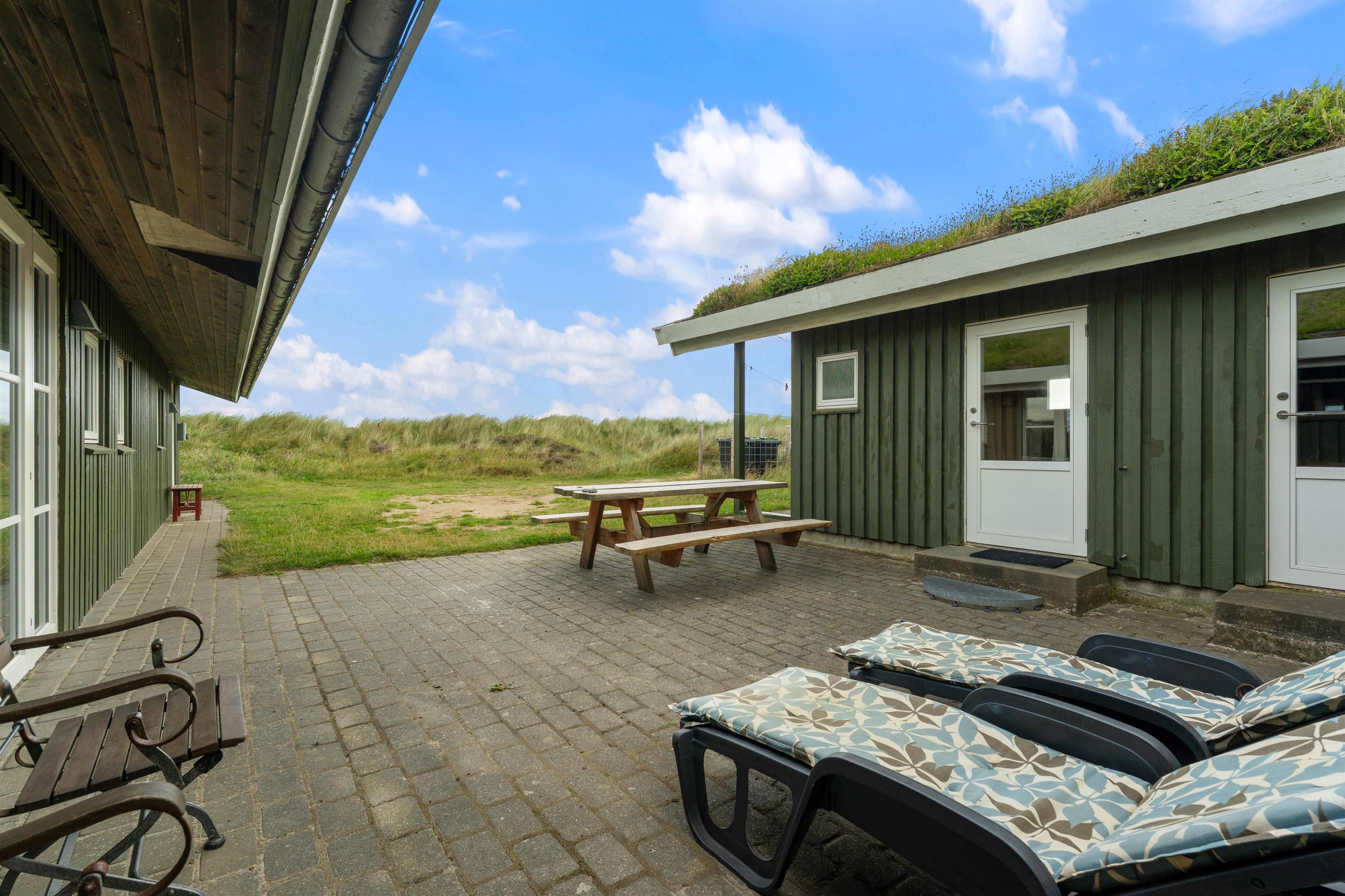 På idyllisk vis omslutter klitterne huset, mens vinden fører en brise af frisk havluft over terrassen. Nyd feriedagene udenfor i liggestolene, eller gør jer det hyggeligt inde i stuen med en god film og lyden af den knitrende ild fra den indmurede pejs i baggrunden.