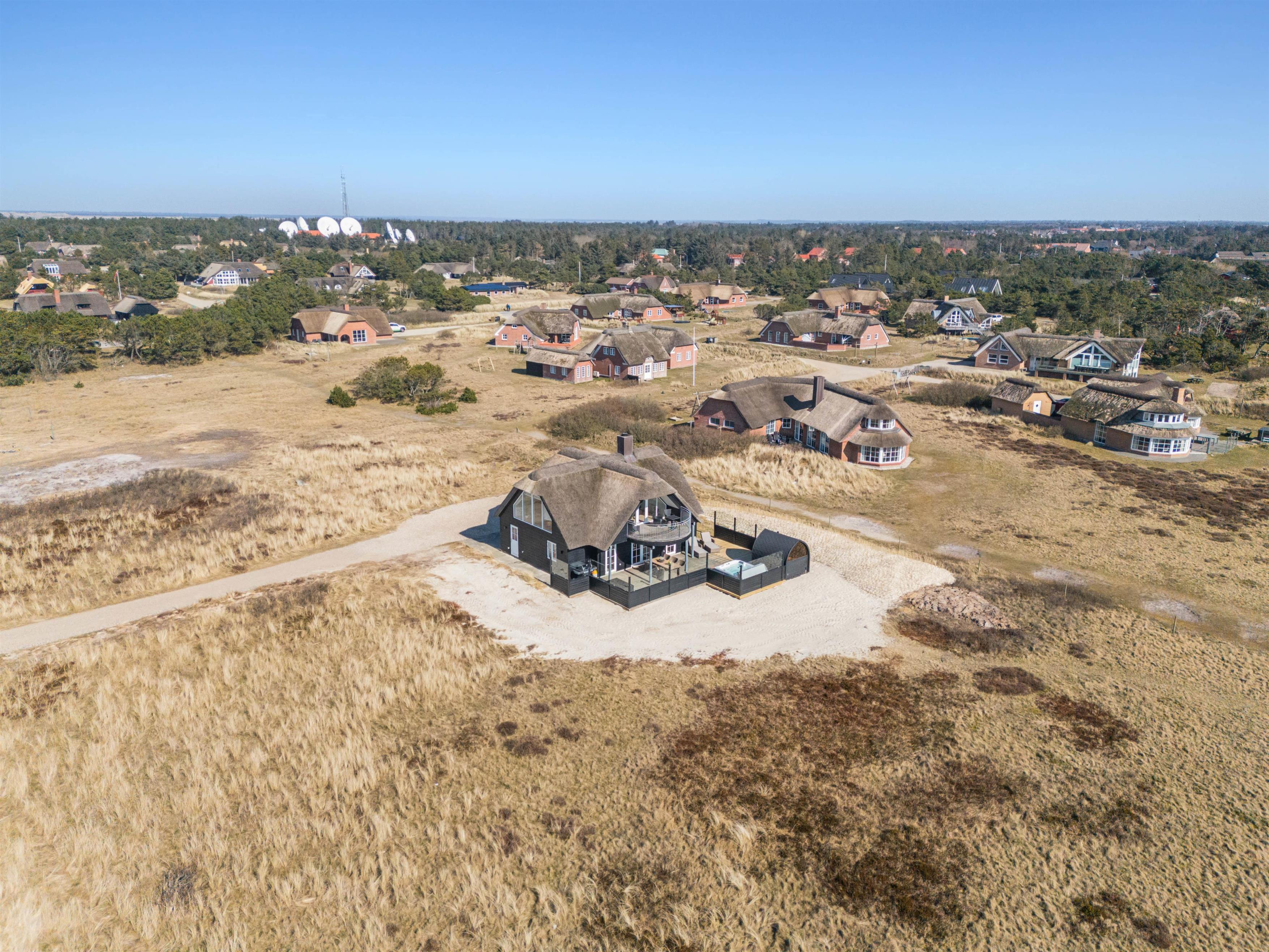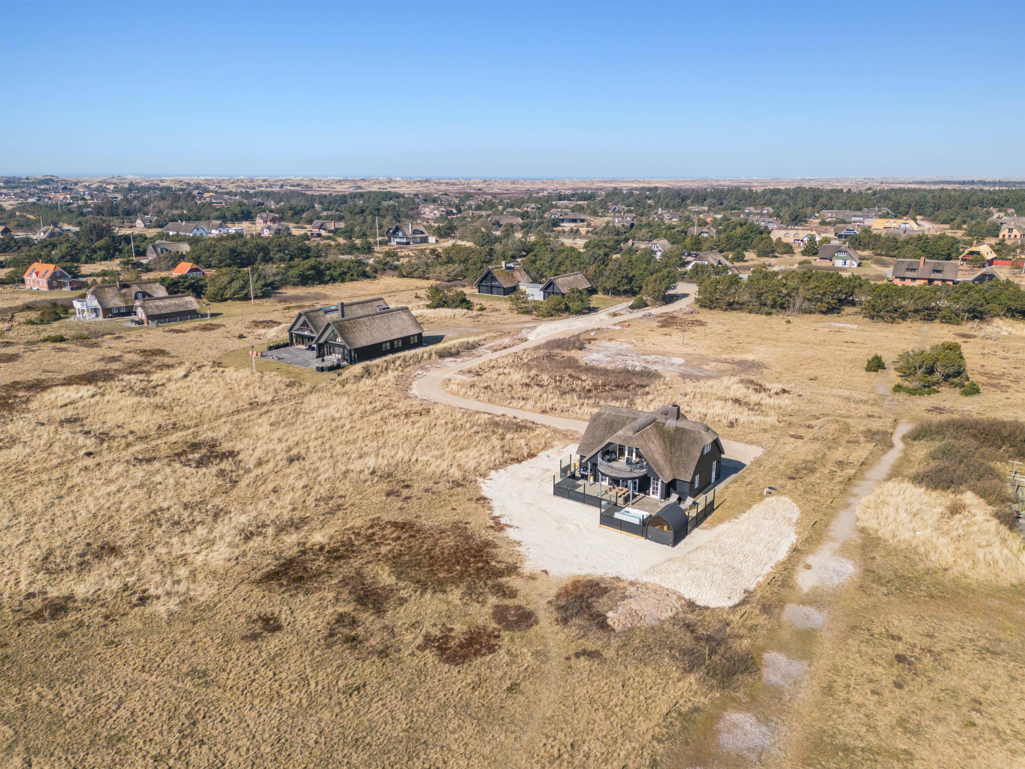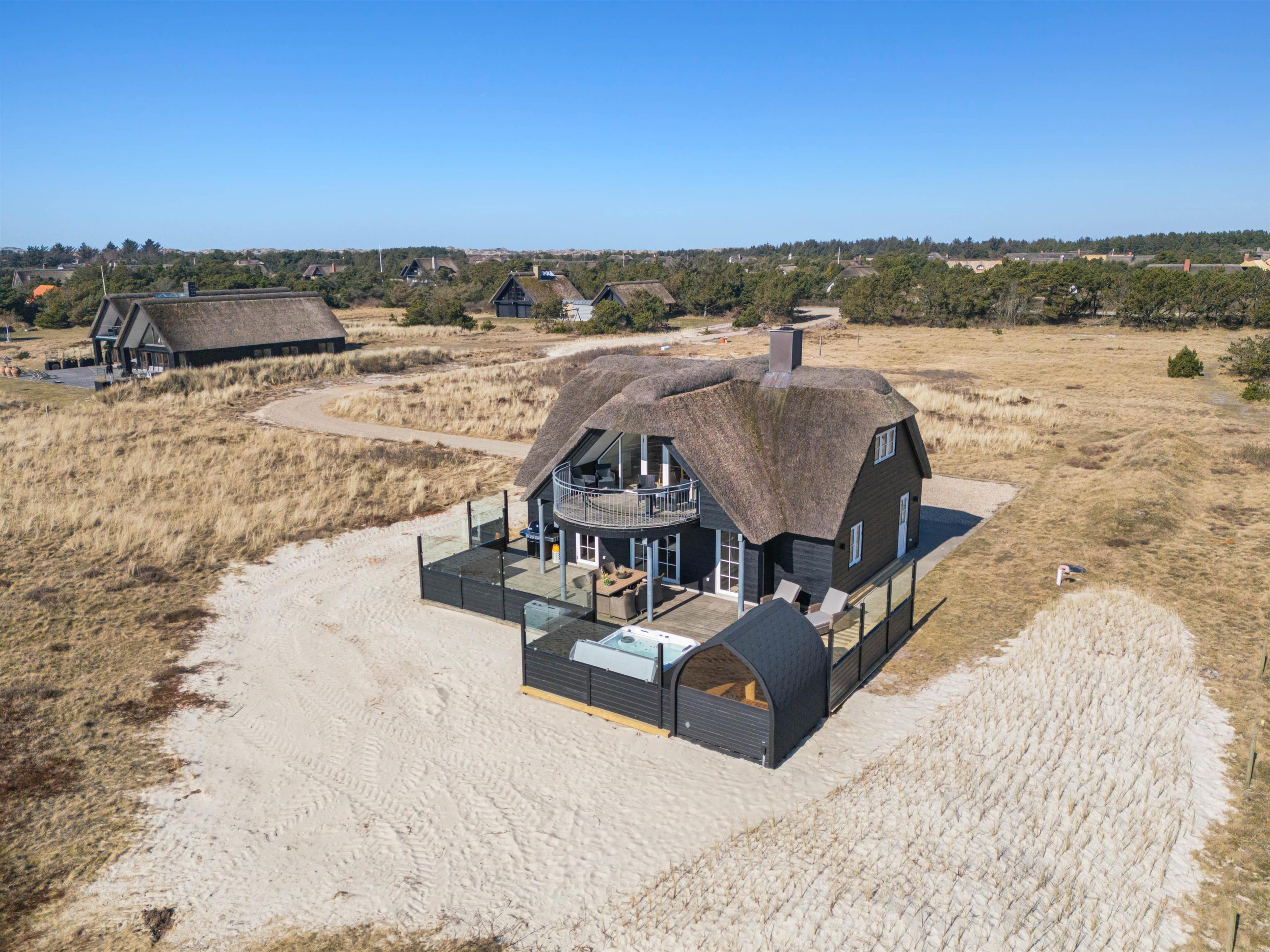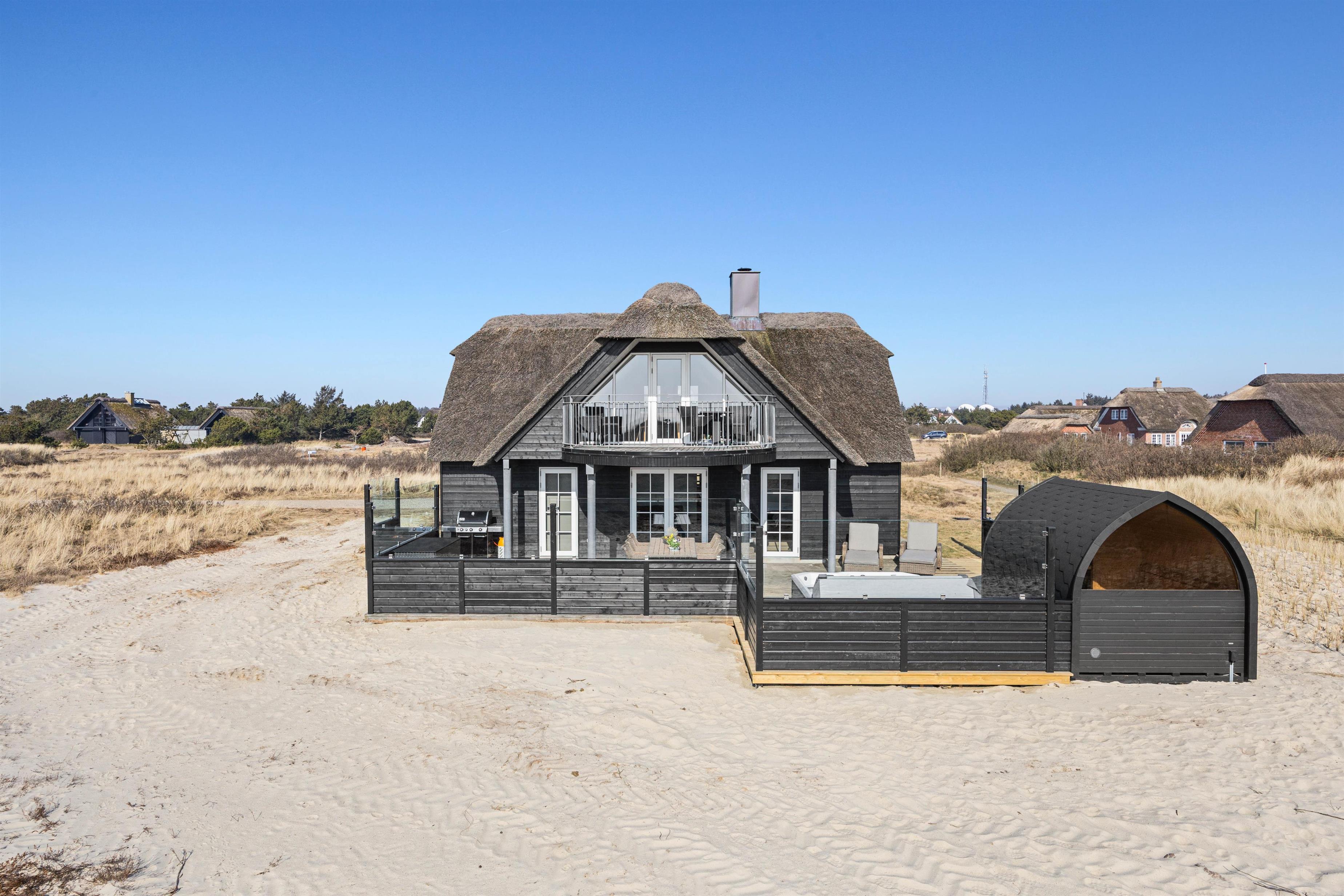 Sænk skuldrene og kom helt ned i gear i dette smukke, klassiske træhus med stråtag på en stor, åben grund i den fascinerende, vestjyske natur og med 54 m2 terrasseareal samt 18 m2 overdækket terrasse lige ved havet og muldyrbunkerne og tæt på Blåvand Fyr.