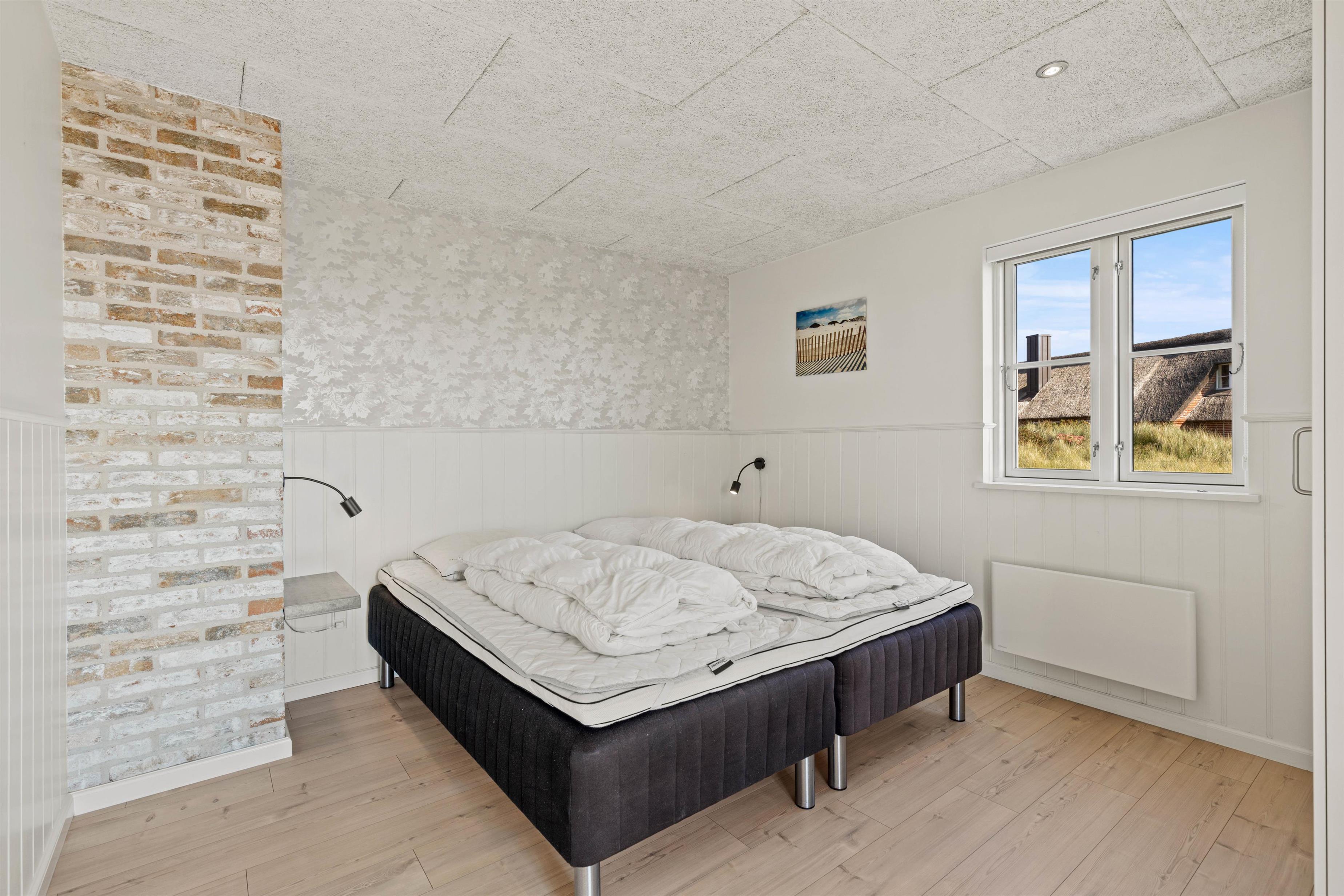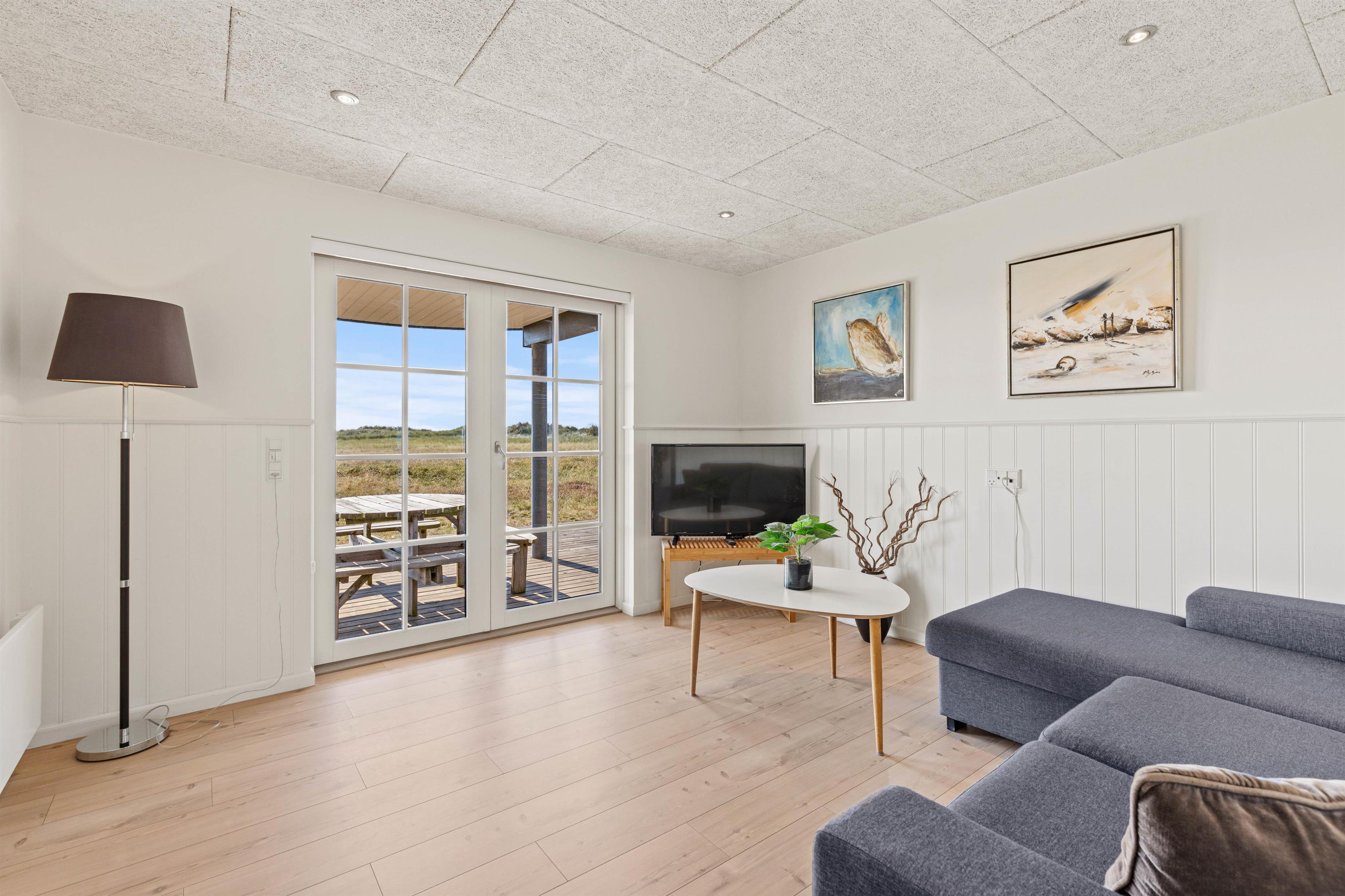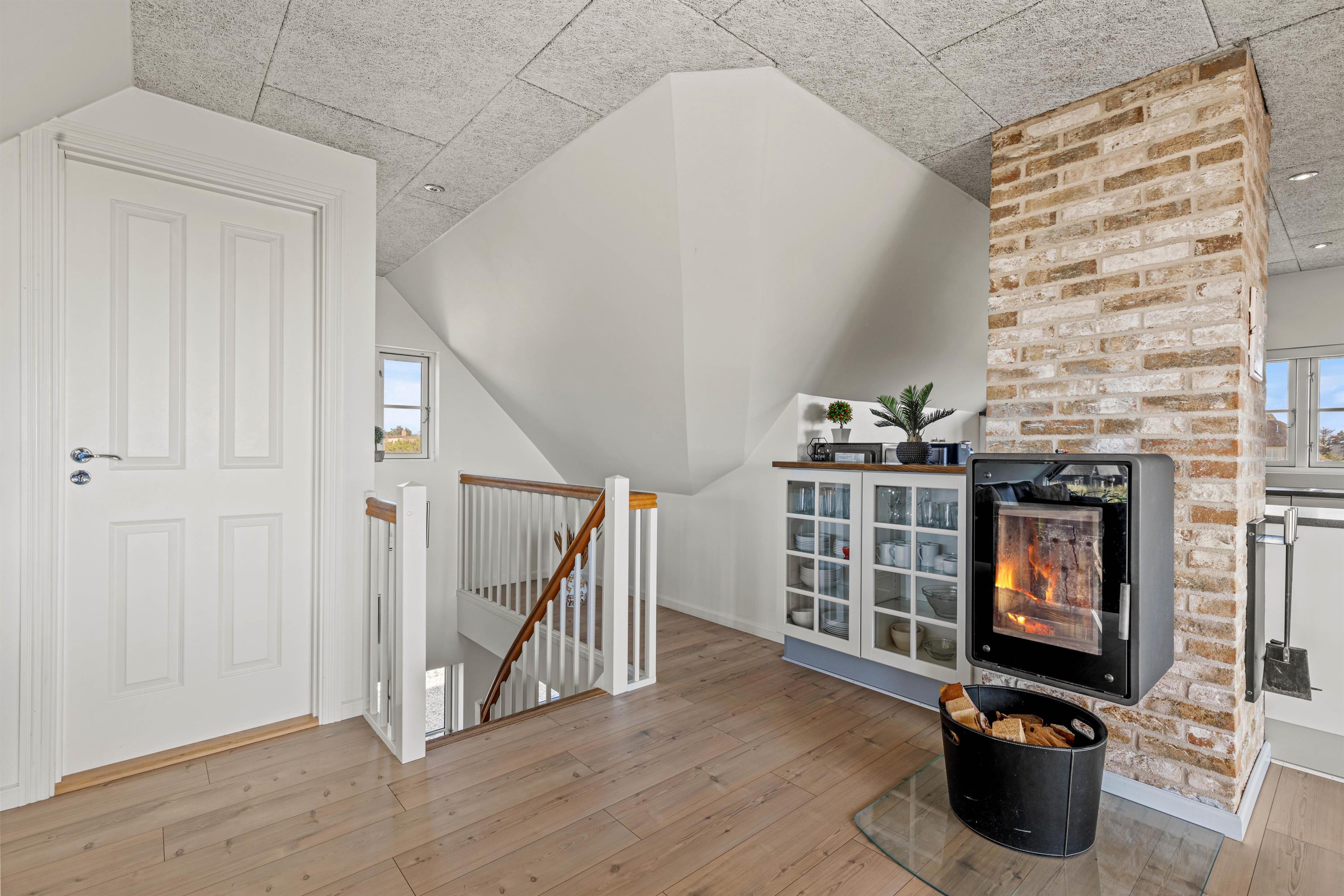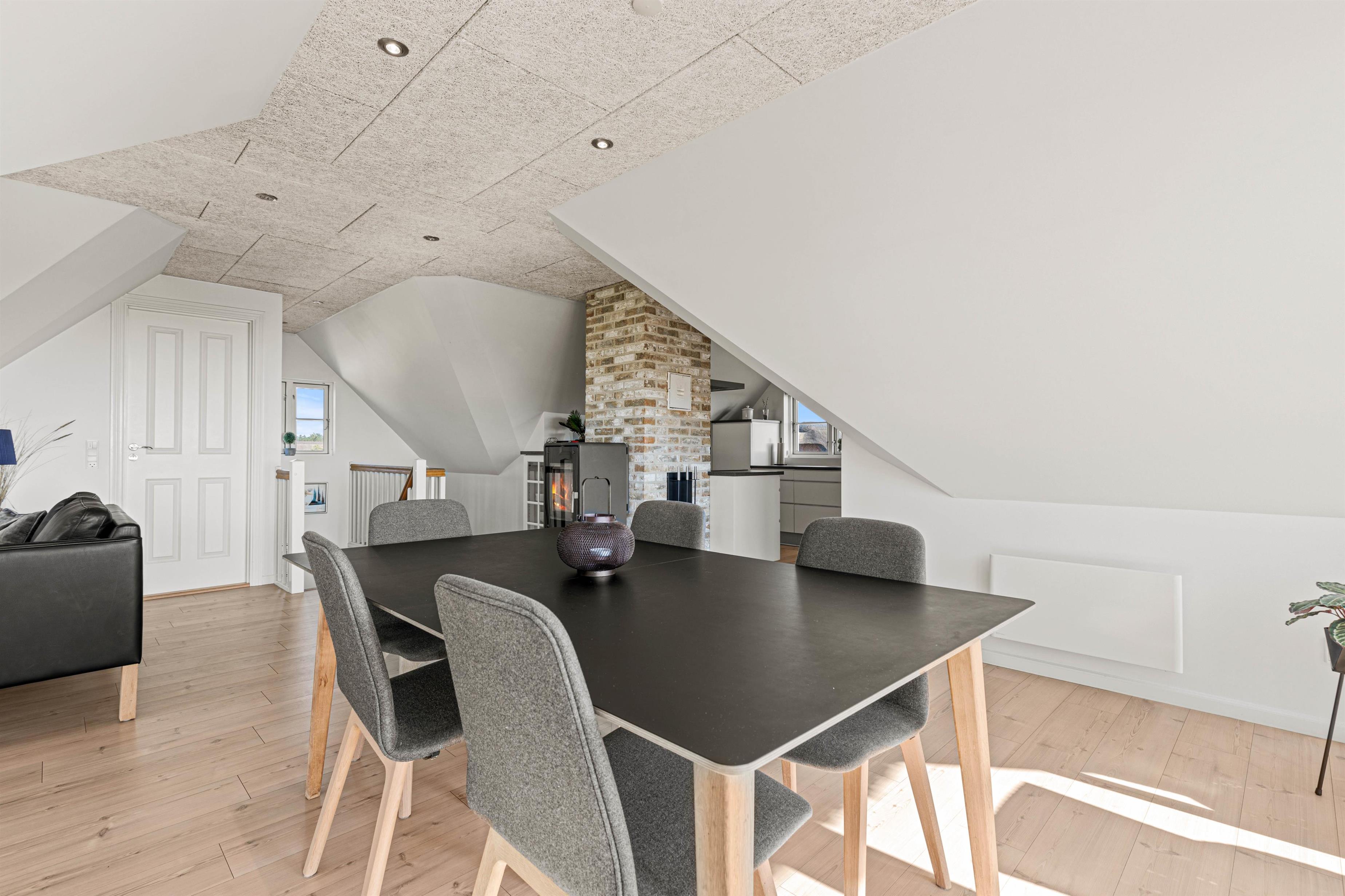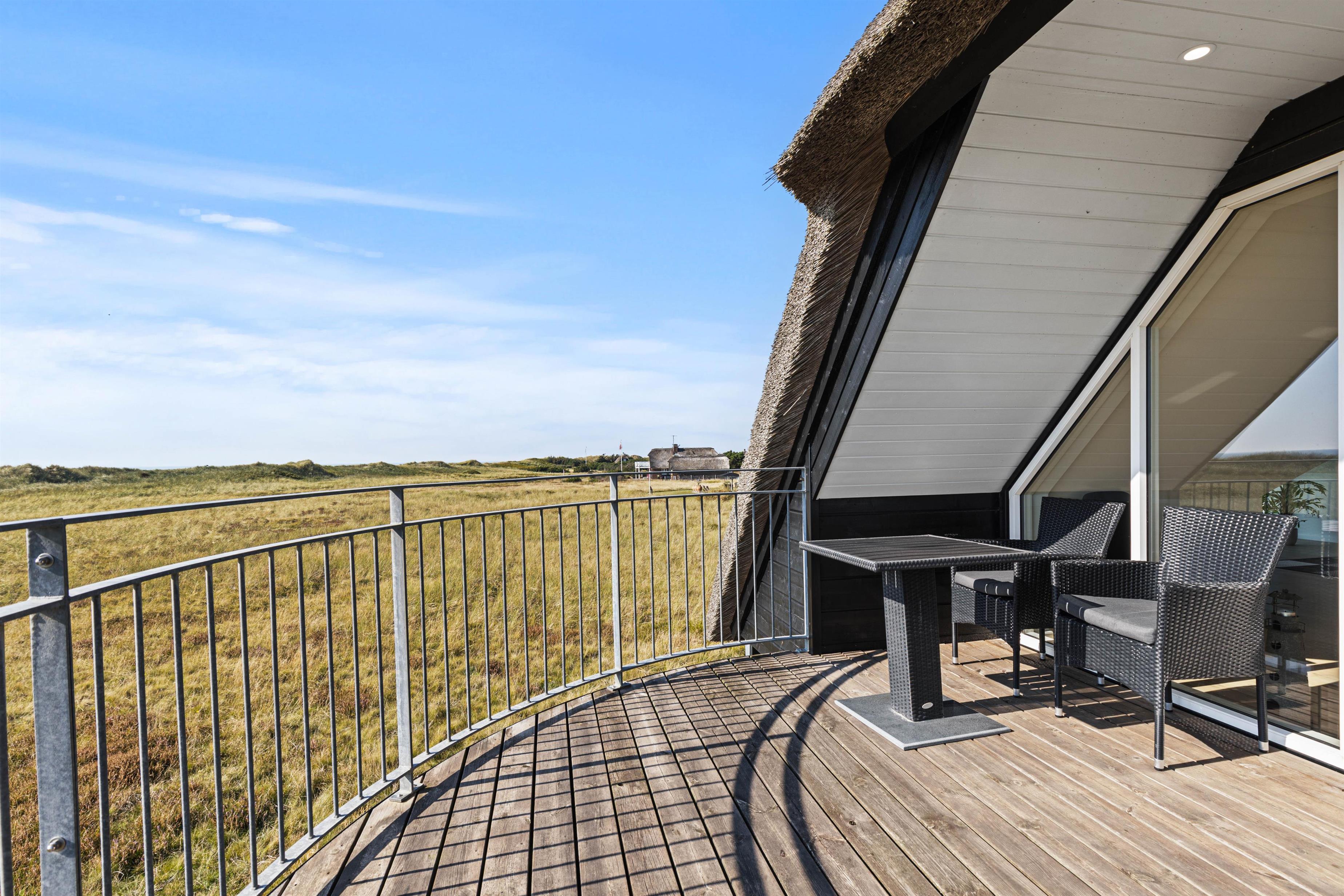 På 1. sal mødes I af den betagende udsigt over vand, sand og himmel helt til Horns Rev. Her kan I også nyde lækker feriemad tilberedt i det dejlige køkken, spille spil eller læse en god bog. Tæt på brændeovnen kan I slappe af i den lune stue på vilde regnvejrsdage eller iskolde vinterdage eller komme i zen på den store altan på solskinsdage.